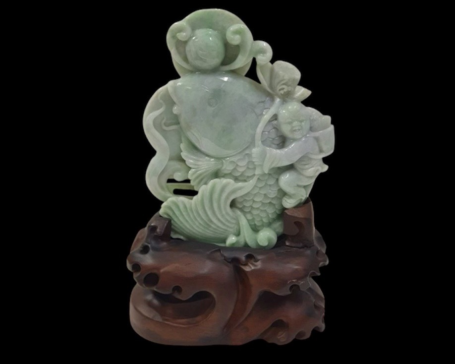 送禮禮物禮品 天然A貨翡翠雕件 富貴有餘 尺寸23x14x7cm 含木頭基座 證書 精美盒裝 店保卡