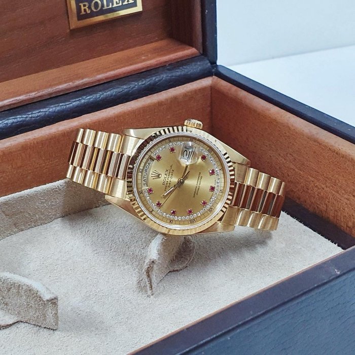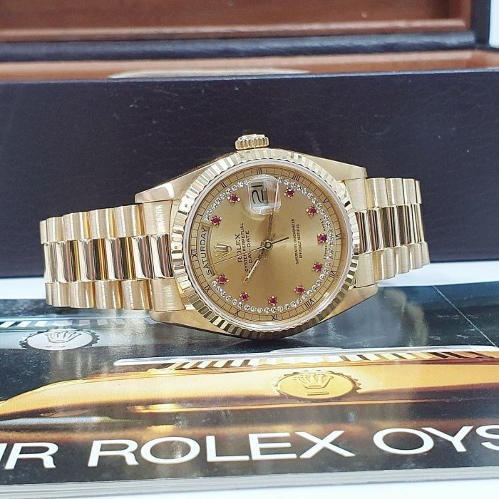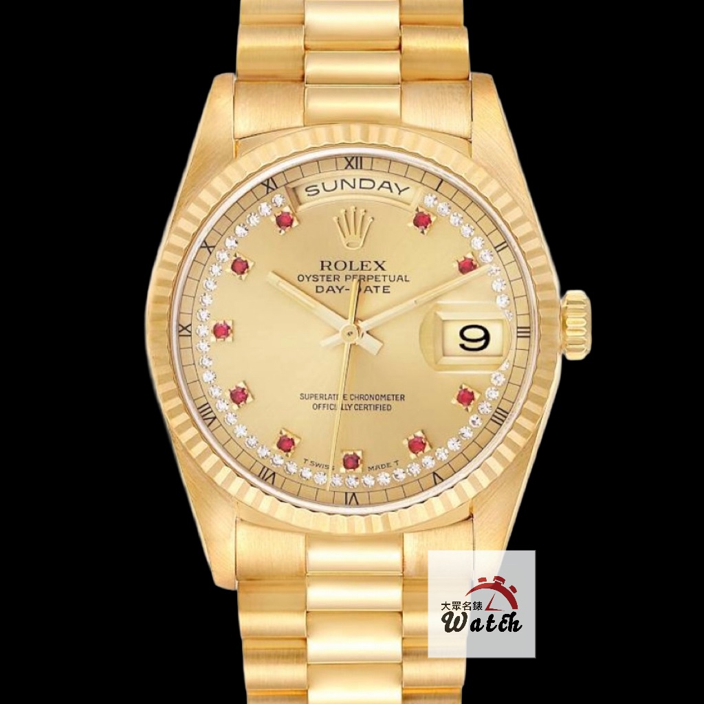 ROLEX 勞力士 18238 Day-Date 蠔式18K金 紅蟳錶 市場少見 小紅寶多層鑽面盤 錶徑36mm 自動上鍊 18K金材質 防水100米 E字頭 缺證書 原廠盒裝 店保卡 保養完成