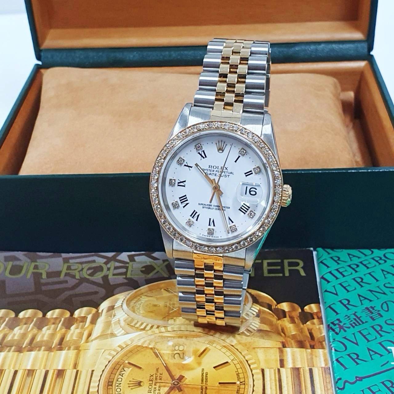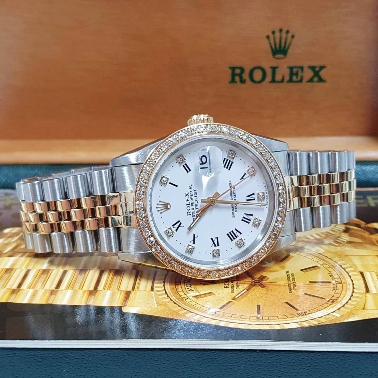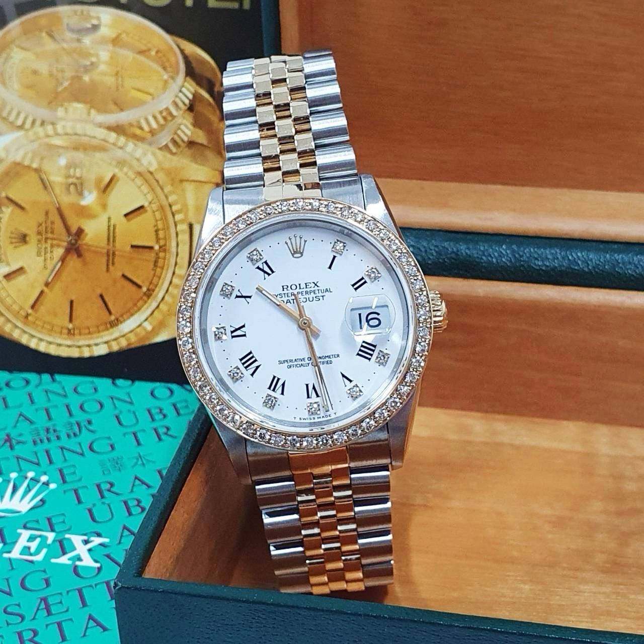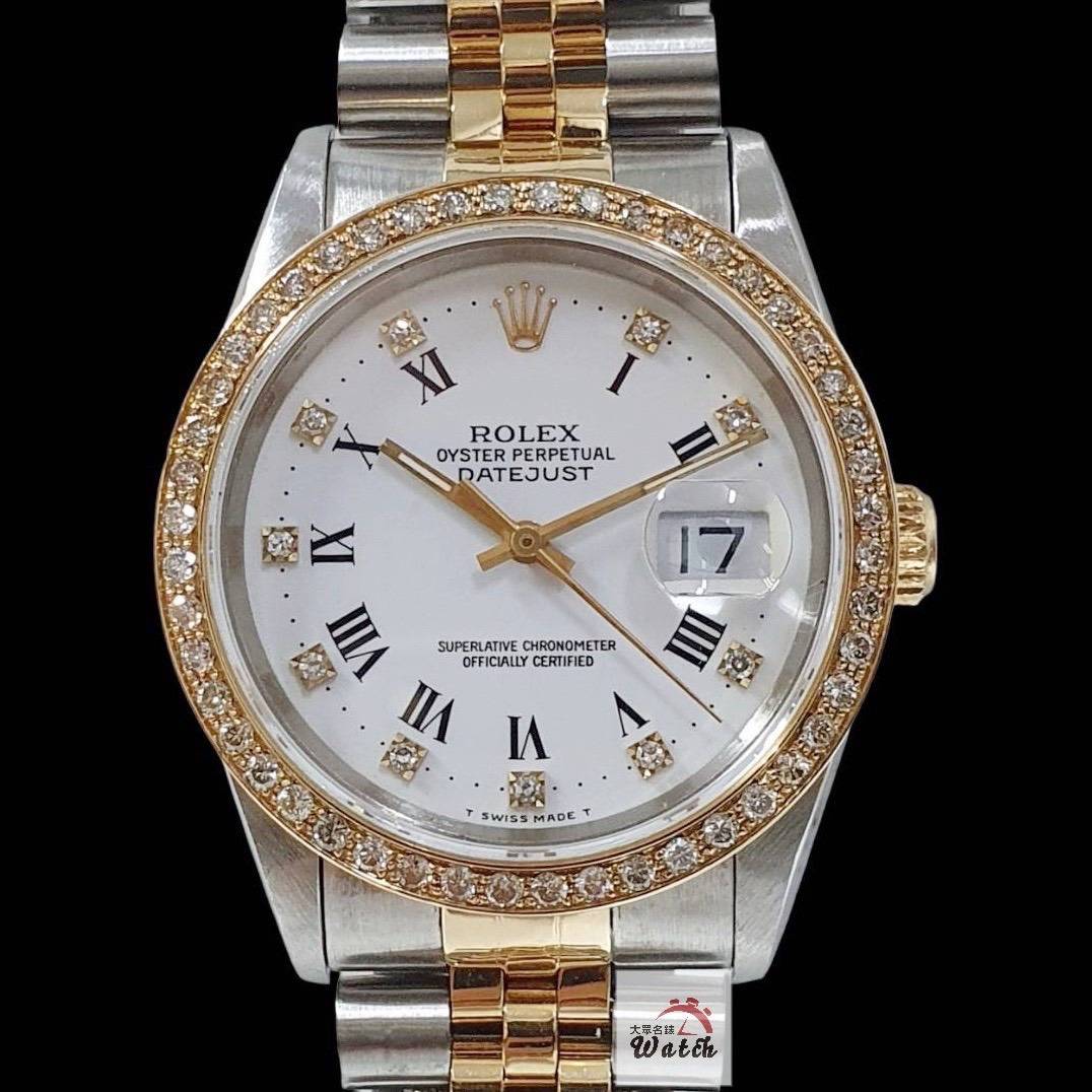 ROLEX 勞力士 16233 Datejust 蠔式日誌 台灣AD 後加鑽圈 白羅馬十鑽面盤 錶徑36mm 自動上鍊 18K金及不鏽鋼 防水100米 E字頭 原廠盒 店保卡 缺證書 保養完成