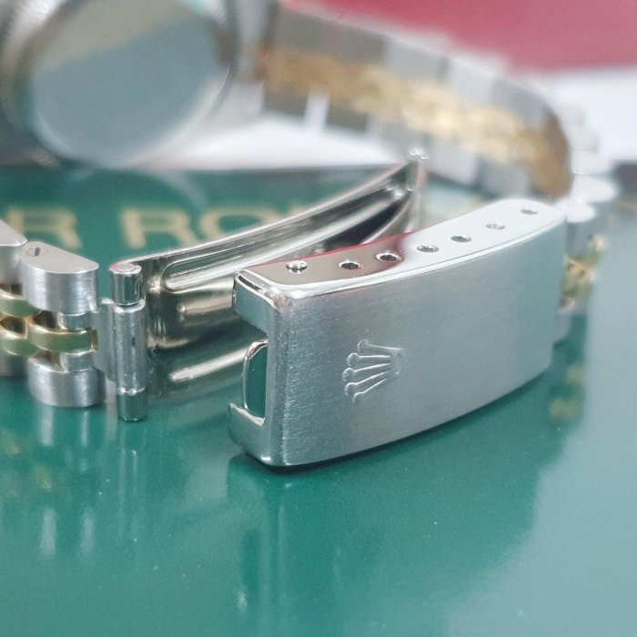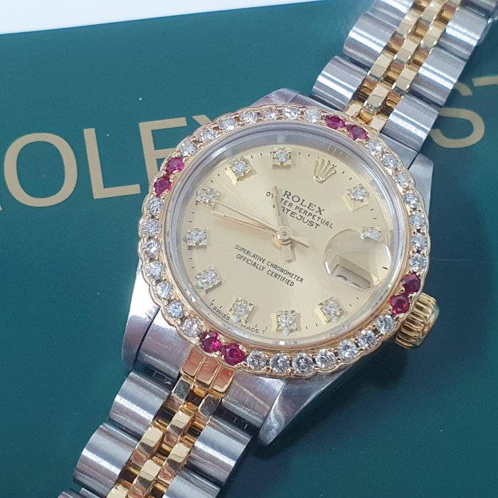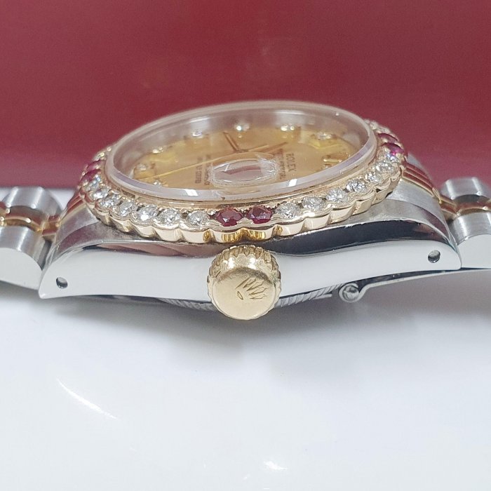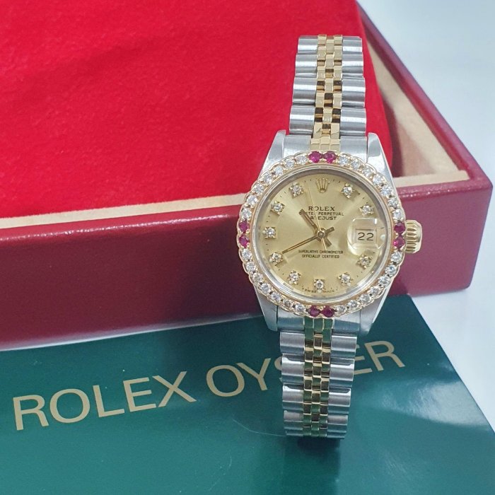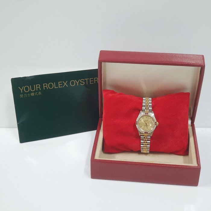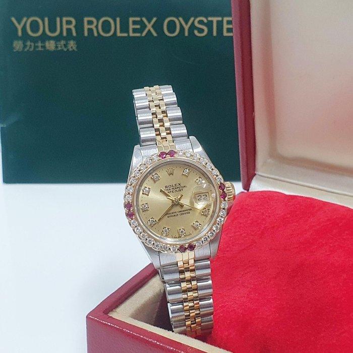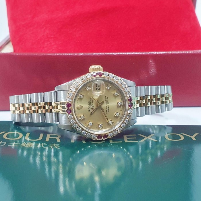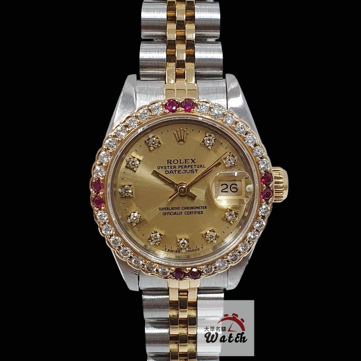 ROLEX勞力士 69173 Datejust 蠔式女錶 日誌型 金色十鑽面盤 後加紅寶石鑽圈 錶徑26mm 自動上鍊 18K金及不鏽鋼 防水100米 E字頭 原廠盒 保養完成