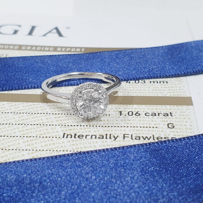 GIA鑽石女戒 G色 IF 內含物完美無暇 主鑽1.06克拉 PT950白金鑽石戒台 配鑽約0.22ct 國際圍12.8號 面寬0.95cm 總重1.57錢 GIA證書 精美盒裝