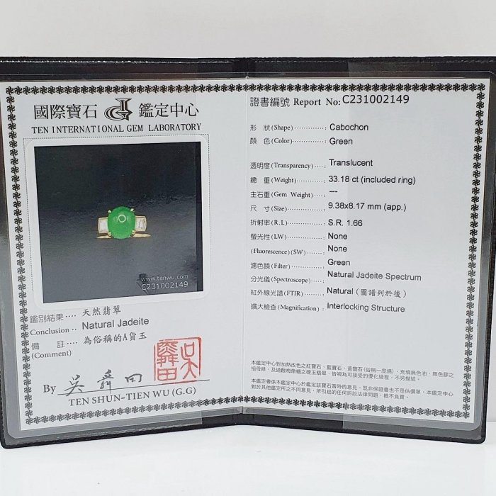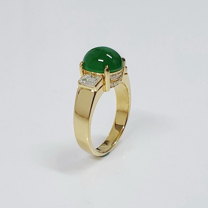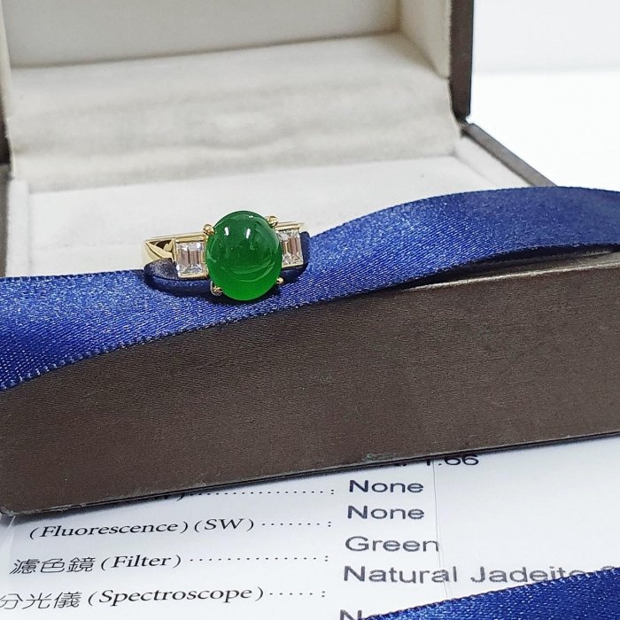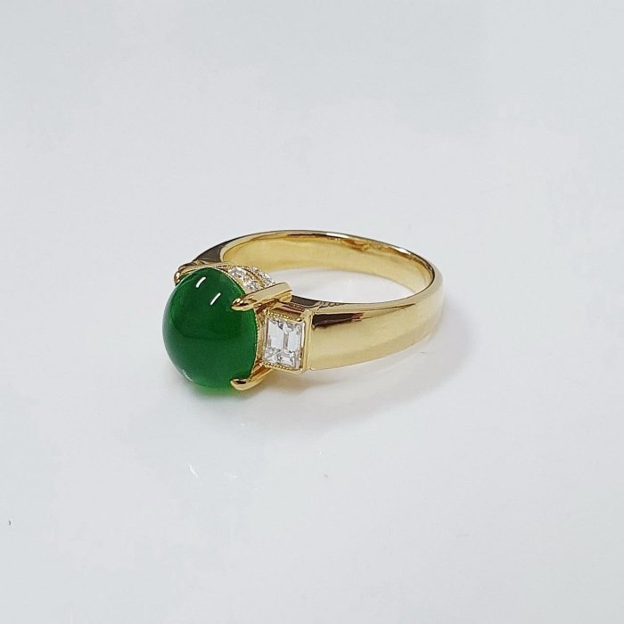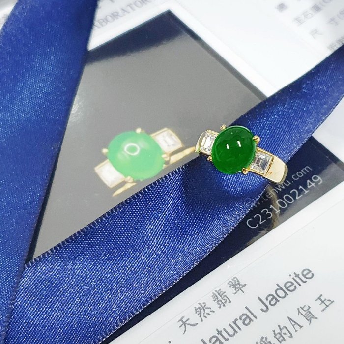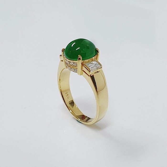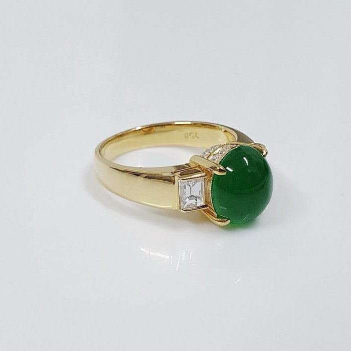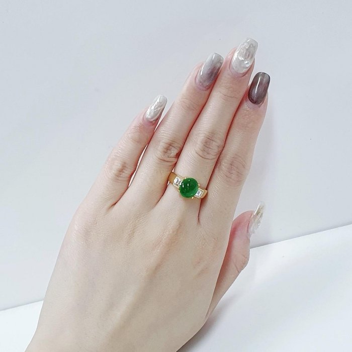 天然翡翠A貨戒指 滿綠翡翠 正陽綠 水頭飽滿 玉石9.38x8.17mm 750K金鑽石台 配鑽約0.56ct 國際圍10號 面寬0.95cm 總重1.73錢 附證書 精美盒裝