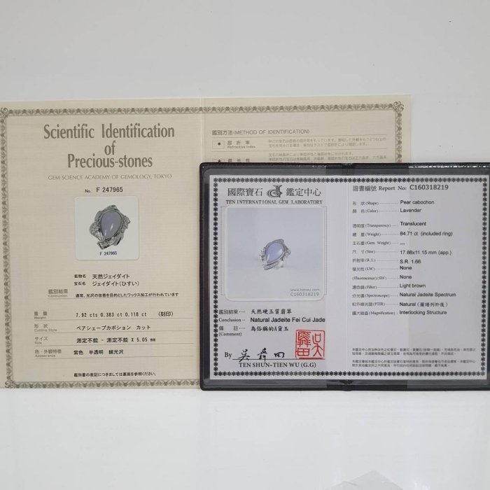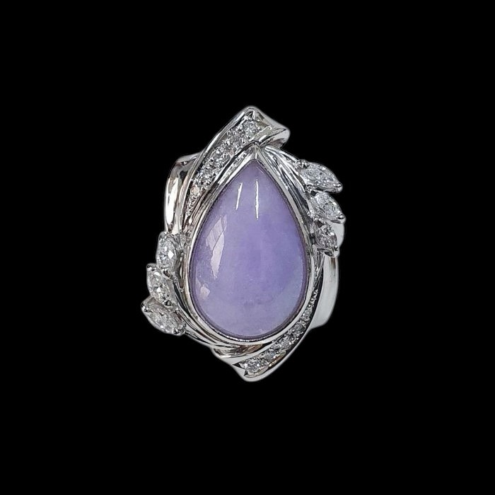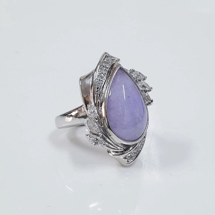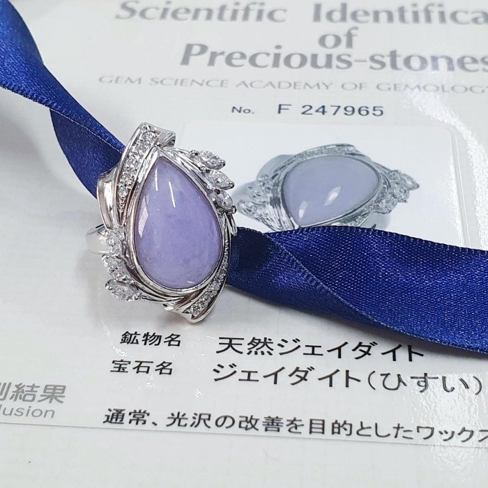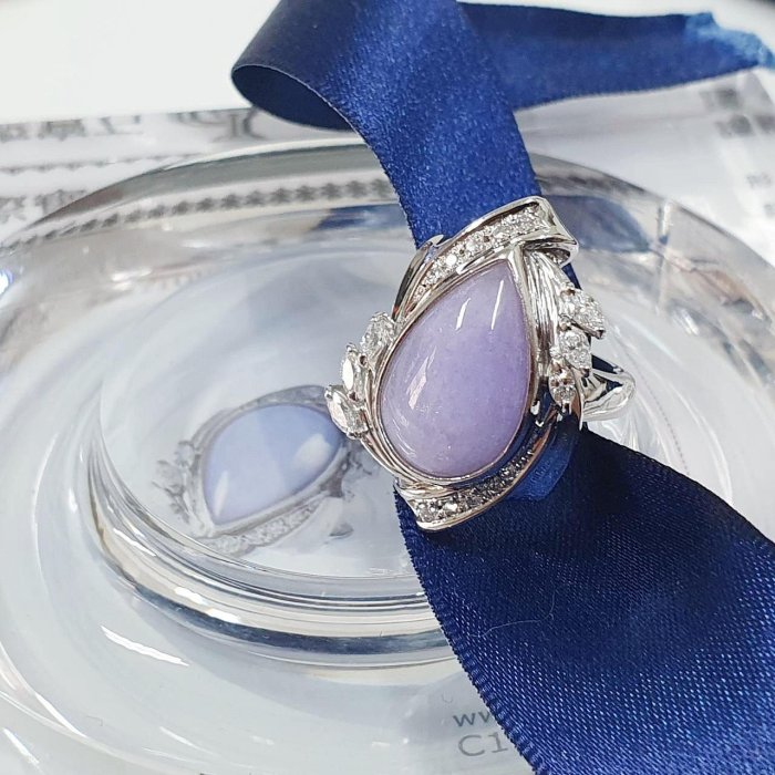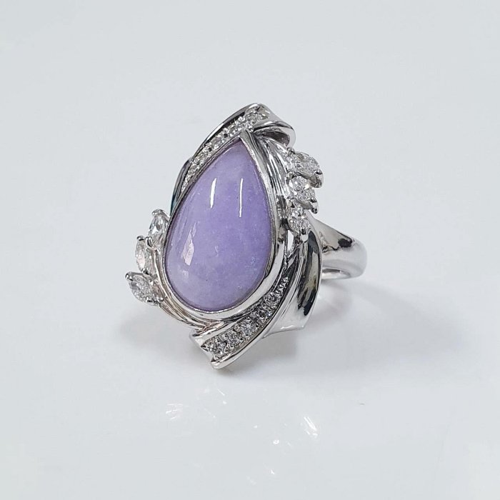天然紫翡翠玉戒 梨型 大方設計款 翡翠1.7x1.5cm PT900鑽石戒台 配鑽約60分 國際圍11號 面寬2.7cm 重4.5錢 證書 精美盒裝 店保卡