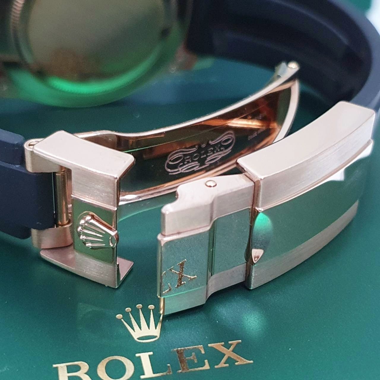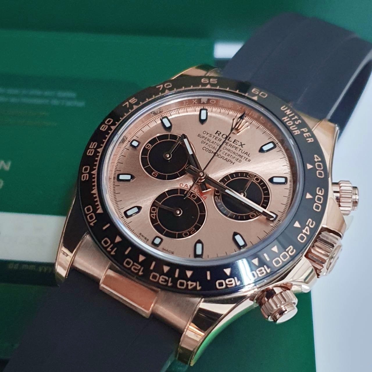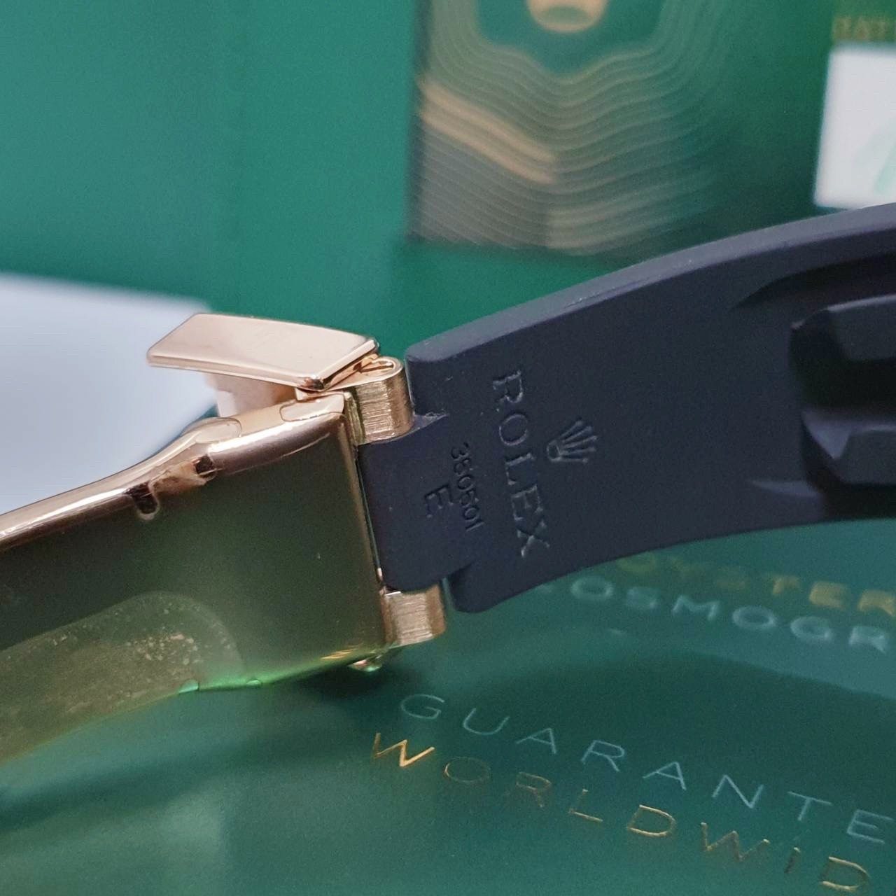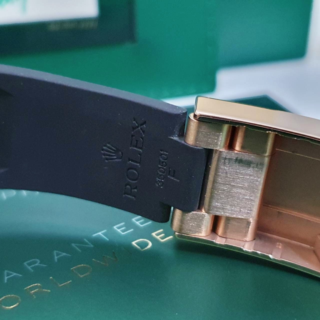 18K玫瑰金錶殼、摺疊扣、旋入式錶冠、黑色陶瓷視距儀刻度錶框 / 粉色面盤黑陶瓷圈面盤 / 夜光指針及立體夜光時標 / 原廠黑色Oysterflex橡膠錶帶 / 藍寶 石水晶玻璃鏡面 |
