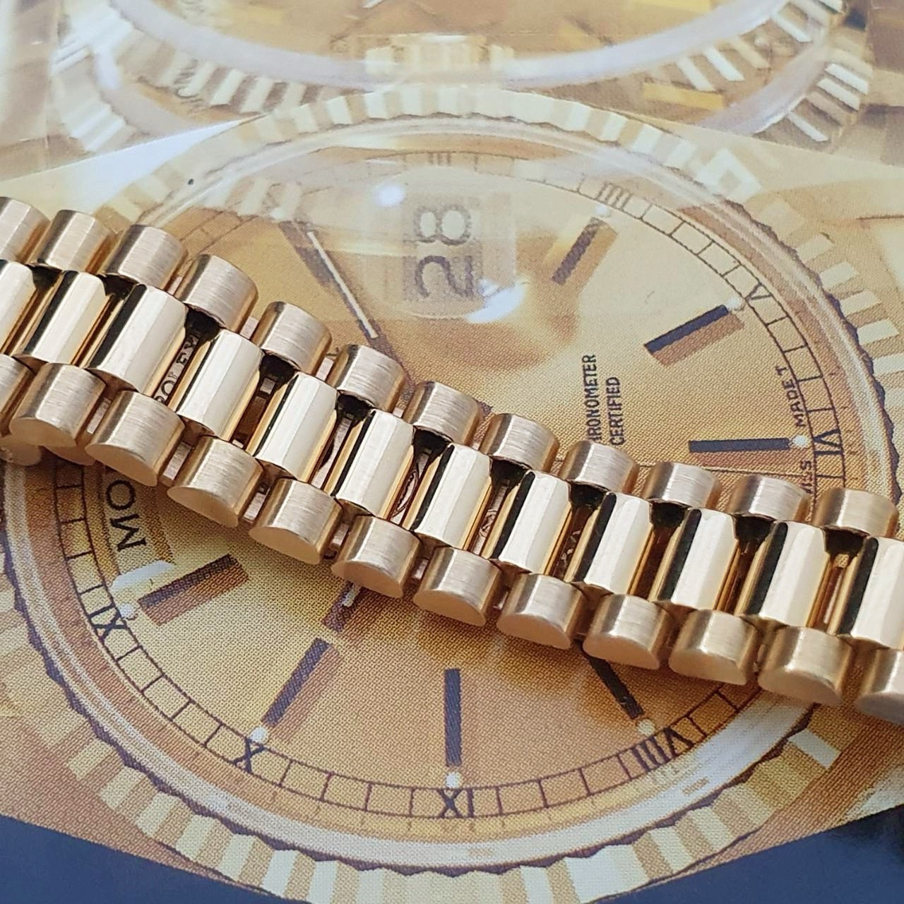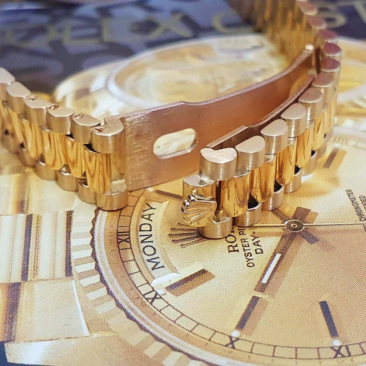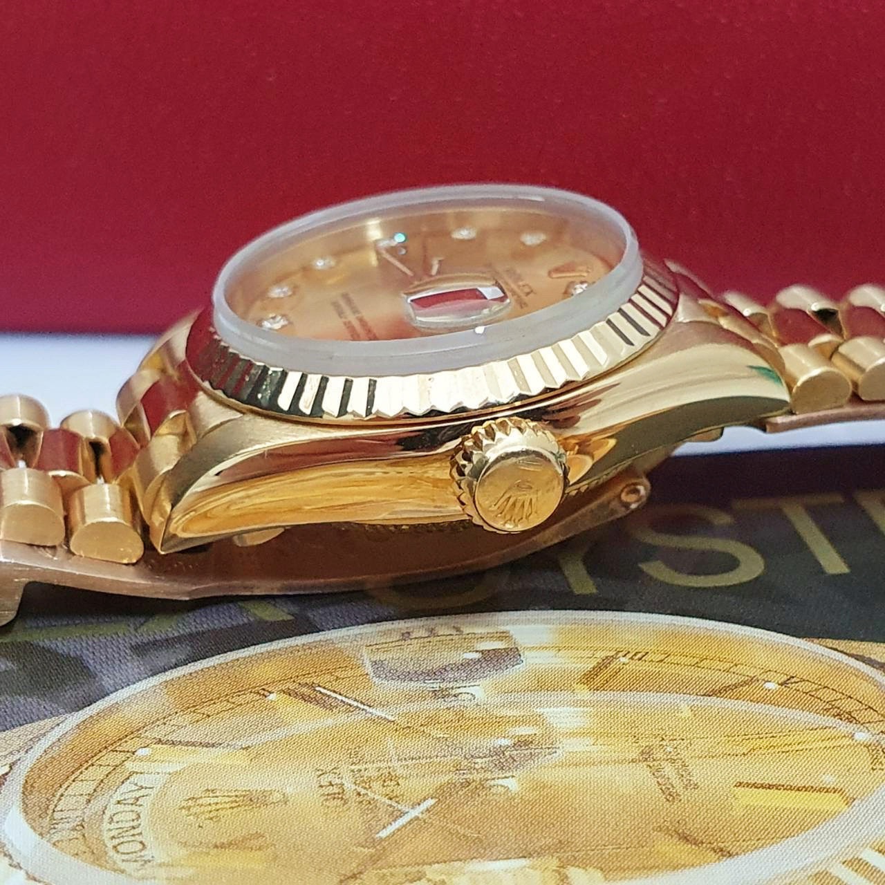18K黃金材質錶殼、錶鍊帶及單邊折疊帶扣 / 黃金色面盤 / 原廠鑲嵌鑽石時標 / 旋入式錶冠 / 藍寶石水晶玻璃鏡面 |