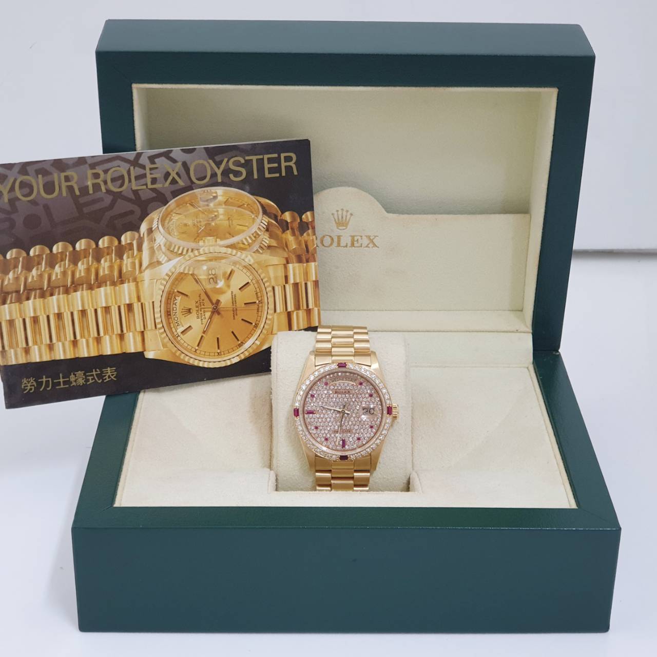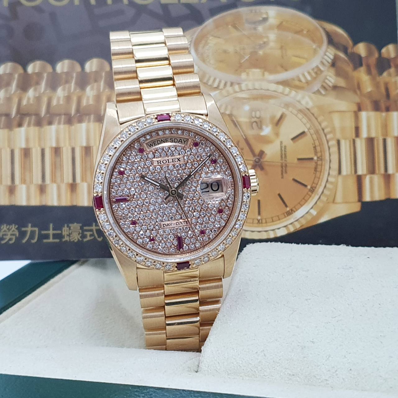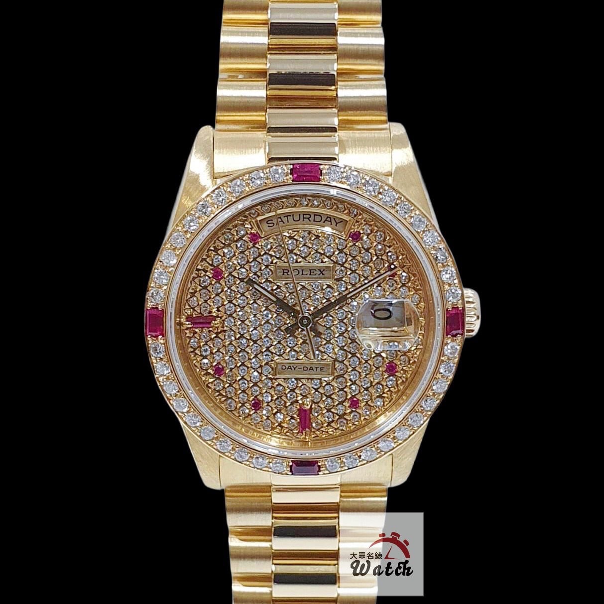 ROLEX 勞力士18238 Day-Date 18K金 後加滿天星紅寶石面盤 後加紅寶石鑽圈 錶徑36mm 自動上鍊 18K金材質 防水100米 E字頭 缺證書 原廠盒裝 店保卡 保養完成