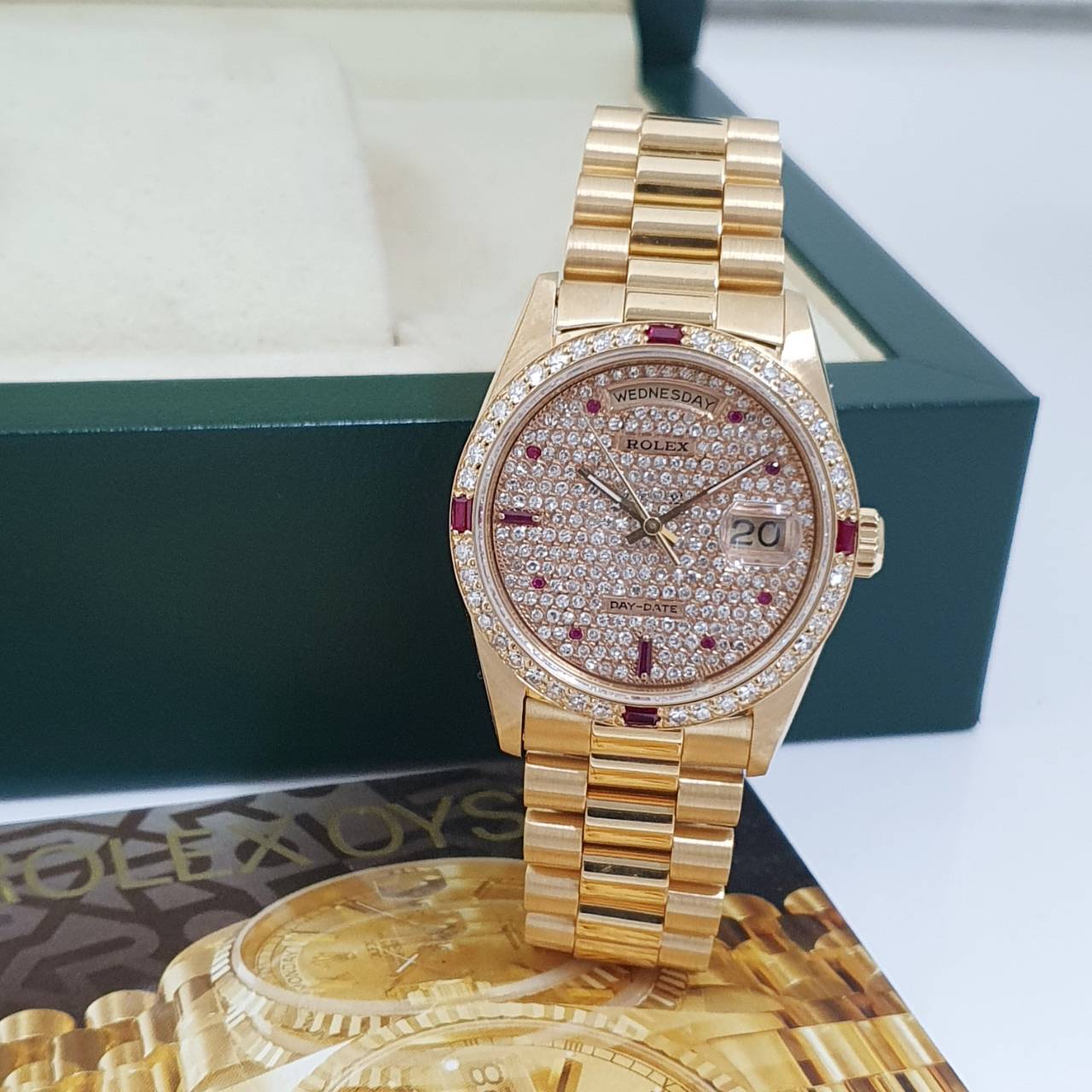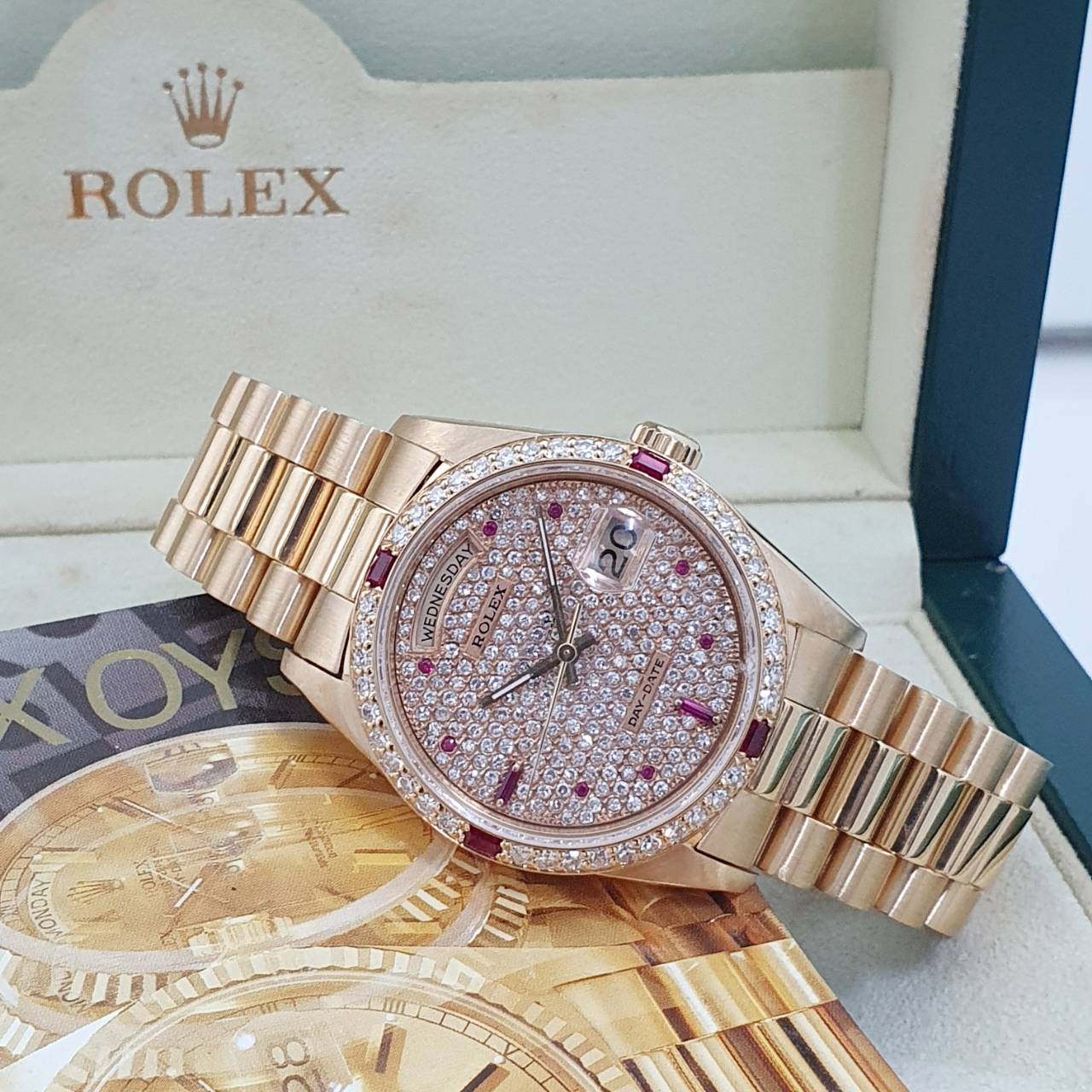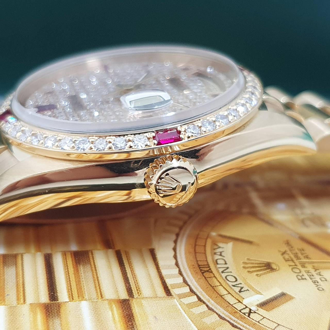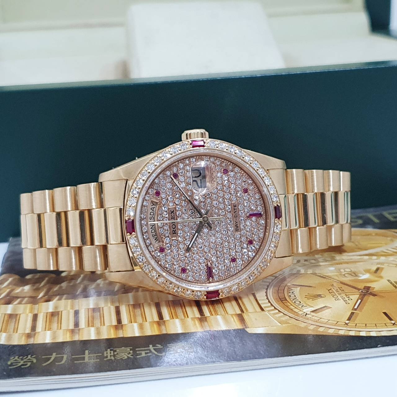 ROLEX 勞力士18238 Day-Date 18K金 後加滿天星紅寶石面盤 後加紅寶石鑽圈 錶徑36mm 自動上鍊 18K金材質 防水100米 E字頭 缺證書 原廠盒裝 店保卡 保養完成
