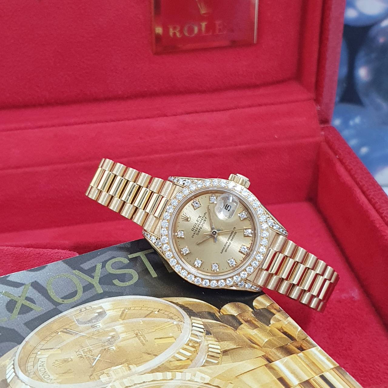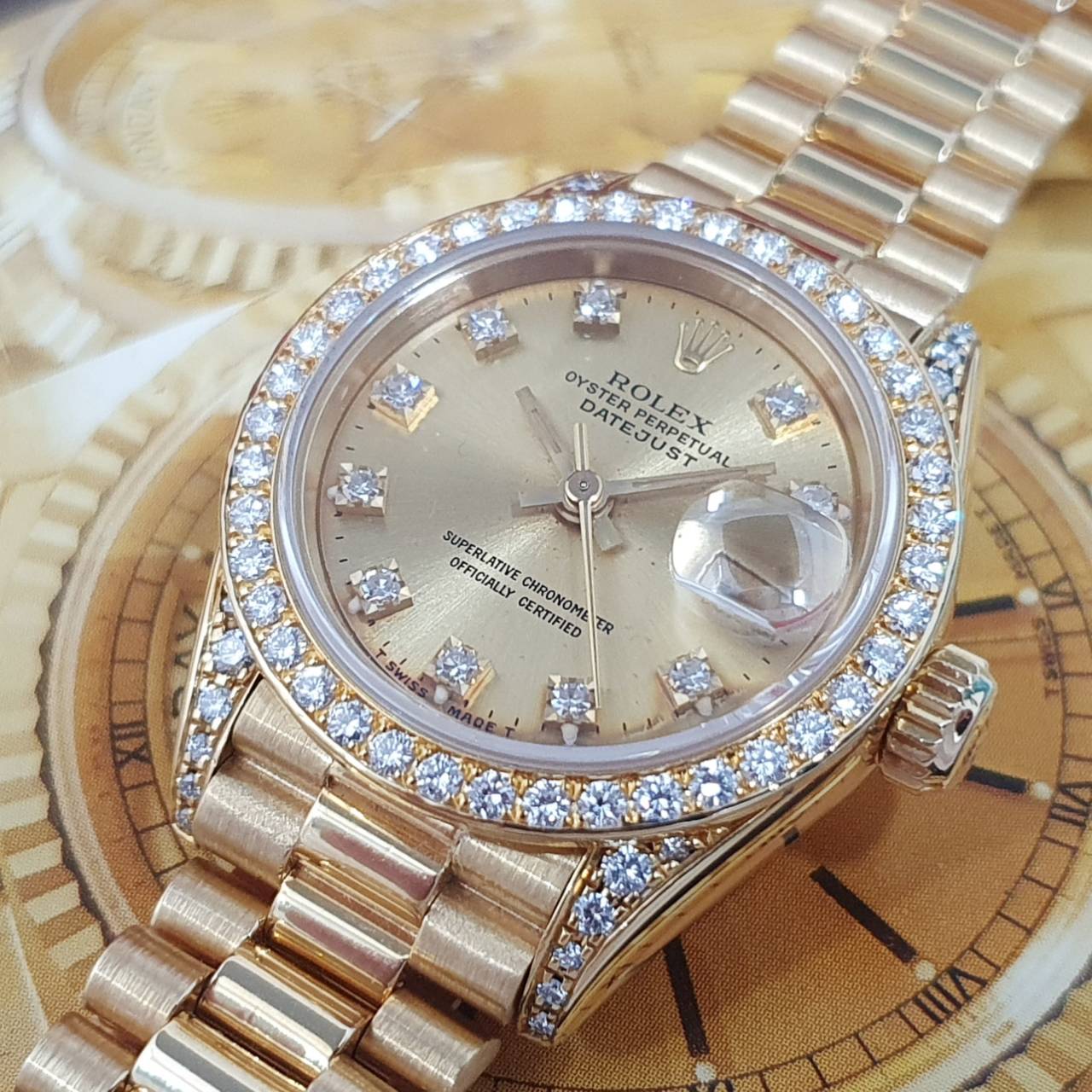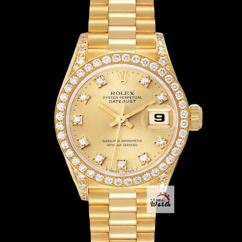 ROLEX 勞力士69158 Datejust 18K金蠔式女錶 原廠鑽石錶圈/鑽腳 金色十鑽面盤 錶徑26mm 自動上鍊 18K金材質 防水100米 N字頭 缺證書 原廠盒裝 保養完成