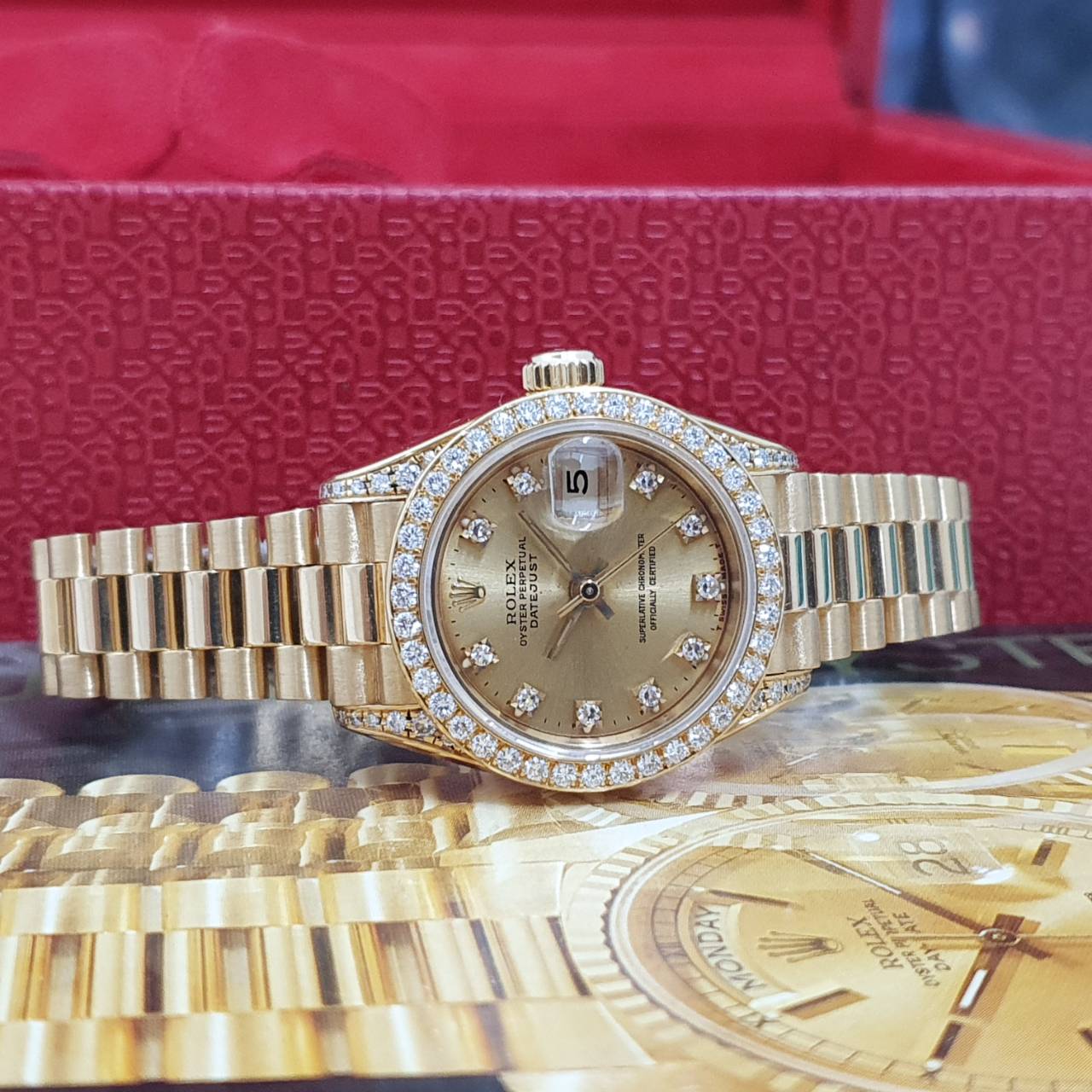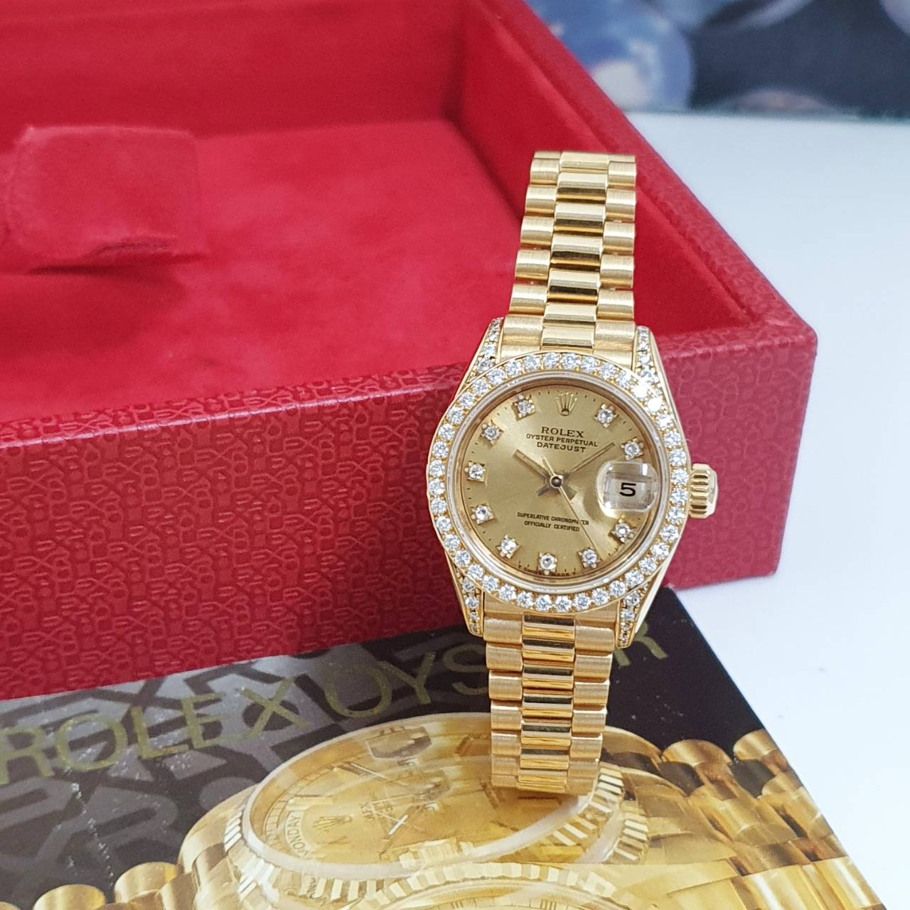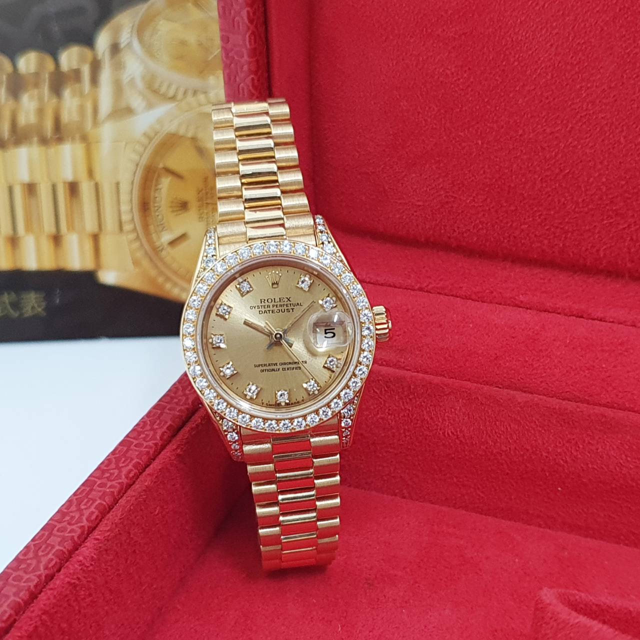 ROLEX 勞力士69158 Datejust 18K金蠔式女錶 原廠鑽石錶圈/鑽腳 金色十鑽面盤 錶徑26mm 自動上鍊 18K金材質 防水100米 N字頭 缺證書 原廠盒裝 保養完成