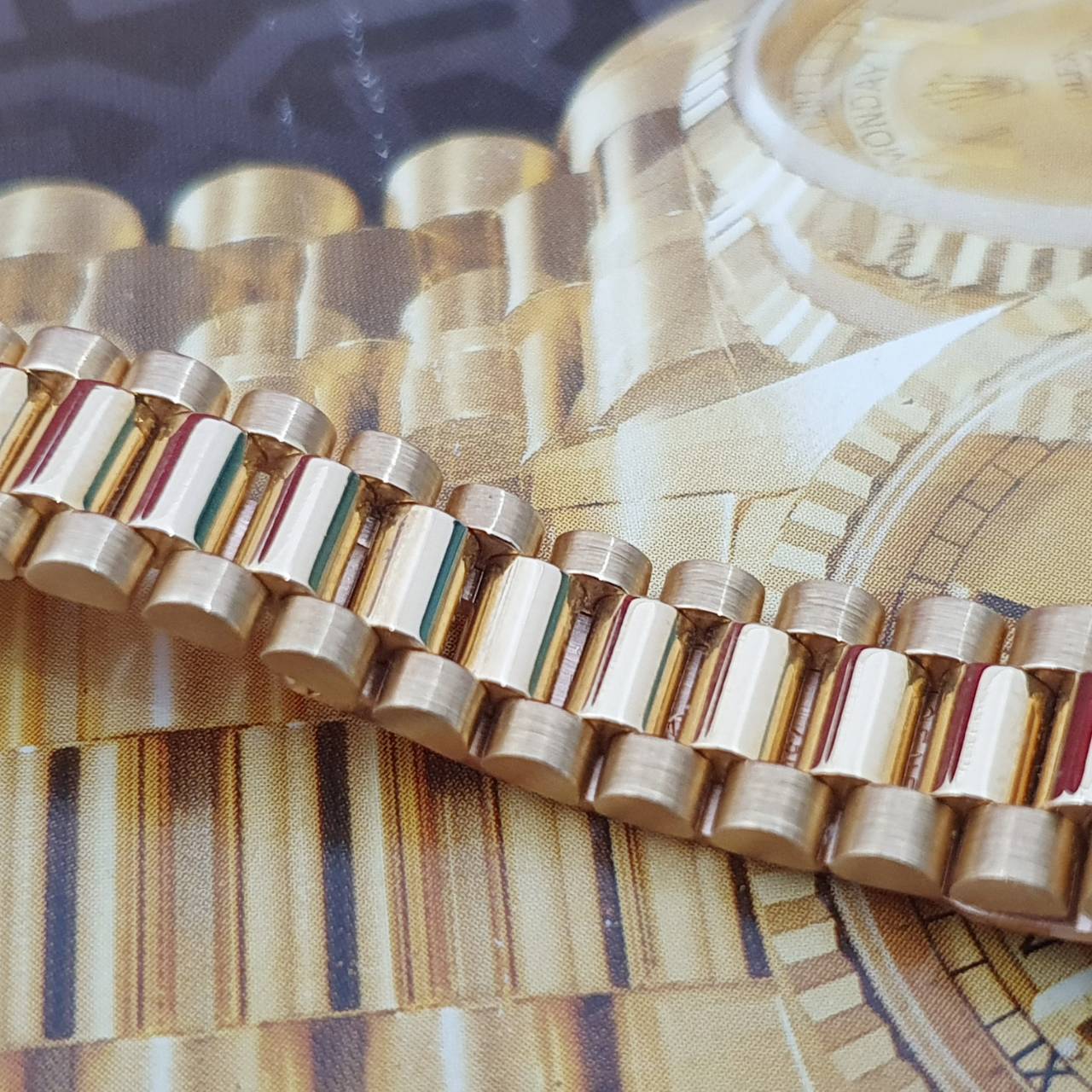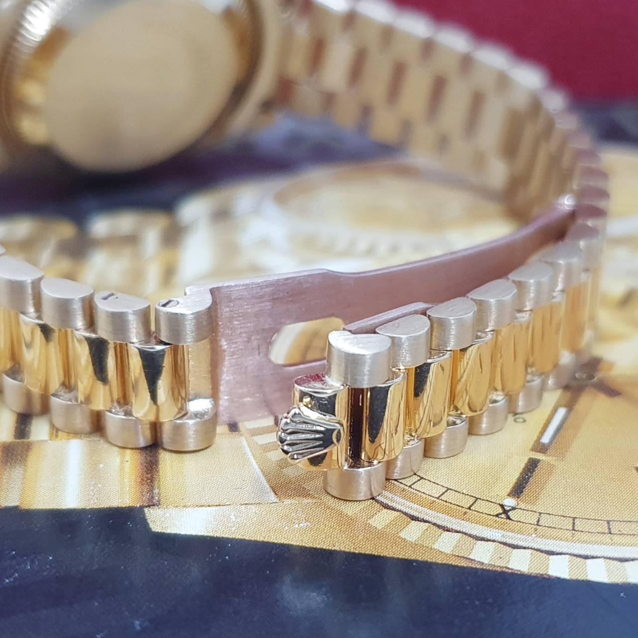 材質: 18K黃金材質錶殼、錶鍊帶及單邊折疊帶扣 / 金色十鑽面盤 / 原廠鑽石錶圈、鑽腳 / 旋入式錶冠 / 藍寶石水晶玻璃鏡面