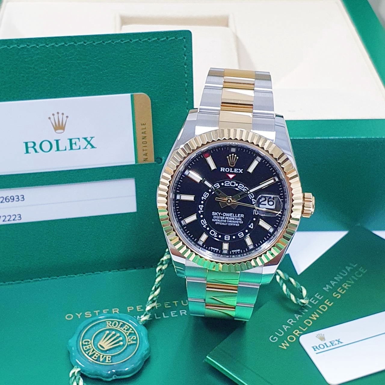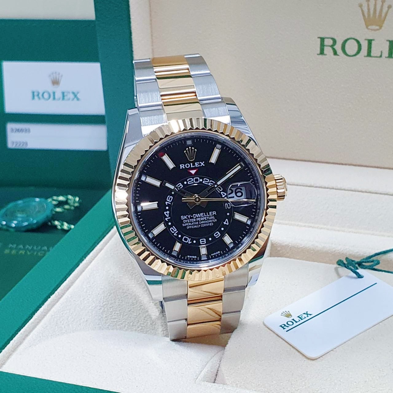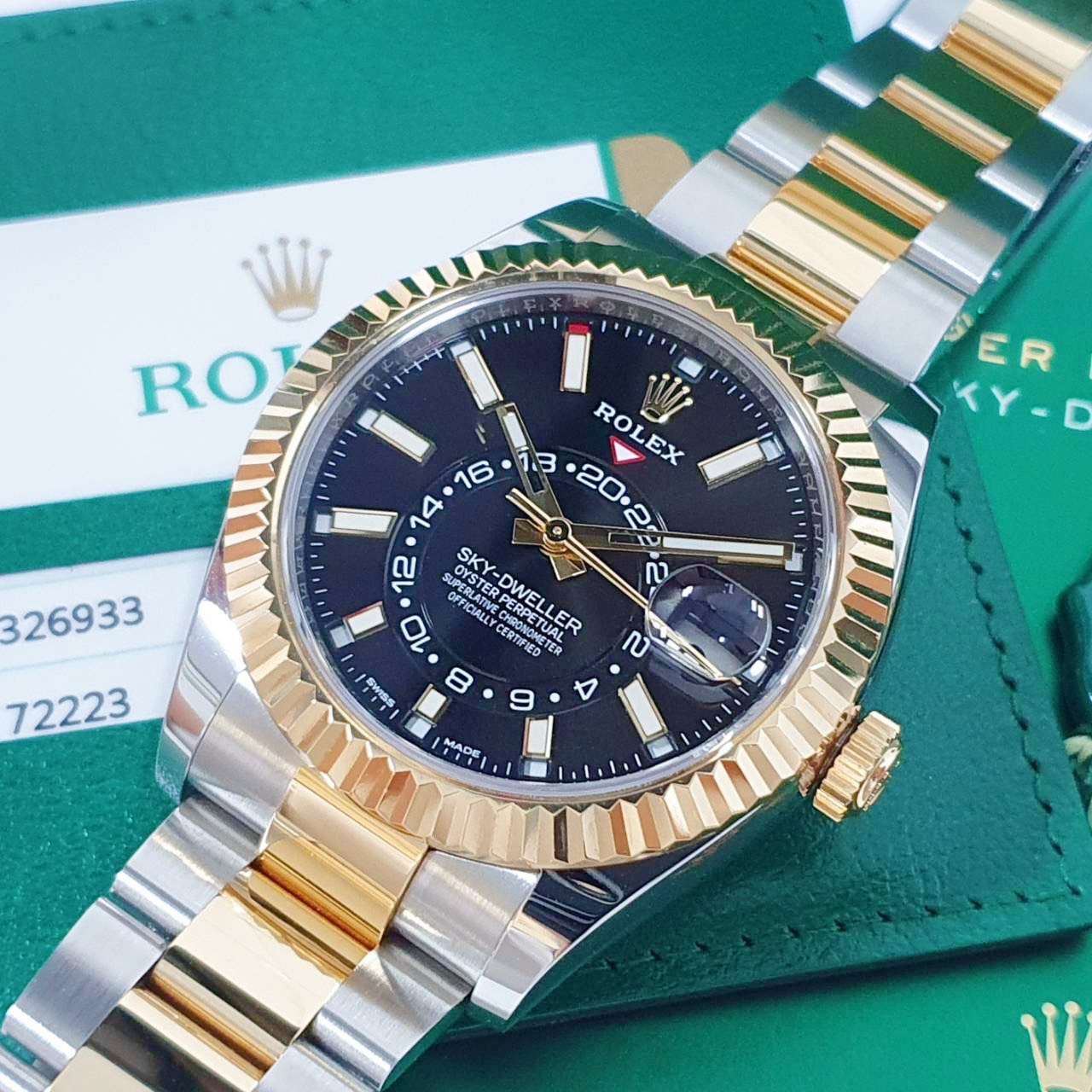ROLEX 勞力士 326933 Sky-Dweller 天行者 2019/09全配件 黑面天行者 半金款 三版帶 錶扣原廠膠膜 年曆功能 月份顯示 兩地時區 錶徑42mm 自動上鍊 18K金及不鏽鋼 防水100米 原廠全配件 保養完成