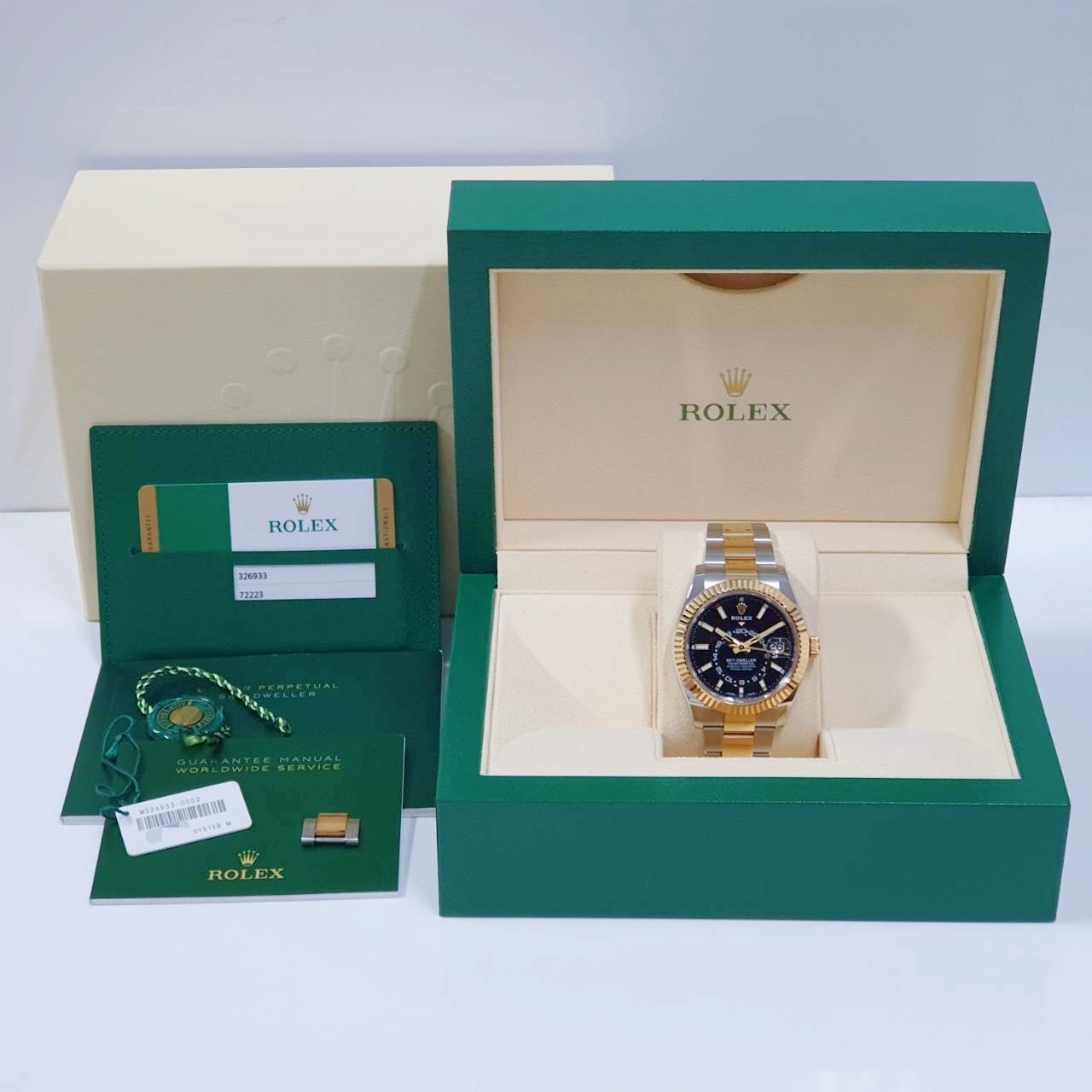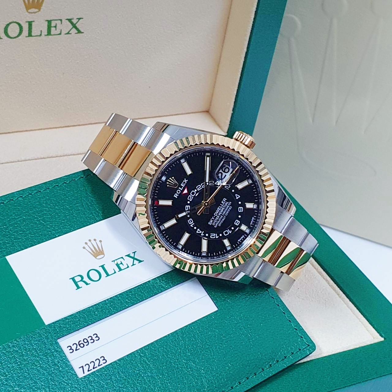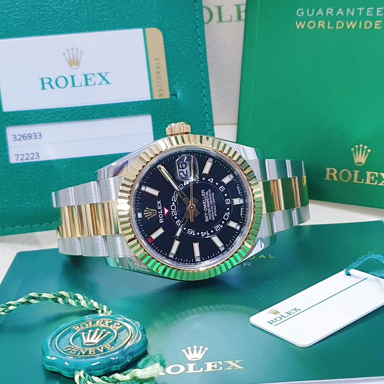 ROLEX 勞力士 326933 Sky-Dweller 天行者 2019/09全配件 黑面天行者 半金款 三版帶 錶扣原廠膠膜 年曆功能 月份顯示 兩地時區 錶徑42mm 自動上鍊 18K金及不鏽鋼 防水100米 原廠全配件 保養完成