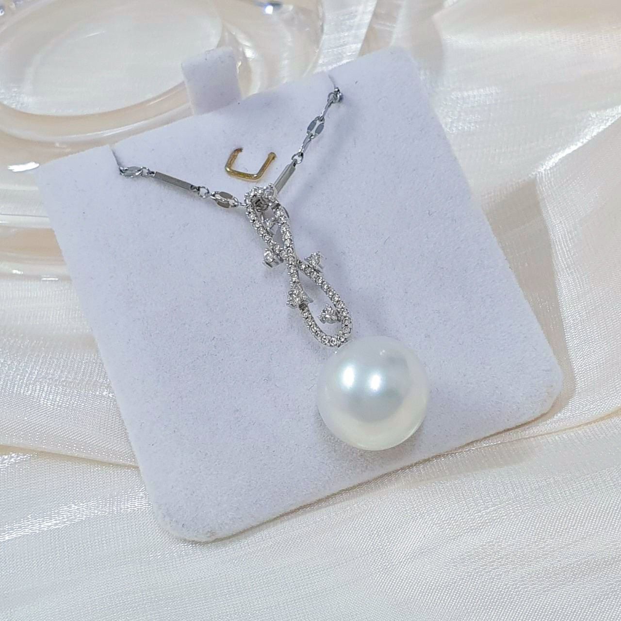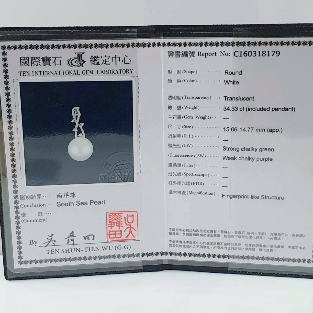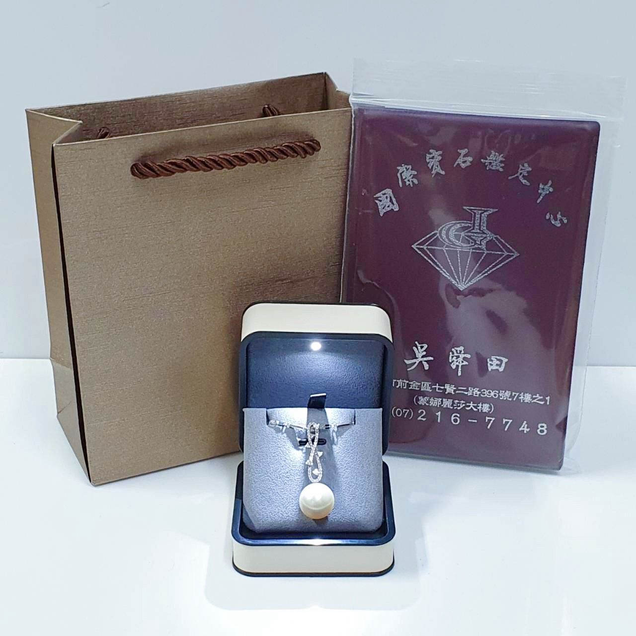 全新品 天然珍珠項鍊 珍珠15mm 偏粉色 配鑽約0.37ct 墜4.3x0.6cm 18K金墜台 墜重1.83錢 附不鏽鋼鍊 證書 精美盒裝