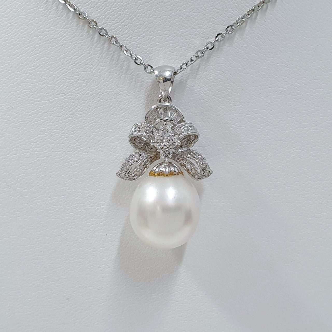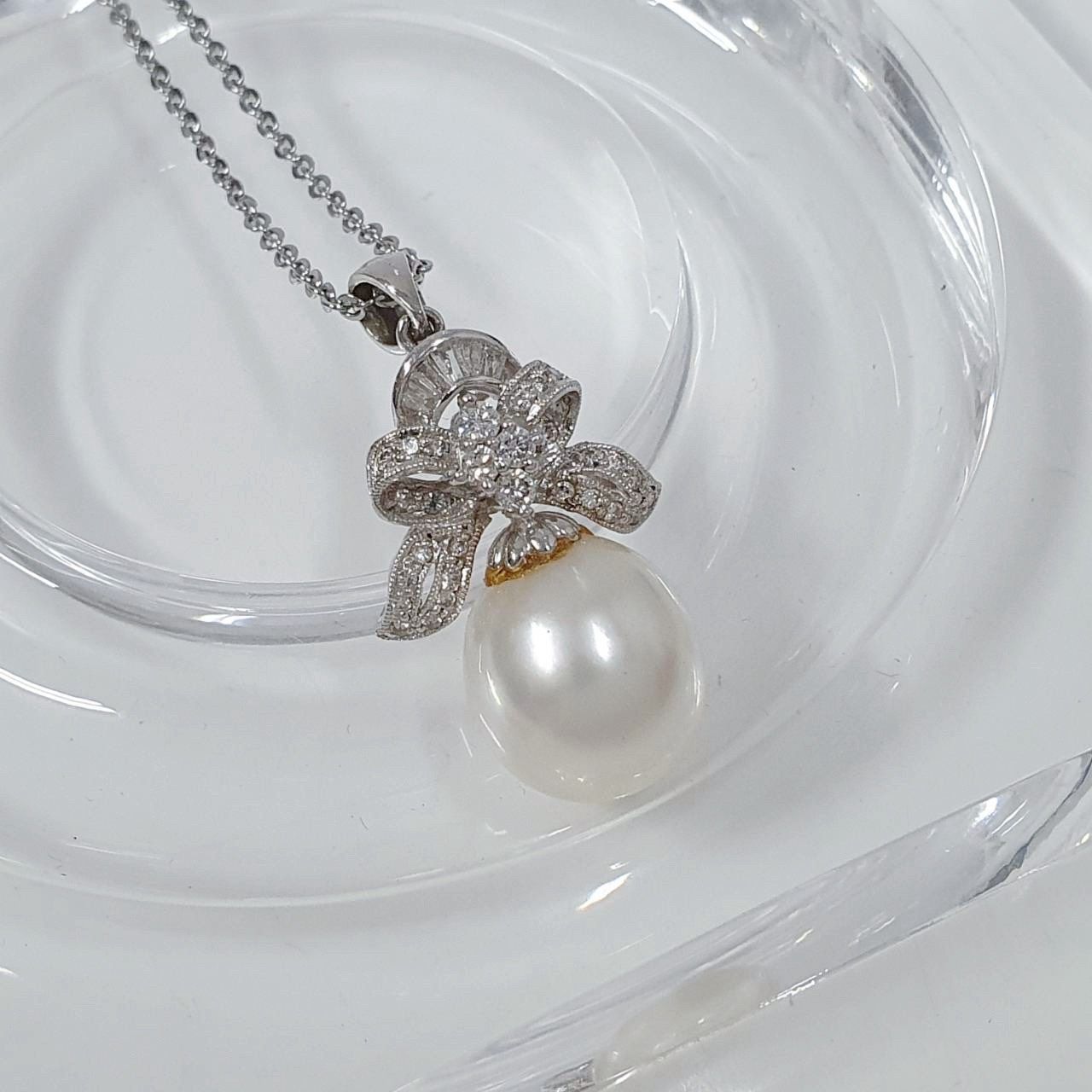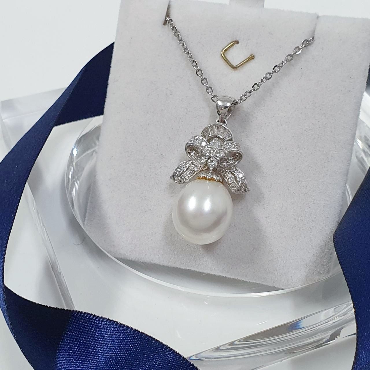 全新品 天然南洋珍珠墜 蝴蝶結造型 珍珠14.5mm 配鑽約0.60ct 寬3.4x1.8cm 18K金墜台 墜重1.8錢 附不鏽鋼鍊 精美盒裝