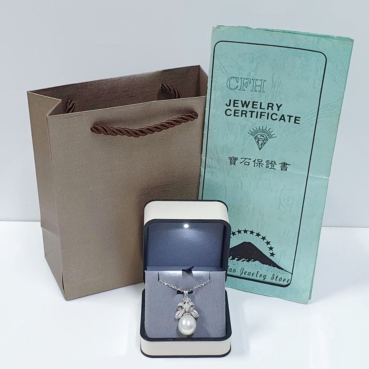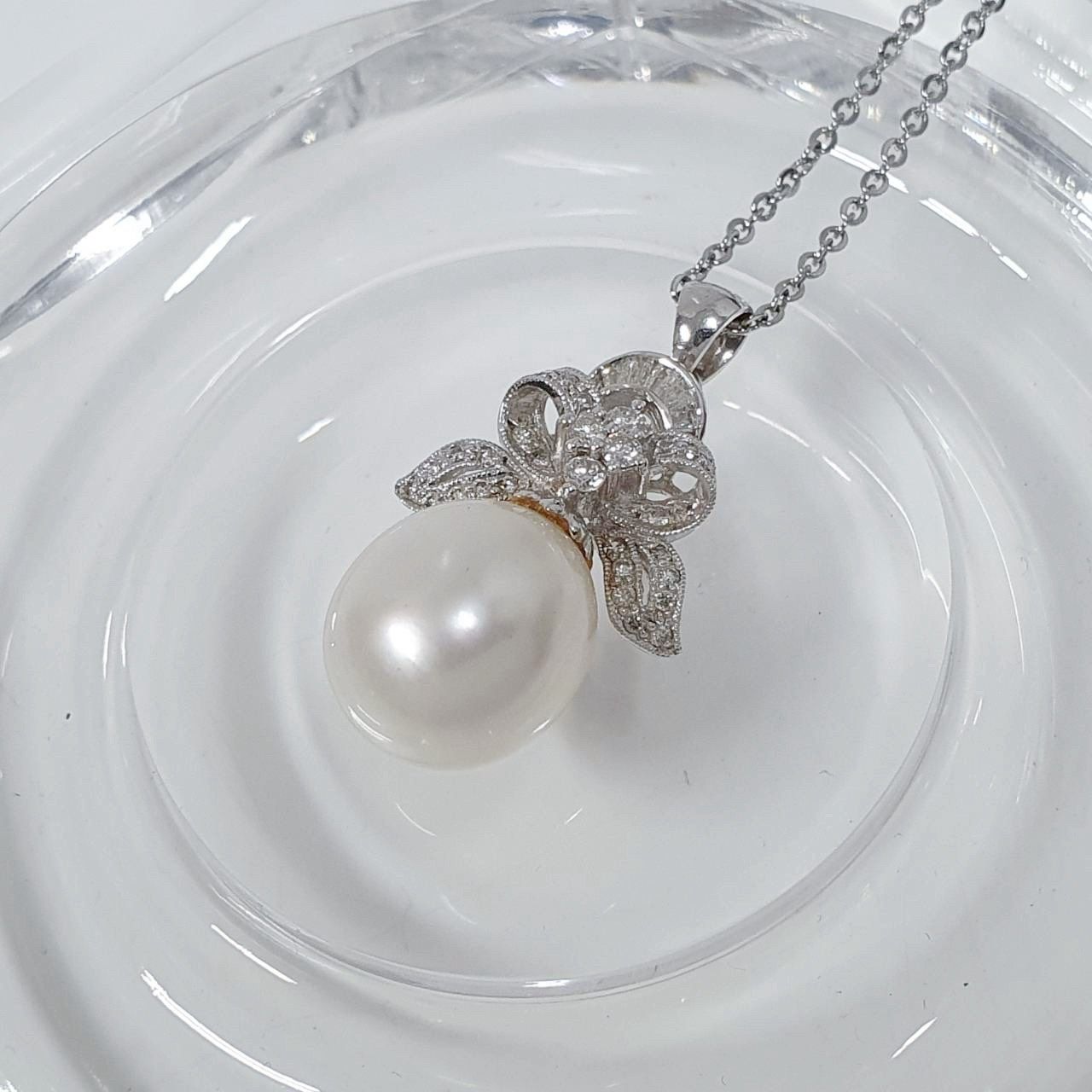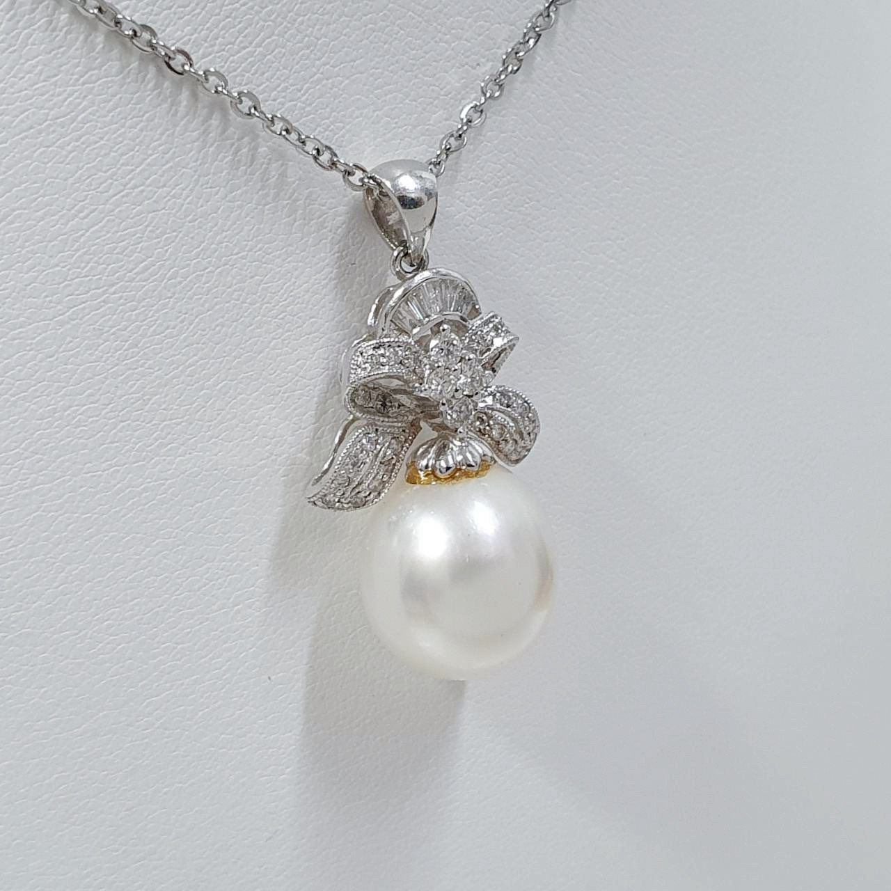 全新品 天然南洋珍珠墜 蝴蝶結造型 珍珠14.5mm 配鑽約0.60ct 寬3.4x1.8cm 18K金墜台 墜重1.8錢 附不鏽鋼鍊 精美盒裝