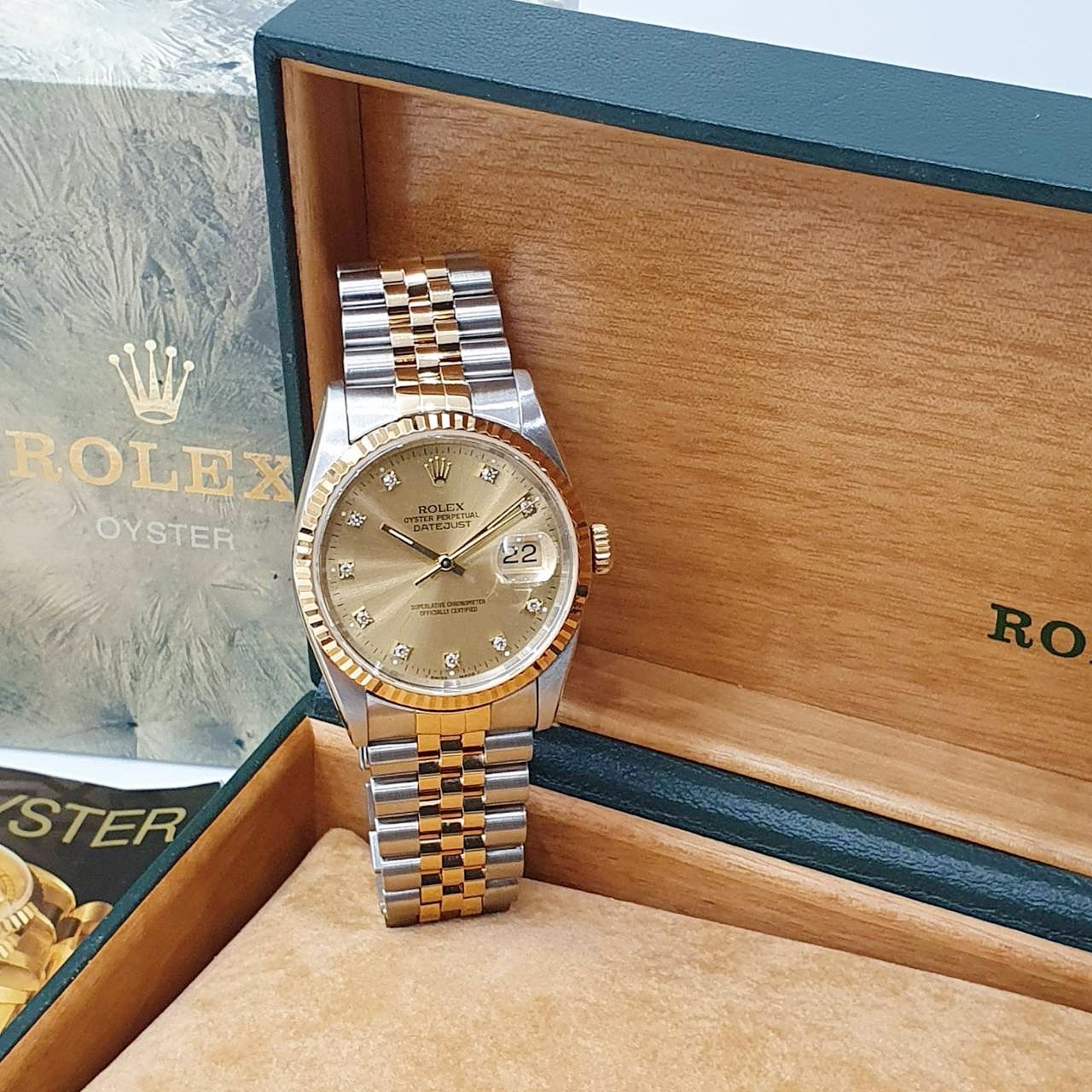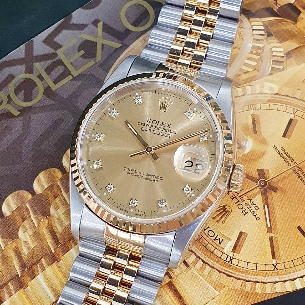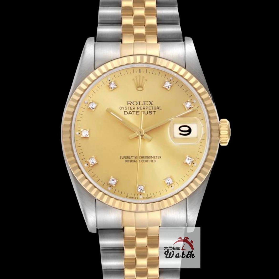 ROLEX勞力士 16233 Datejust 蠔式日誌 金十鑽面盤 舊包台 錶耳有孔 錶徑36mm 自動上鍊 18K金及不鏽鋼 防水100米 X字頭 缺證書 原廠盒裝 店保卡 保養完成