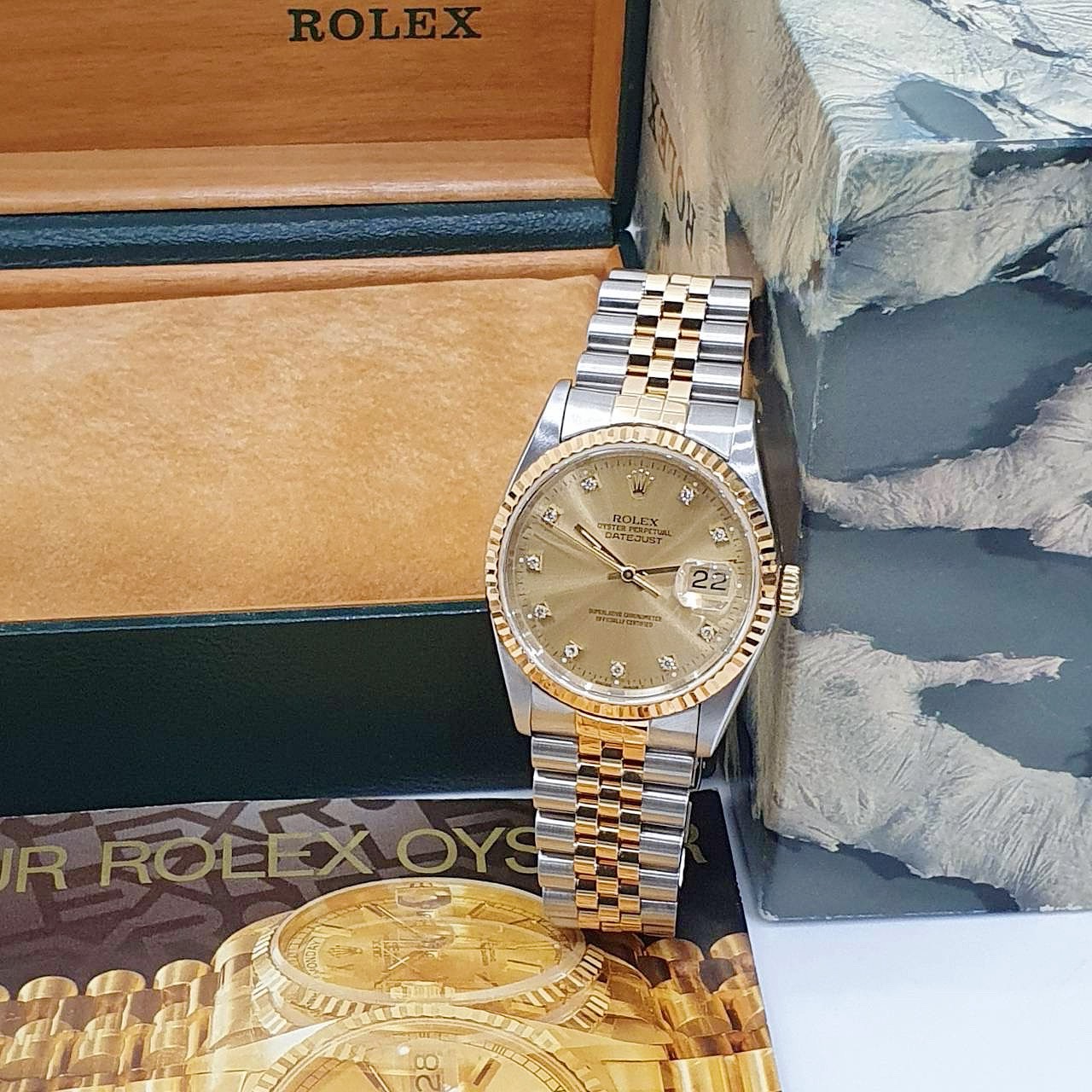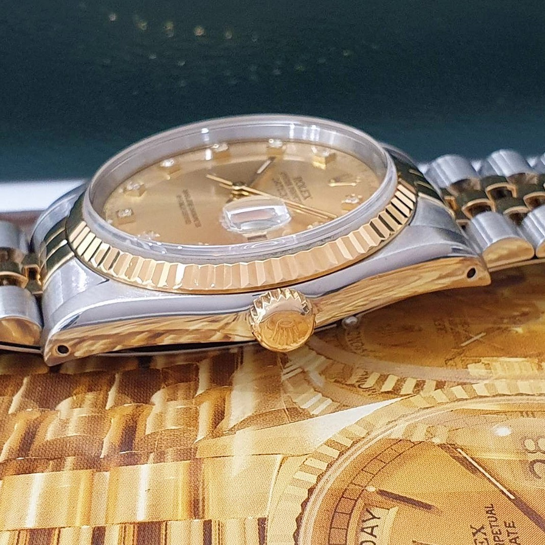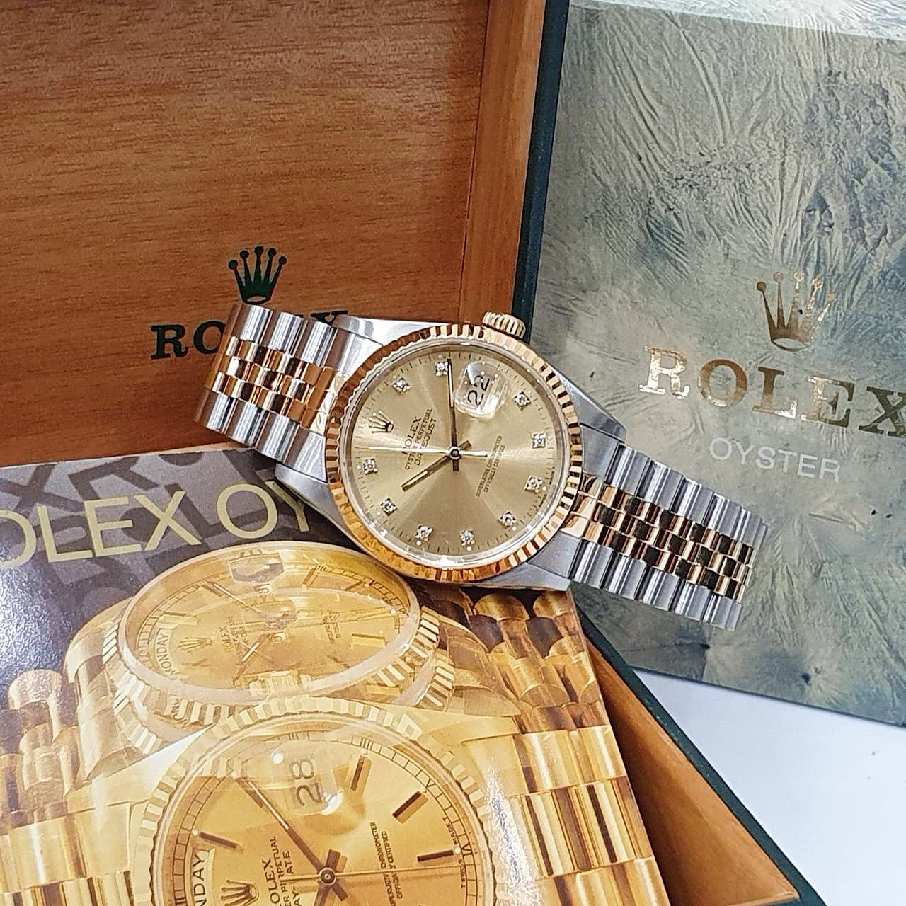 ROLEX勞力士 16233 Datejust 蠔式日誌 金十鑽面盤 舊包台 錶耳有孔 錶徑36mm 自動上鍊 18K金及不鏽鋼 防水100米 X字頭 缺證書 原廠盒裝 店保卡 保養完成