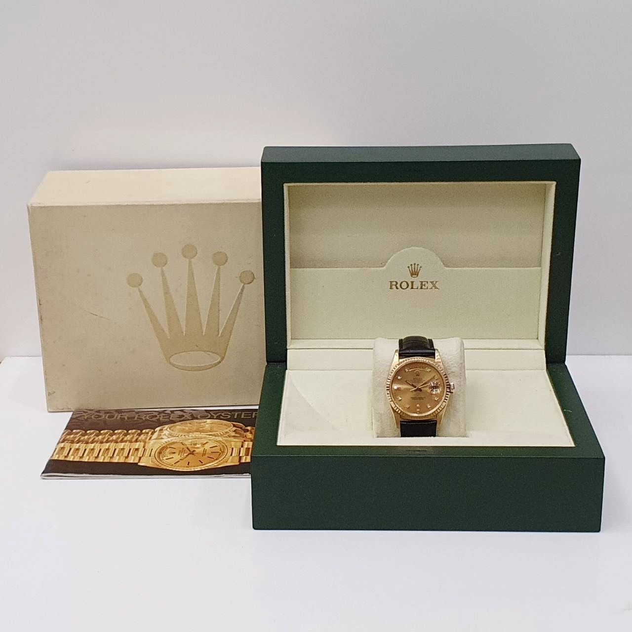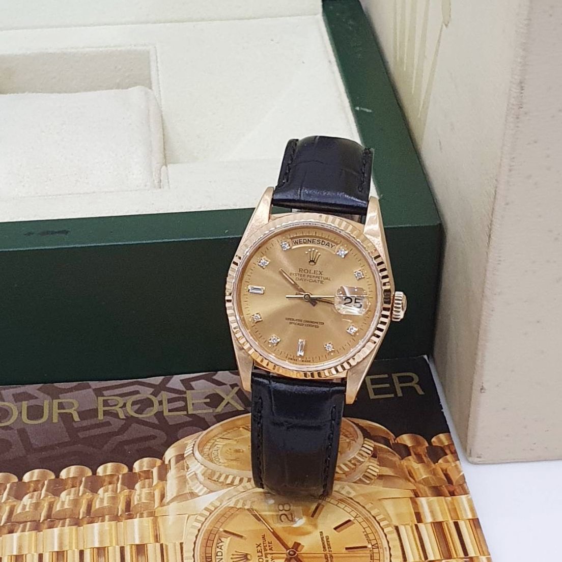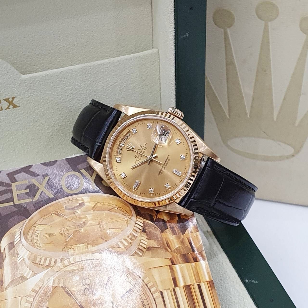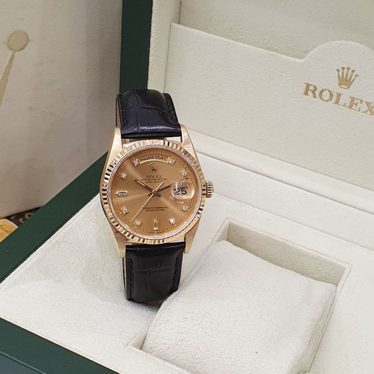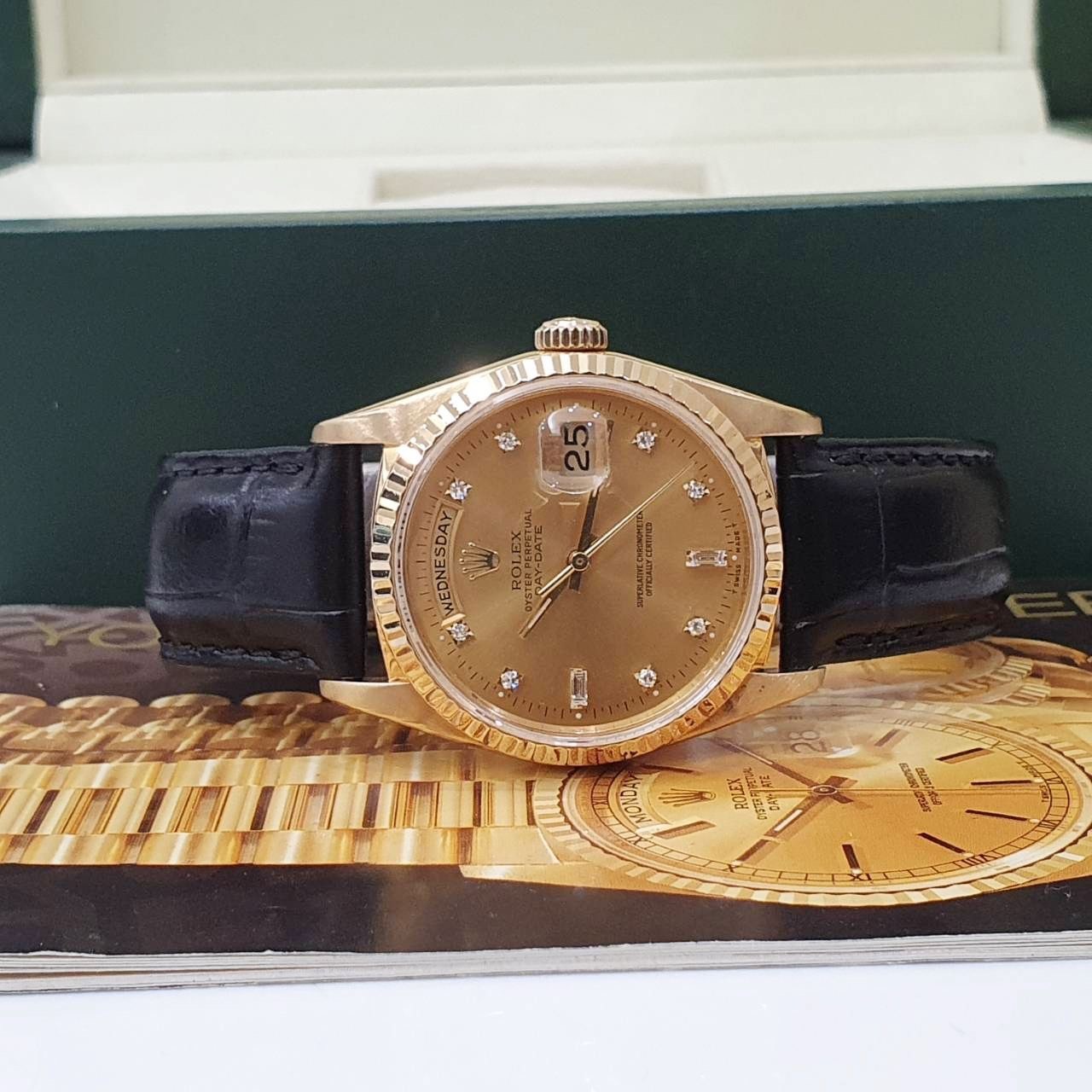 ROLEX 勞力士 18238 Day-Date 18K金 金十鑽面盤 原廠錶扣 代用皮帶 錶徑36mm 自動上鍊 18K金材質 防水100米 S字頭 缺證書 原廠盒裝 店保卡 保養完成