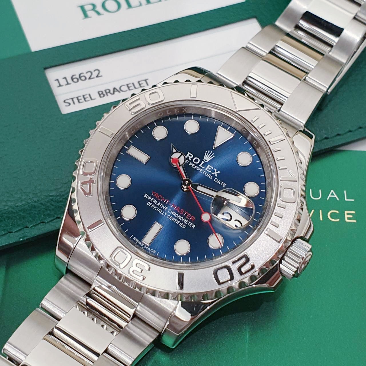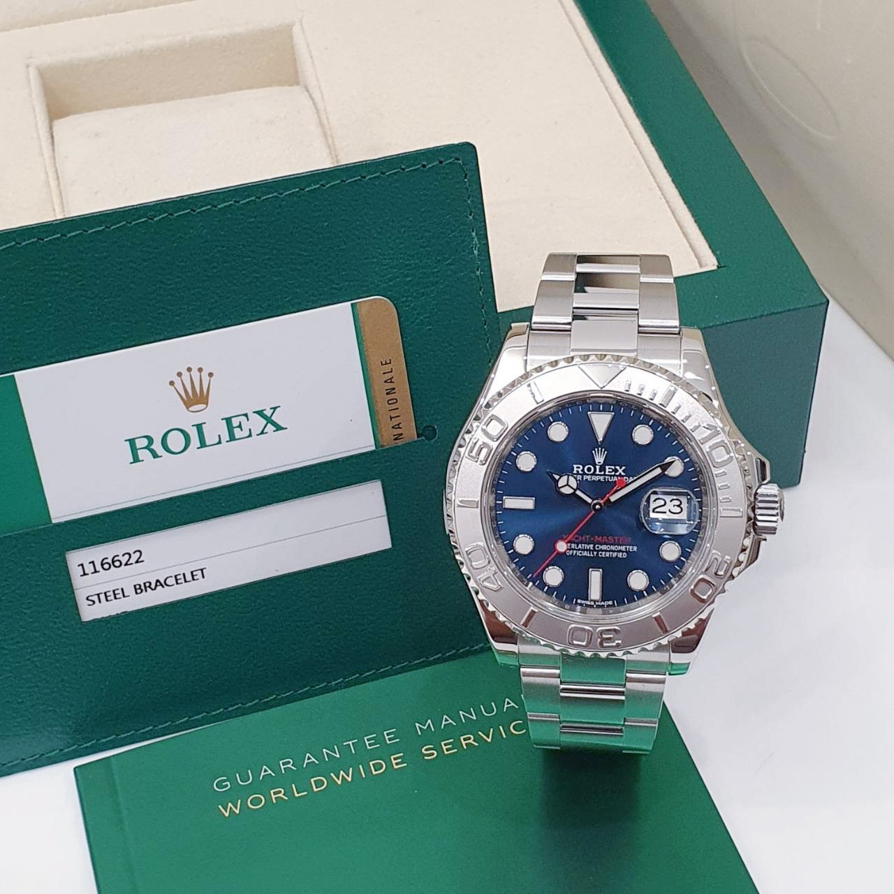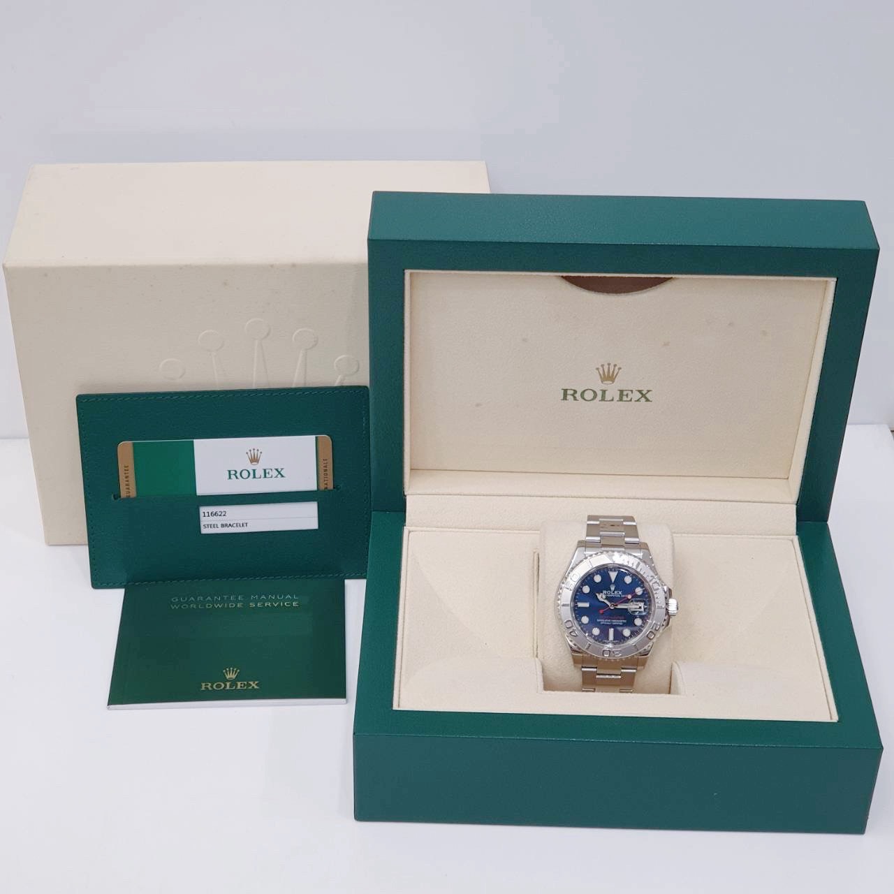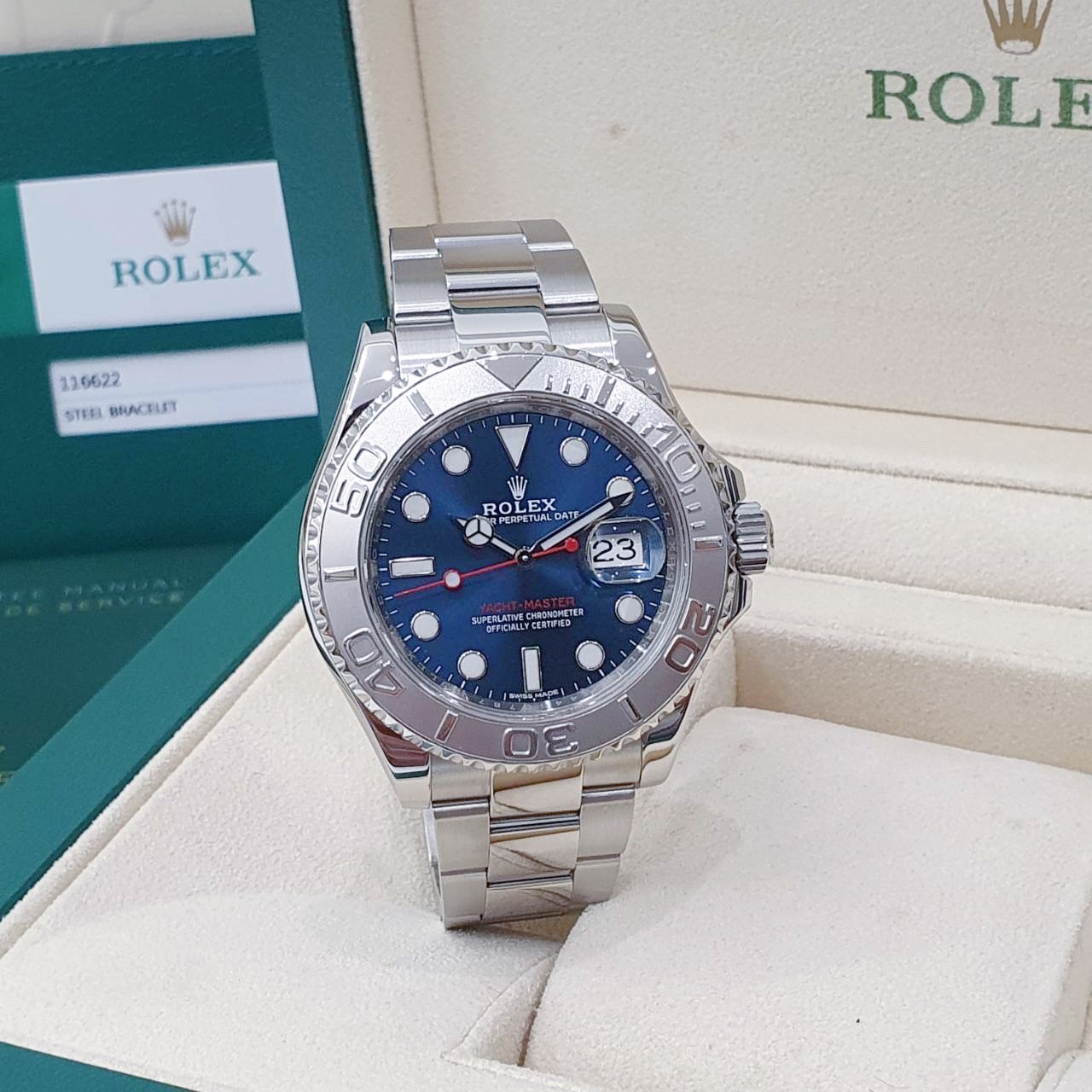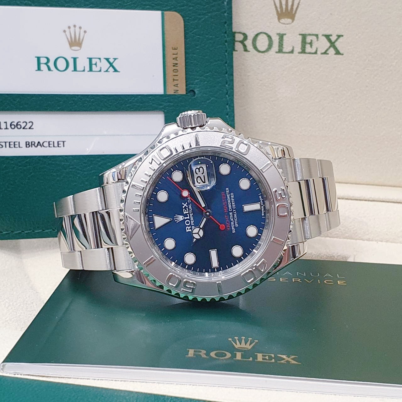 ROLEX 勞力士 Yacht-Master 116622 遊艇名仕型 2019/01卡 藍面紅針 PT950鉑金錶框 錶徑40mm 自動上鍊 不銹鋼材質 防水100米 原廠盒單齊全