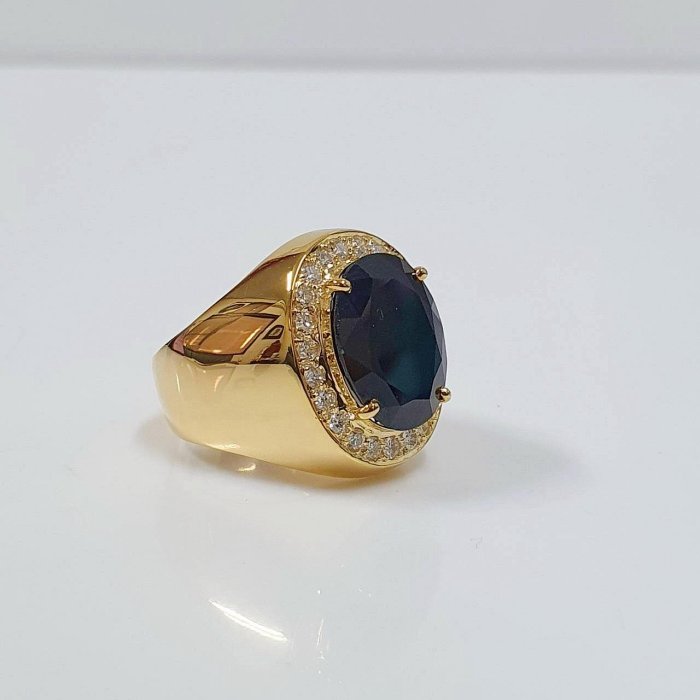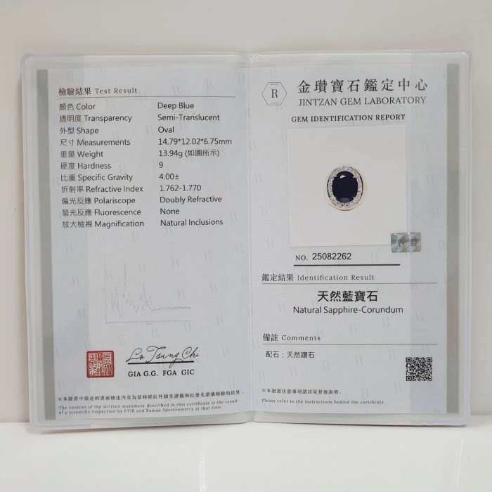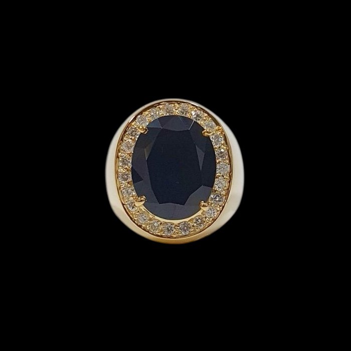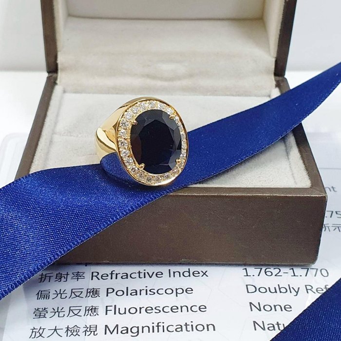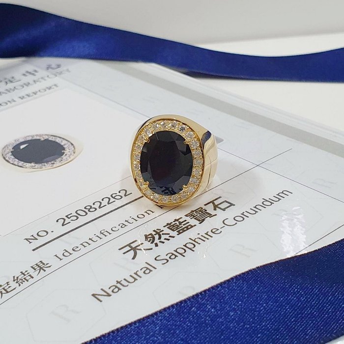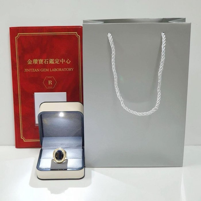 天然藍寶石戒指 鑽圈豪華款 藍寶石 585K金戒台 配鑽28顆約1ct 國際圍15號 面寬2.1x1.7cm 重3.67錢 附證書 精美盒裝 店保卡