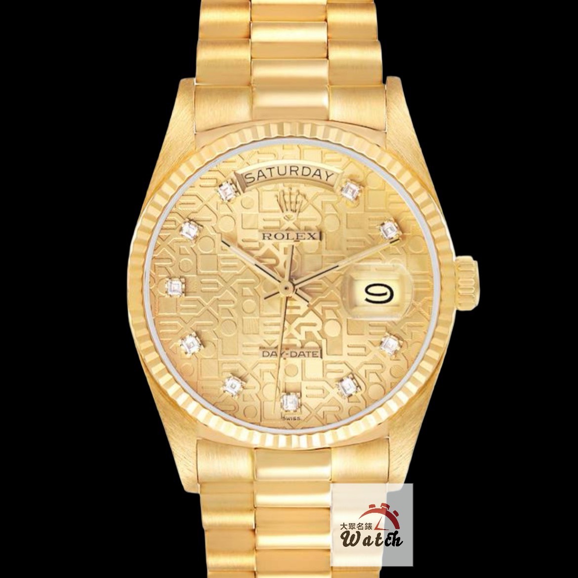材質: 18K黃金材質錶殼、元首型鏈帶、折疊錶扣 / 金十鑽紀念方鑽面 / 藍寶石玻璃水晶玻璃