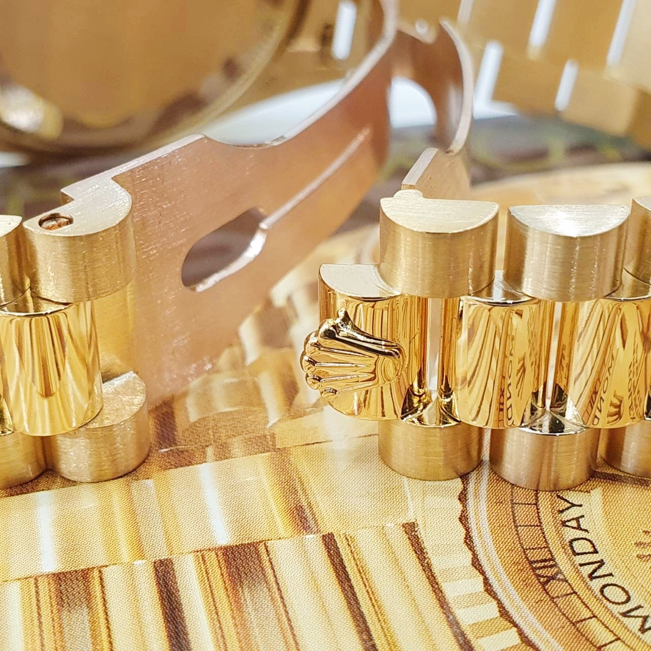 功能: 勞力士原廠cal.3055自動上鍊機芯 / 時、分、秒針大三針時間指示 / 放大日期窗及扇形星期窗顯示 / 100米防水