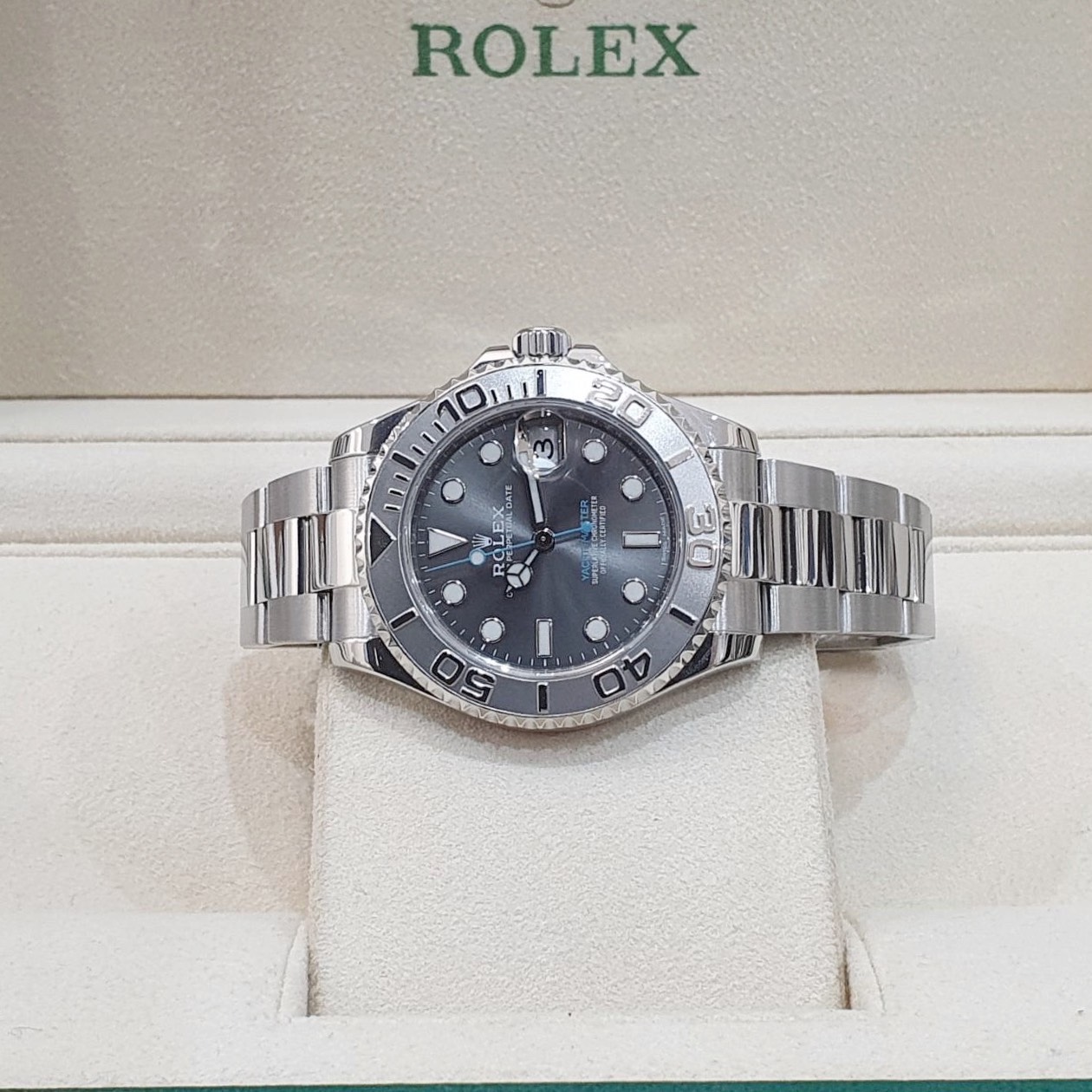 ROLEX 勞力士 268622 Yacht-Master 中型遊艇 灰面藍針 2017/12卡 PT950鉑金圈 錶徑37mm 自動上鍊 不鏽鋼材質 防水100米 原廠盒單齊全 保養完成