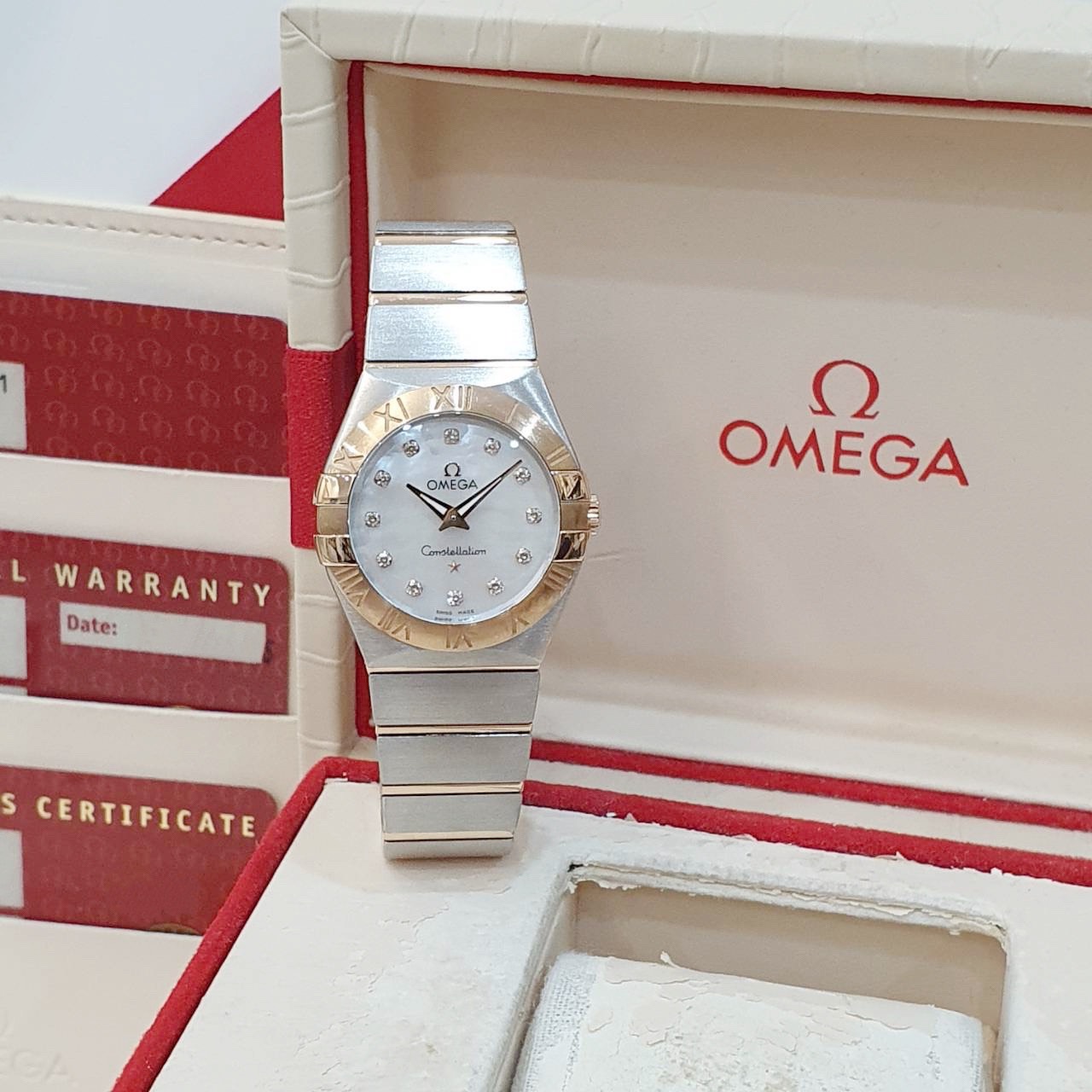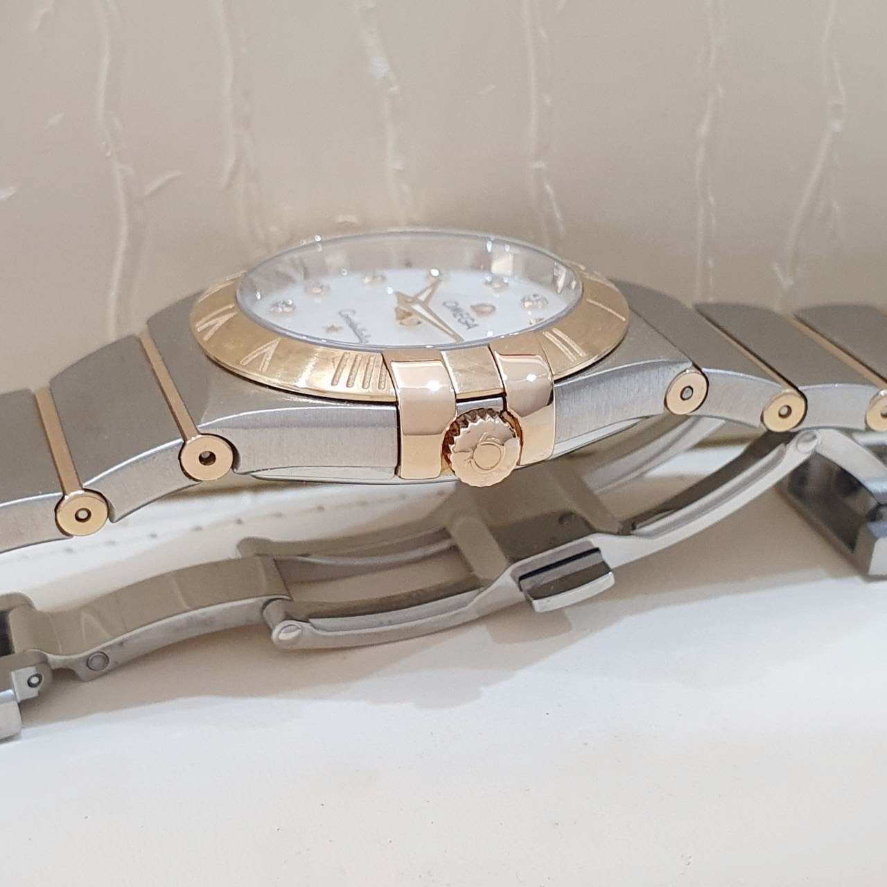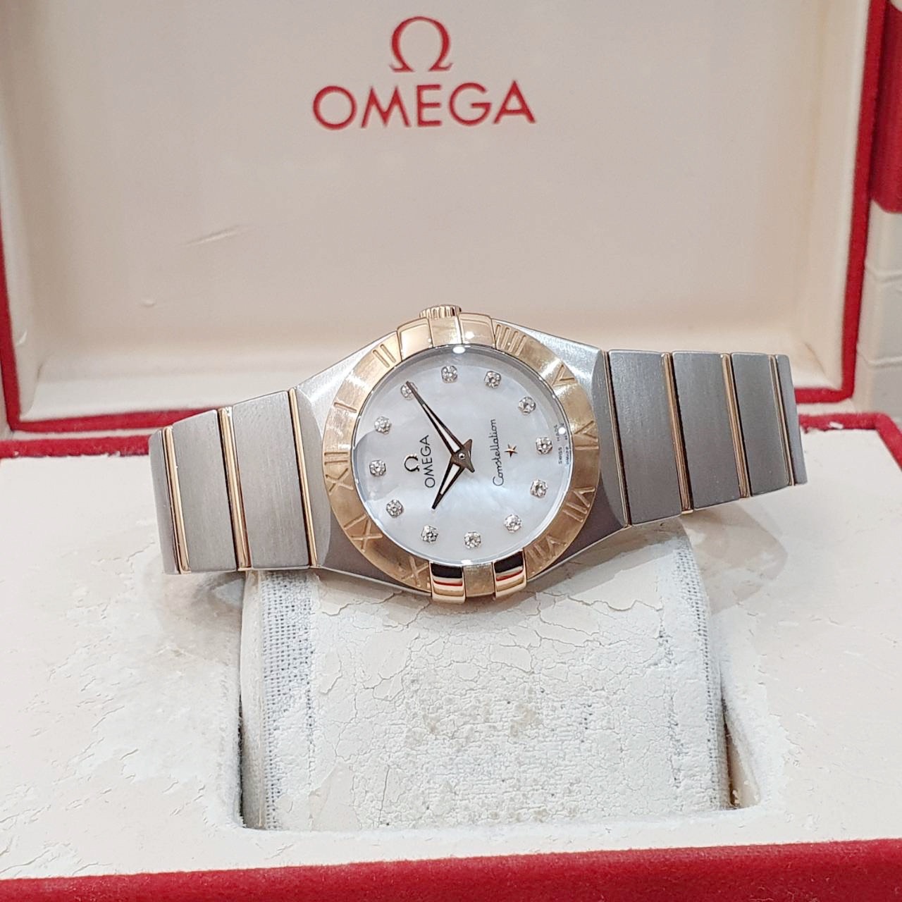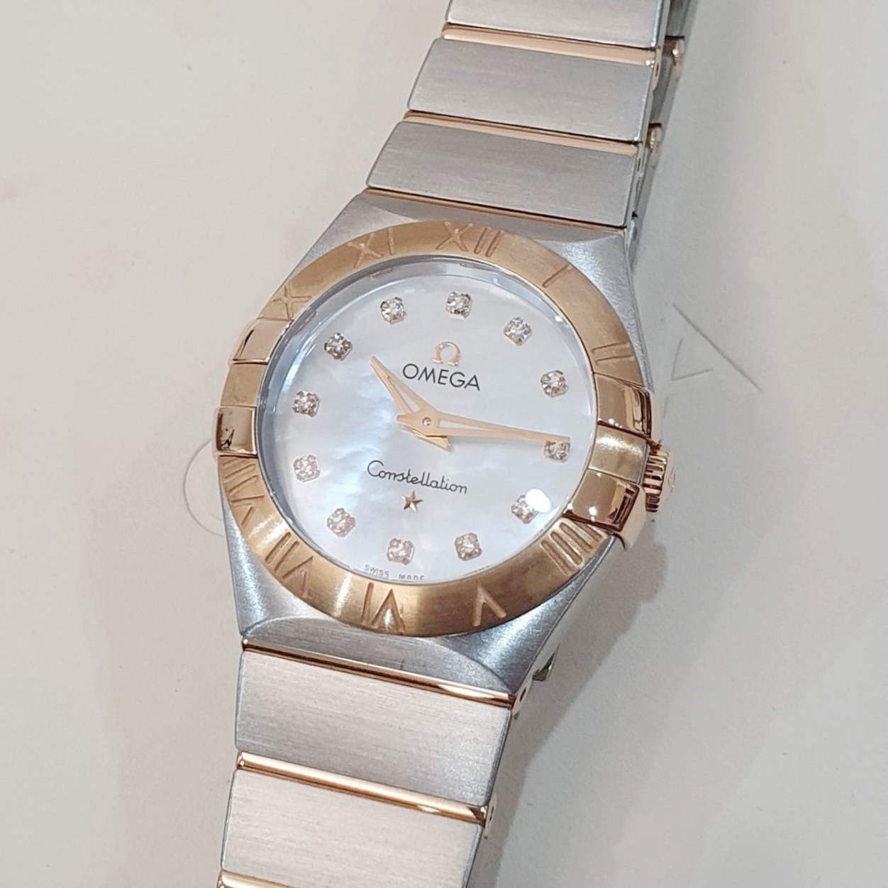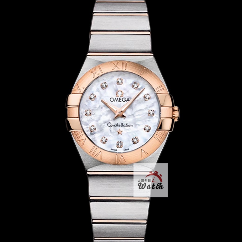 OMEGA 歐米茄 123.20.27.60.55.001 星座系列 白色珍珠母貝殼面 鑽石時標 18K玫瑰金錶圈 2015/12 錶徑27mm 石英機芯 18K玫瑰金及不鏽鋼 防水100米 原廠盒單齊全 保養完成