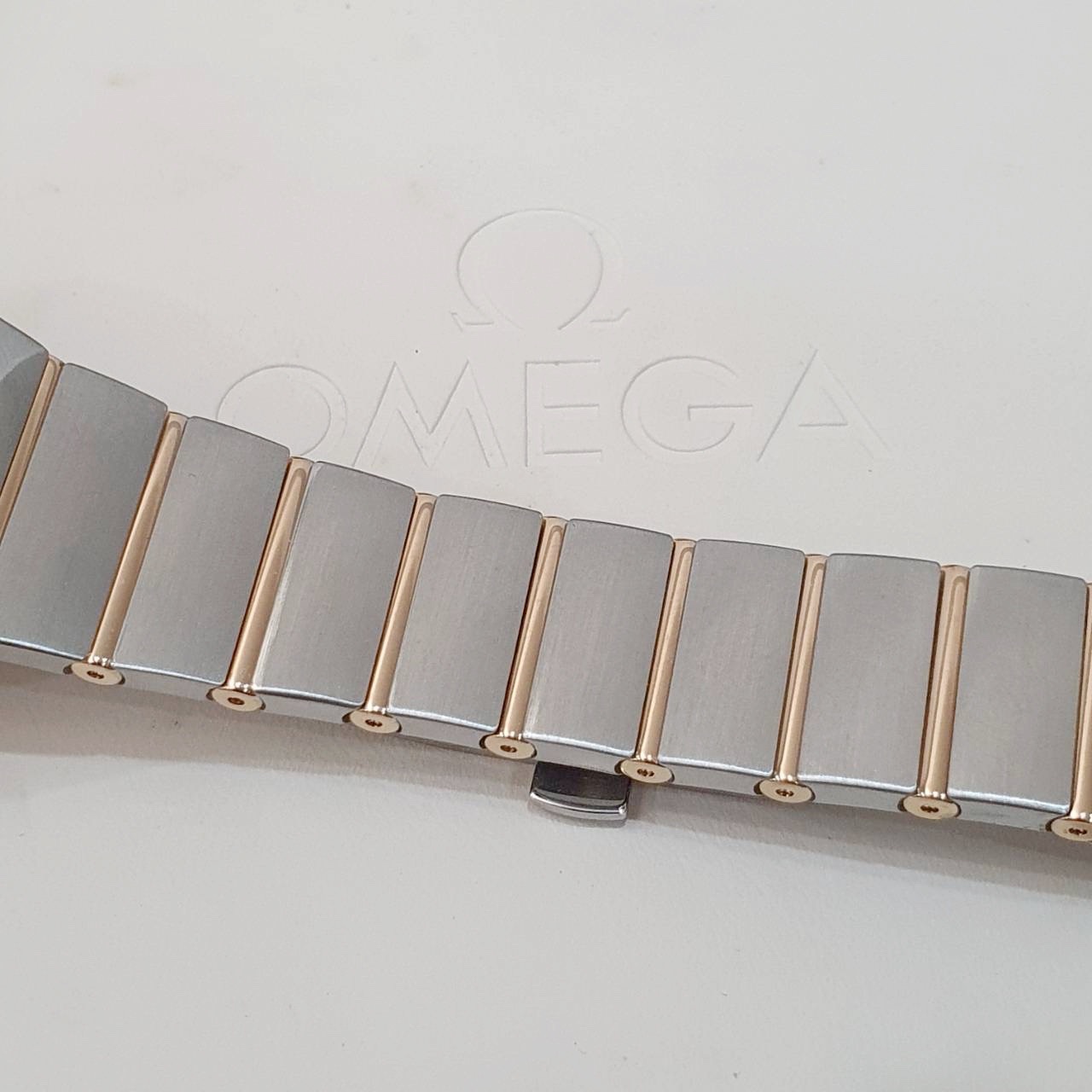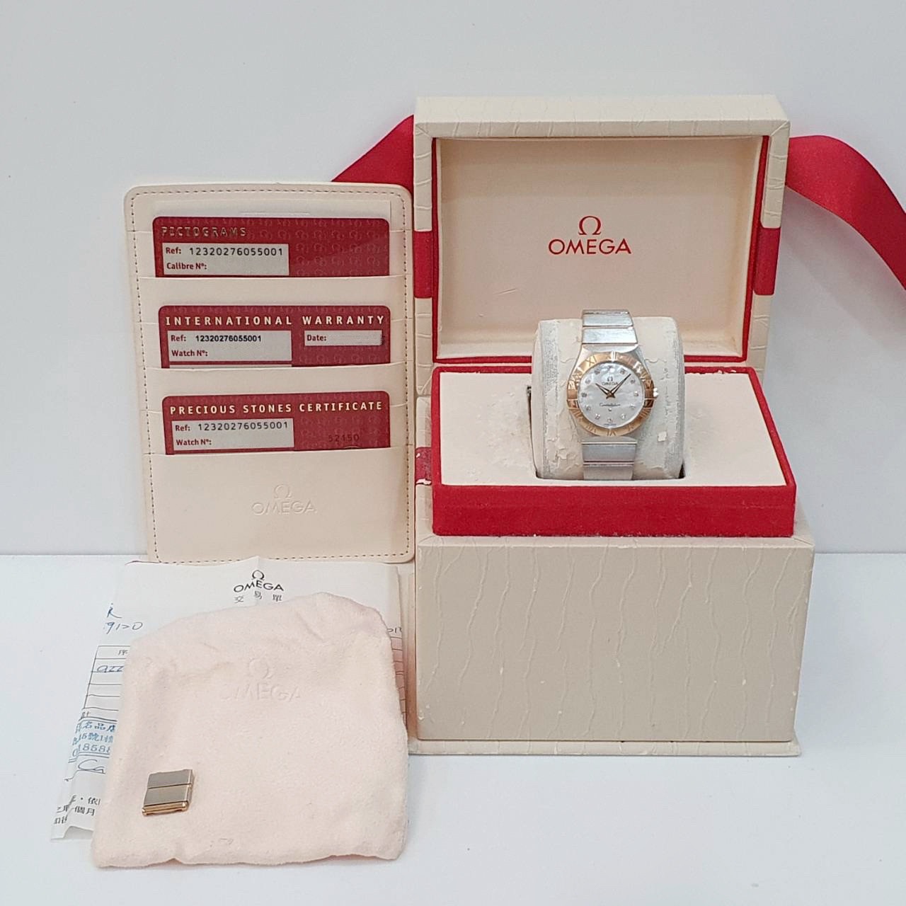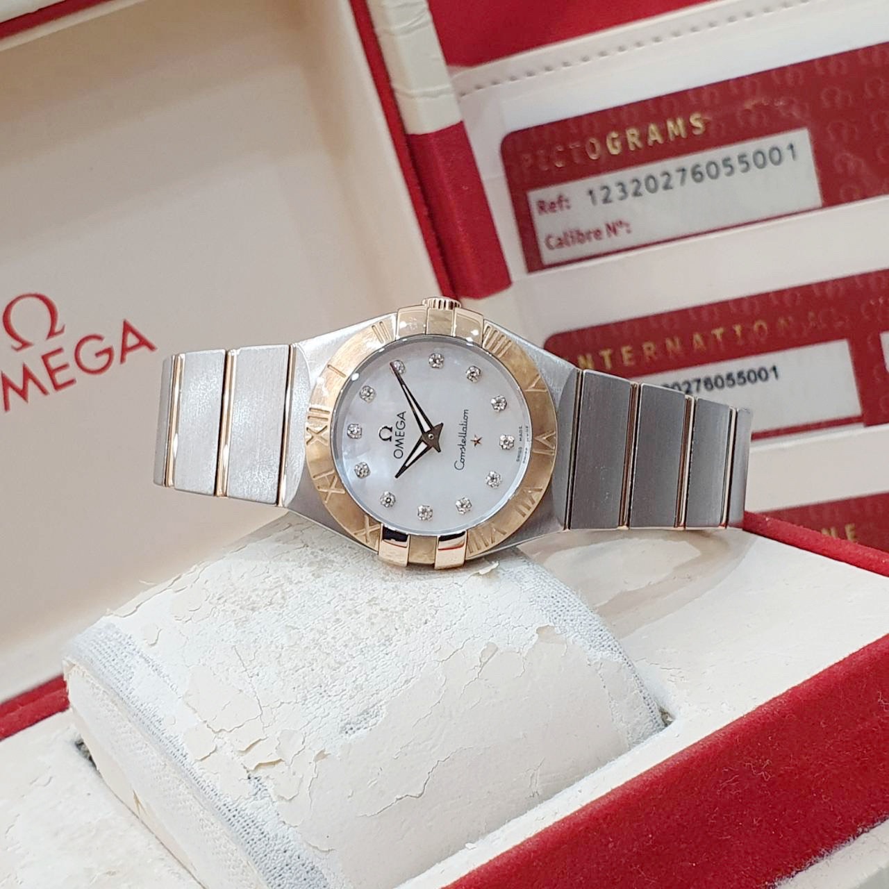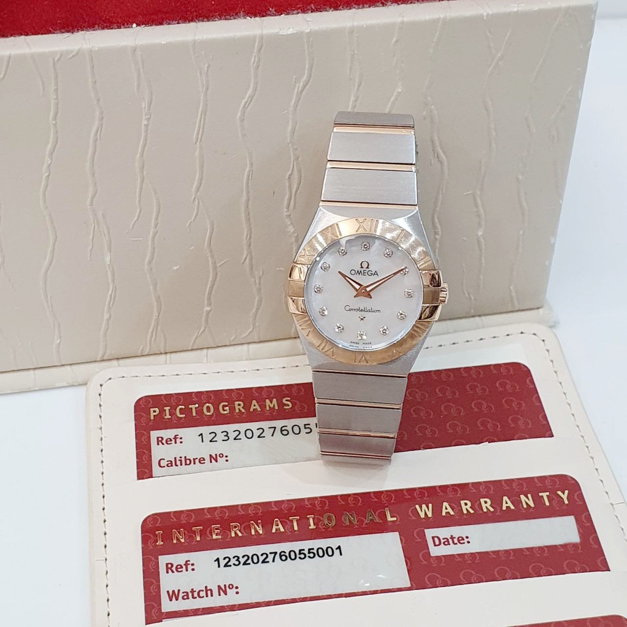 OMEGA 歐米茄 123.20.27.60.55.001 星座系列 白色珍珠母貝殼面 鑽石時標 18K玫瑰金錶圈 2015/12 錶徑27mm 石英機芯 18K玫瑰金及不鏽鋼 防水100米 原廠盒單齊全 保養完成