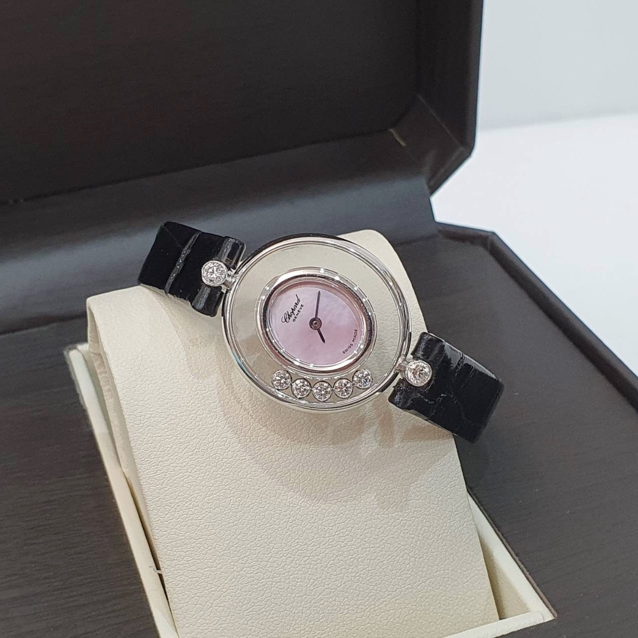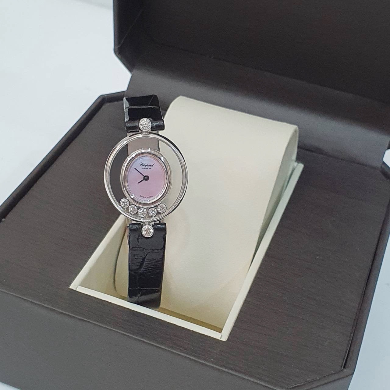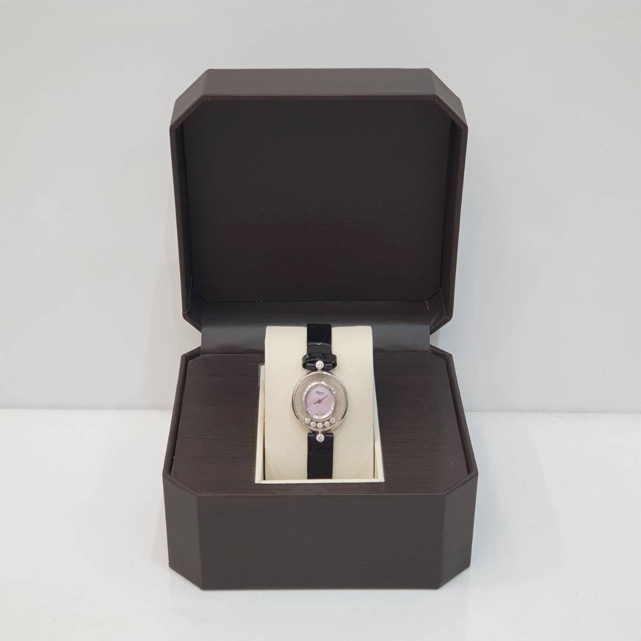 CHOPARD 蕭邦 Happy Diamonds 快樂鑽 20/4305 女腕錶 粉色貝殼面 5顆跑鑽 原廠錶扣 代用皮帶 錶徑21.5mm 石英機蕊 18K白金材質 缺證書 精美盒裝 店保卡 保養完成