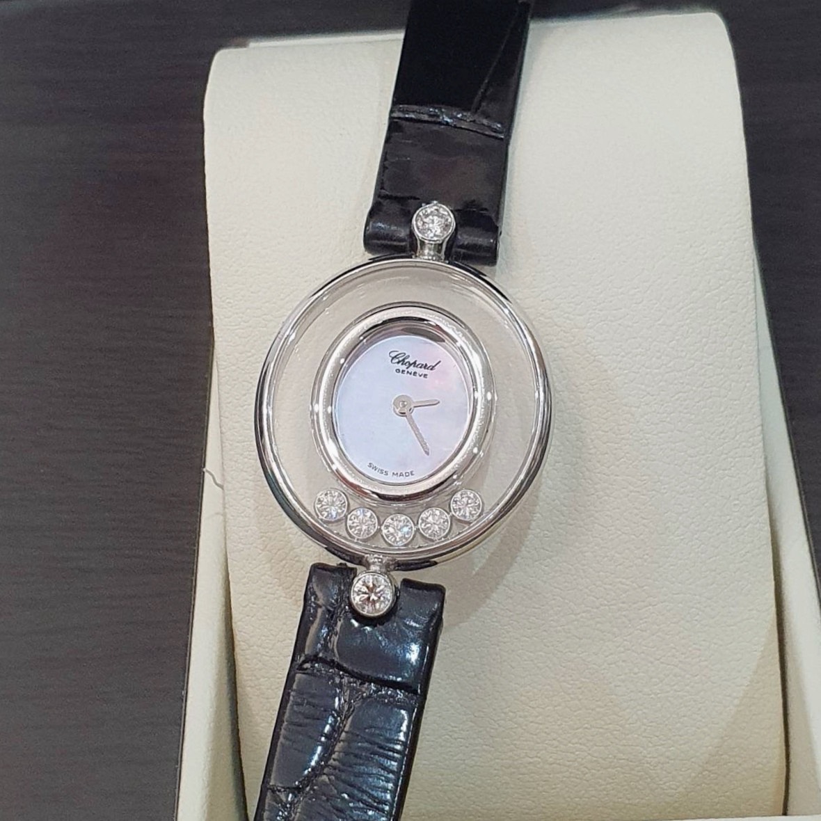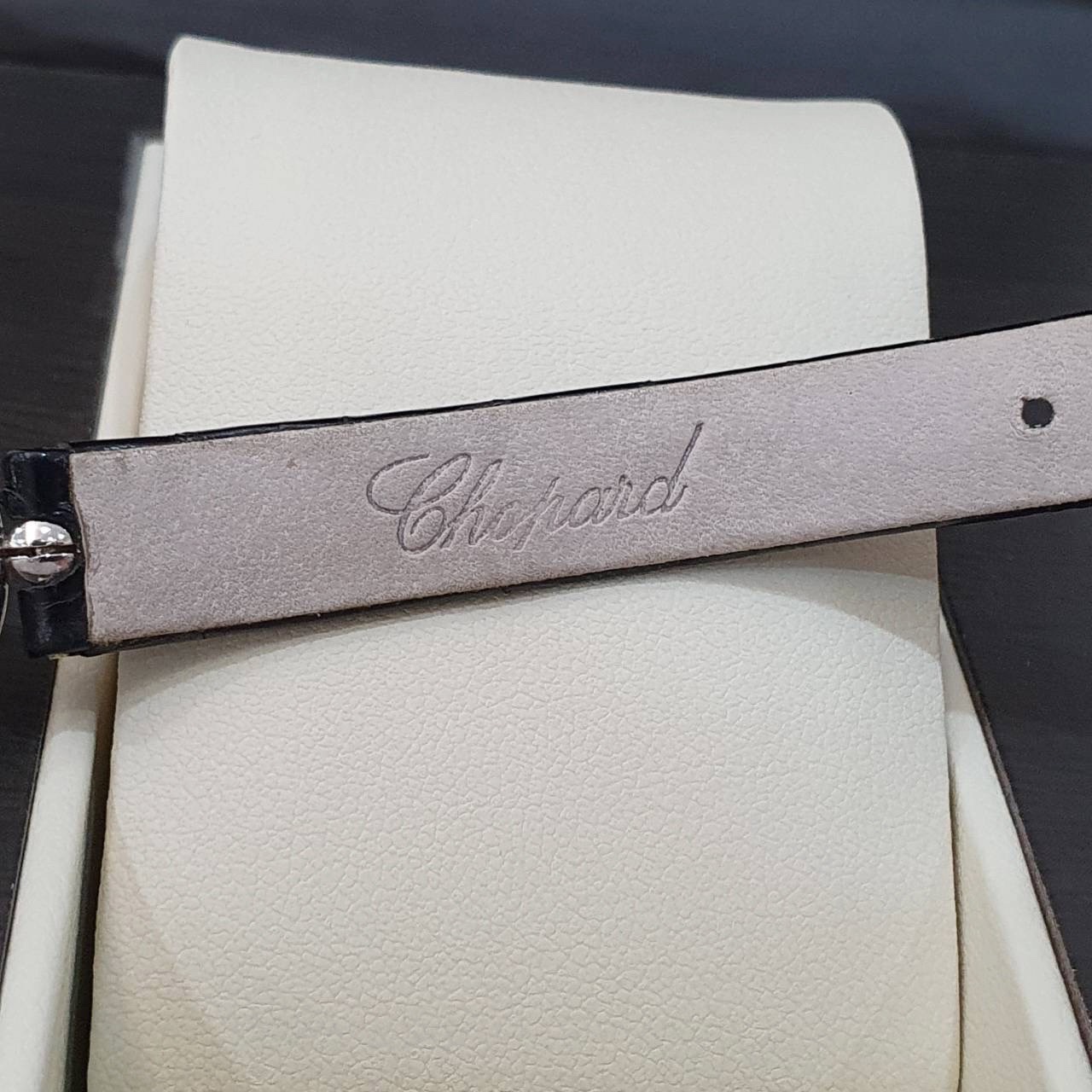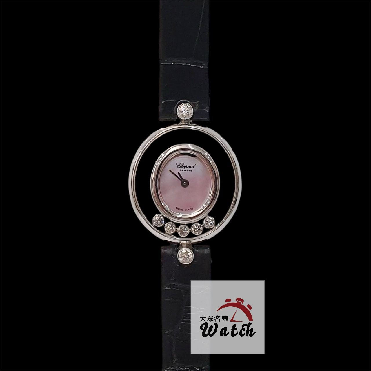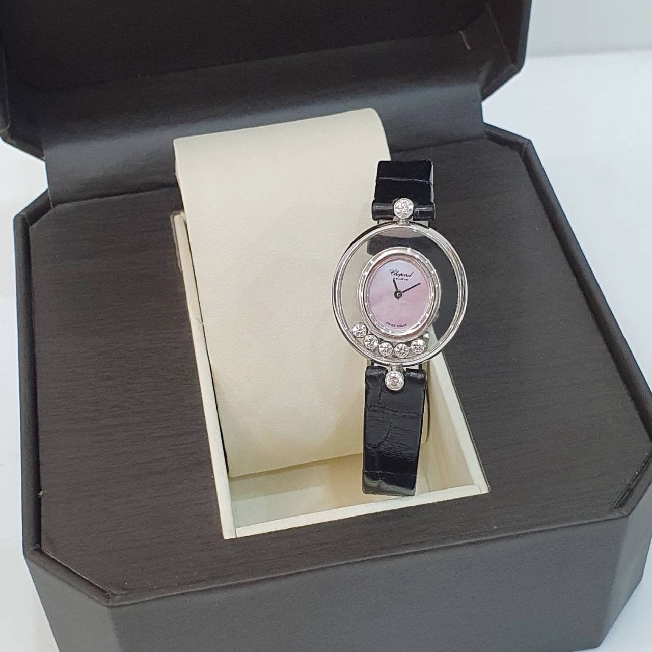 CHOPARD 蕭邦 Happy Diamonds 快樂鑽 20/4305 女腕錶 粉色貝殼面 5顆跑鑽 原廠錶扣 代用皮帶 錶徑21.5mm 石英機蕊 18K白金材質 缺證書 精美盒裝 店保卡 保養完成