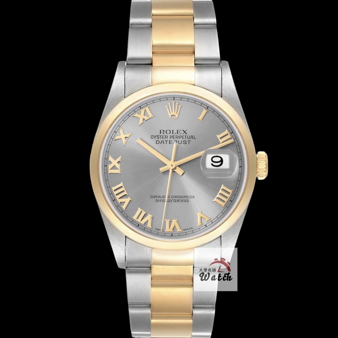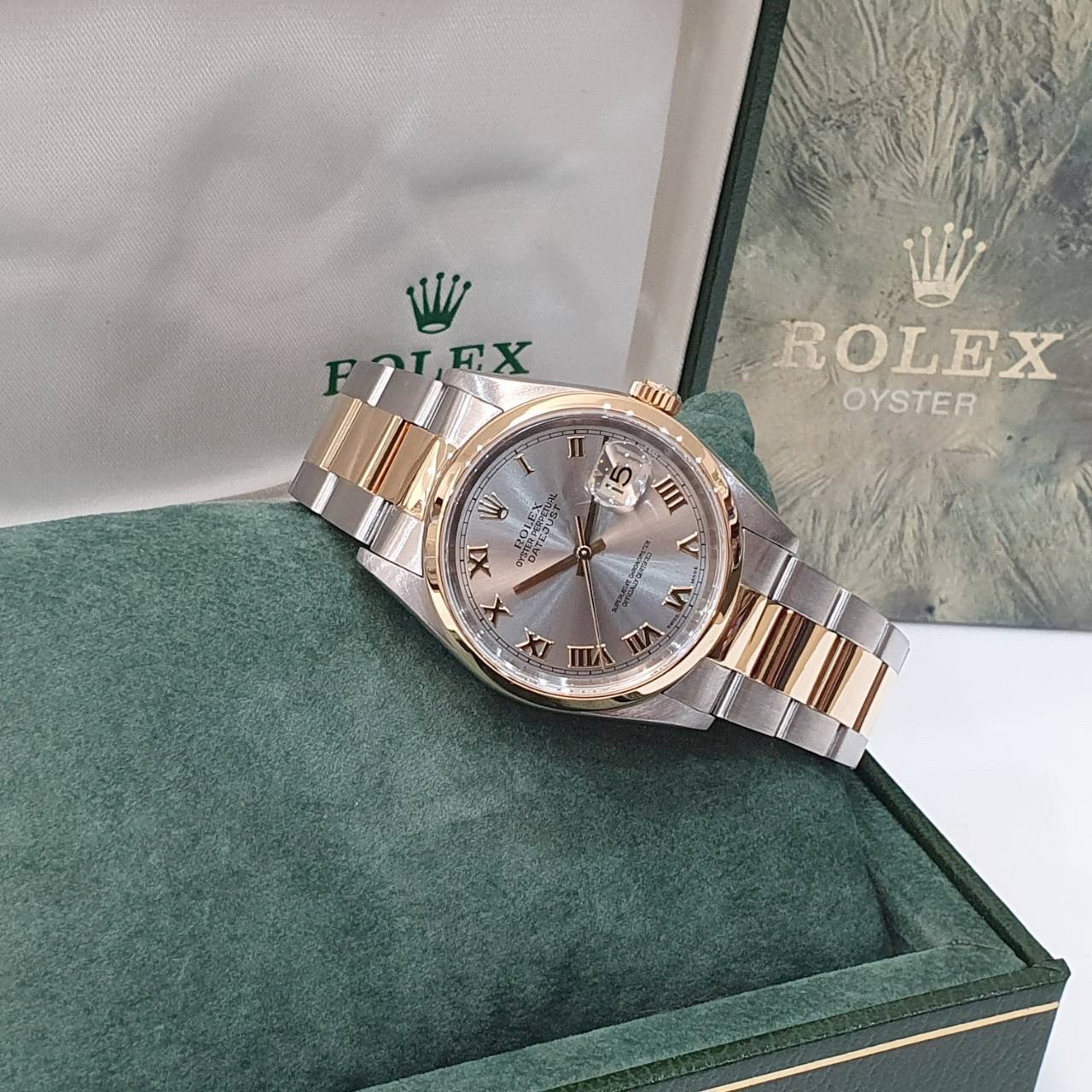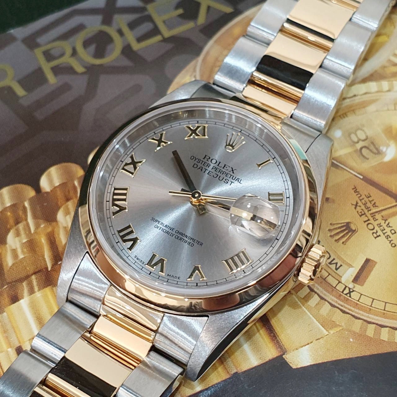 ROLEX 勞力士 16203 Datejust 18K半金 蠔式日誌 灰色面盤 羅馬時標 光滑錶圈 錶帶原況未整理 錶徑36mm 自動上鍊 18K金及不鏽鋼 防水100米 缺證書 原廠盒裝 保養完成