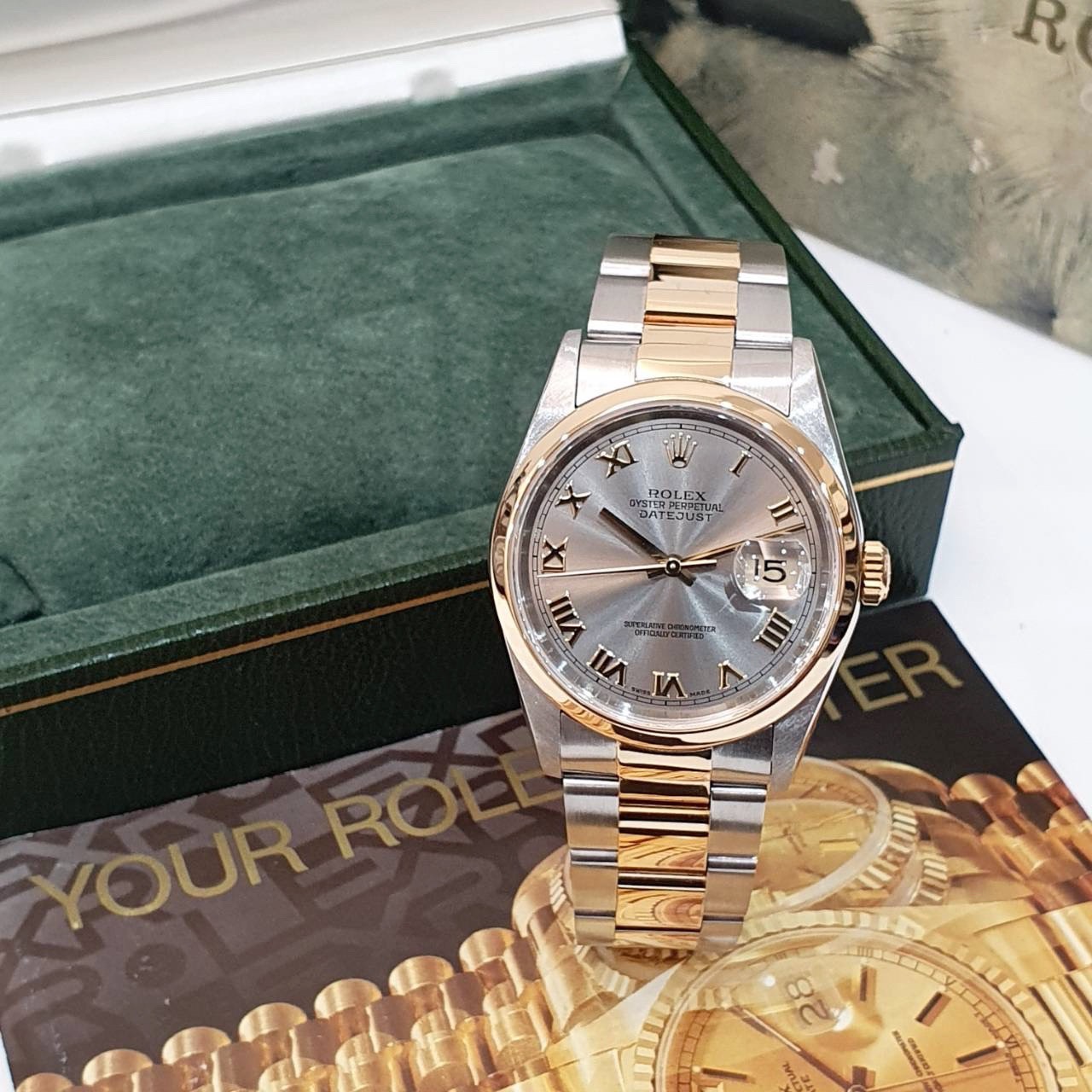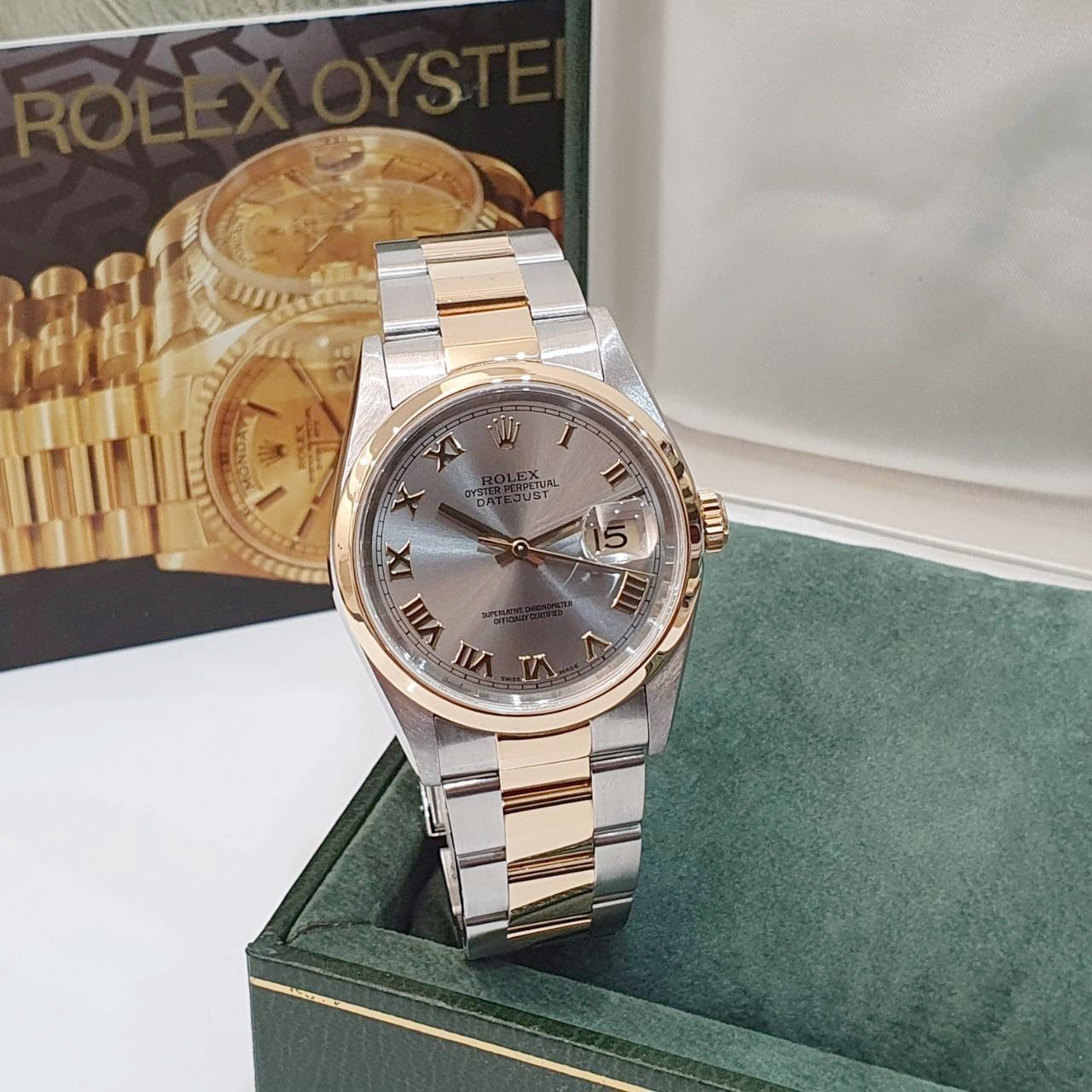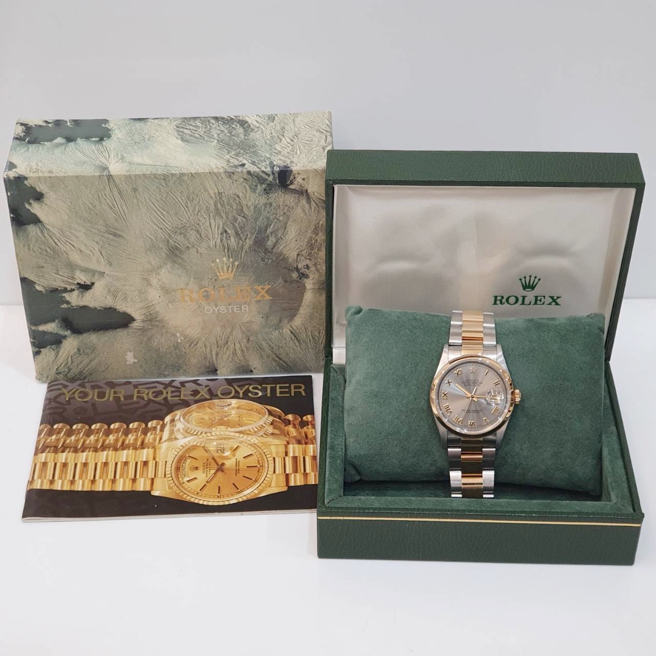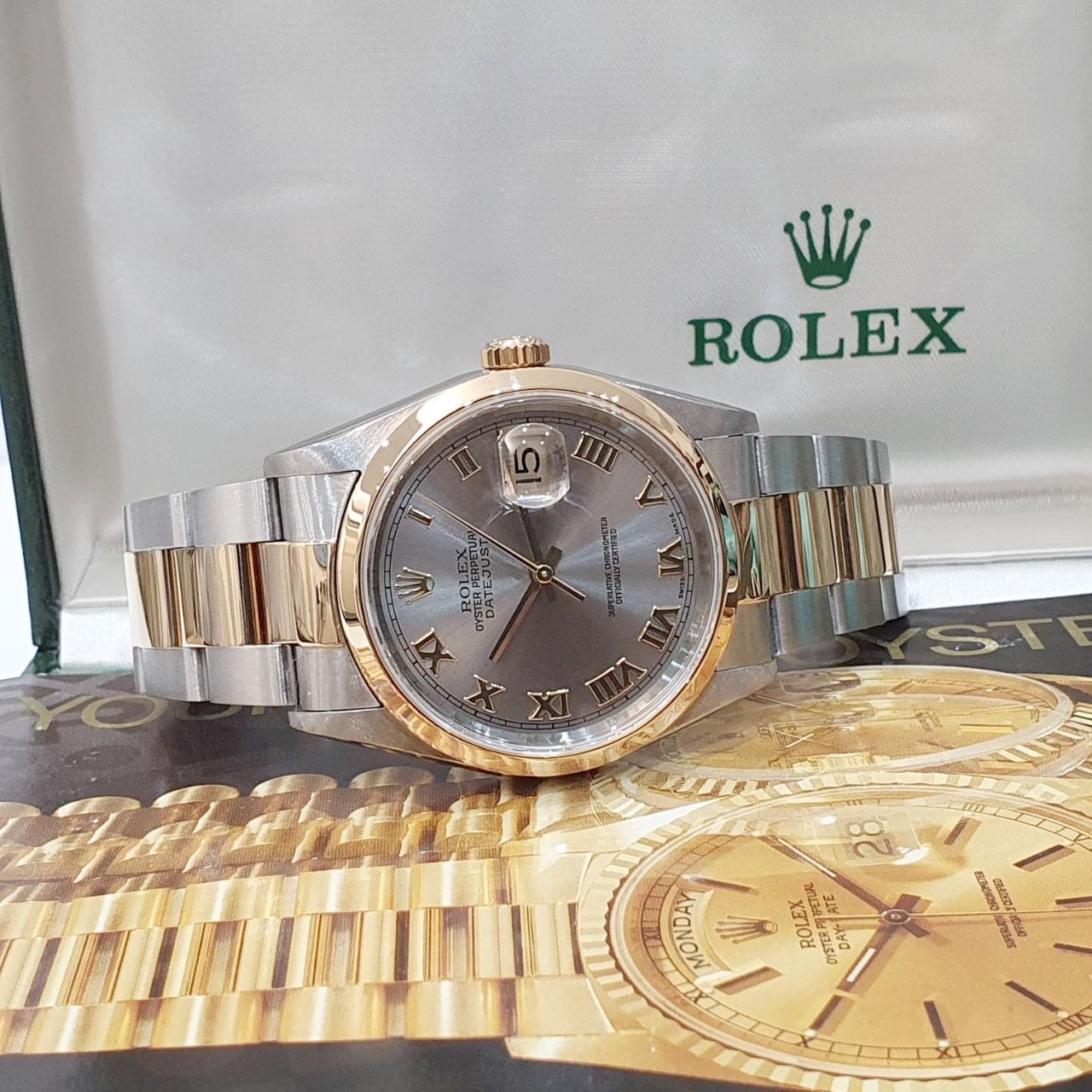 ROLEX 勞力士 16203 Datejust 18K半金 蠔式日誌 灰色面盤 羅馬時標 光滑錶圈 錶帶原況未整理 錶徑36mm 自動上鍊 18K金及不鏽鋼 防水100米 缺證書 原廠盒裝 保養完成