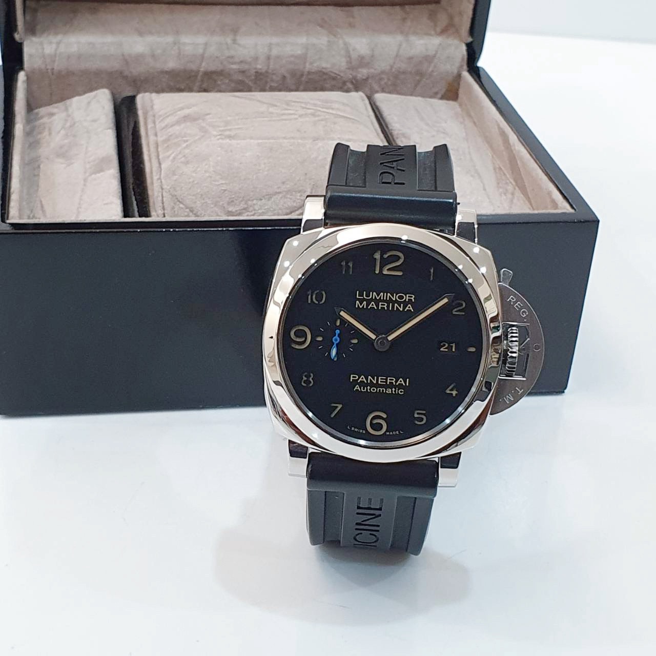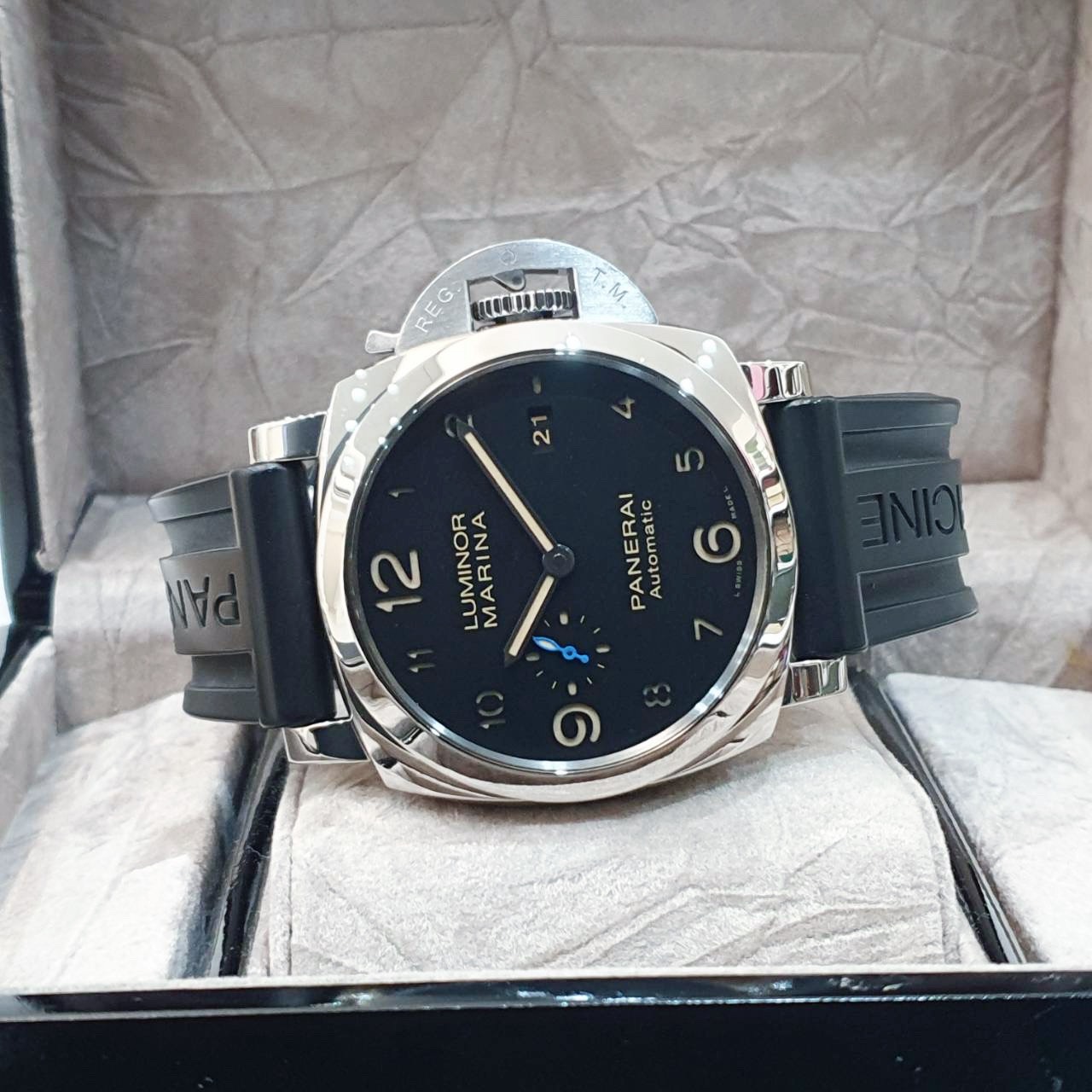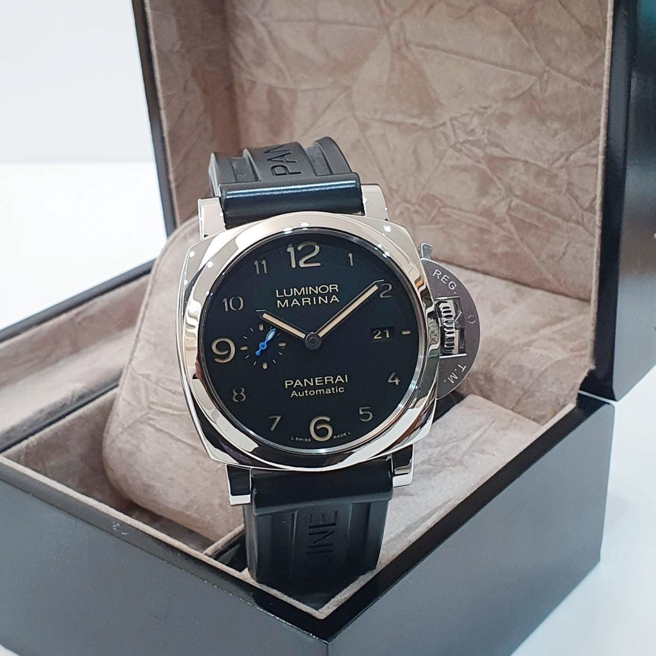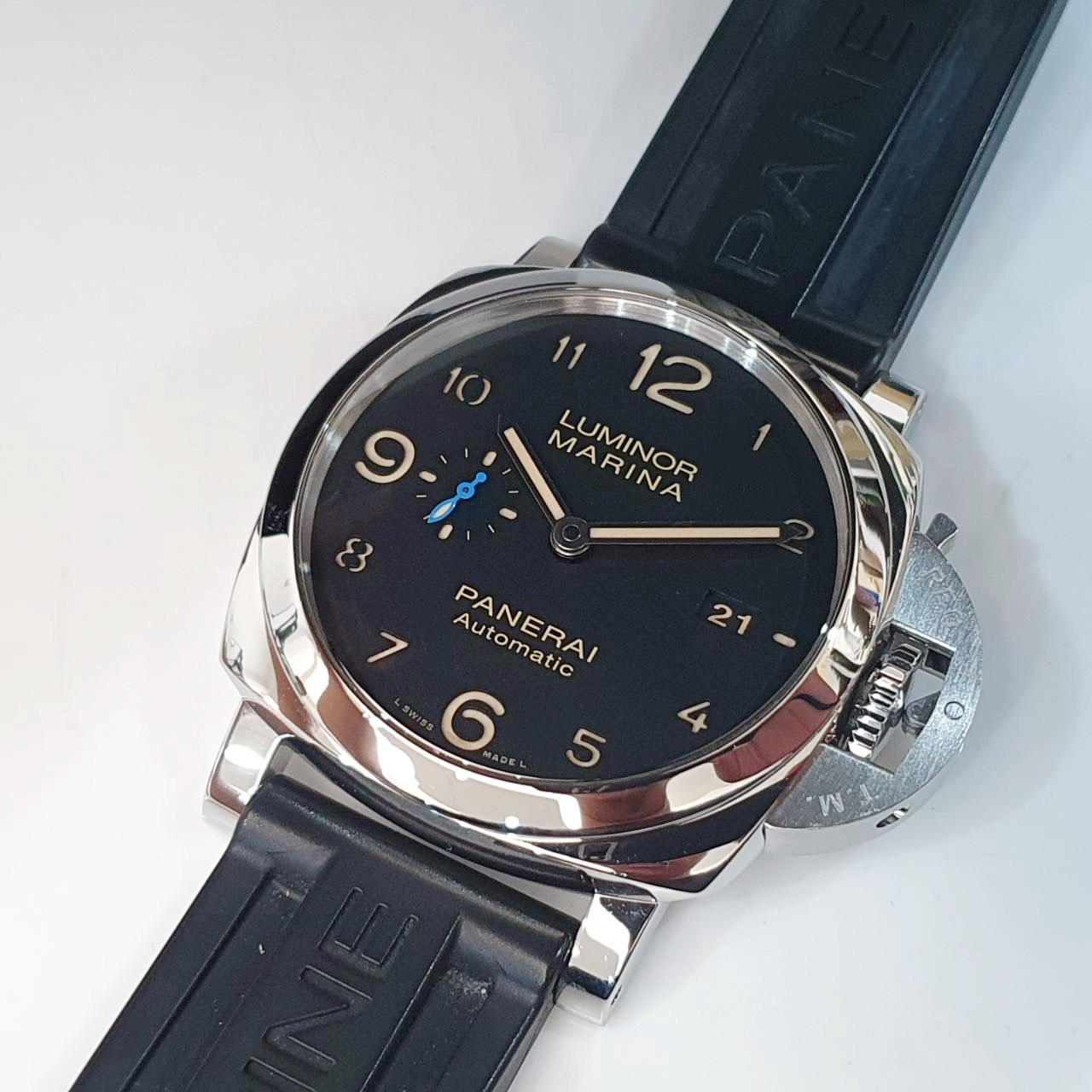 PANERAI 沛納海 Luminor系列 PAM01359 黑面 菸草三明治面盤 藍色小秒針 原廠膠帶 代用錶扣 底蓋裸空 錶徑44mm 自動上鍊 不鏽鋼材質 防水300米 缺證書 精美盒裝 保養完成