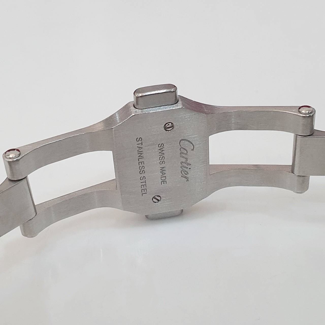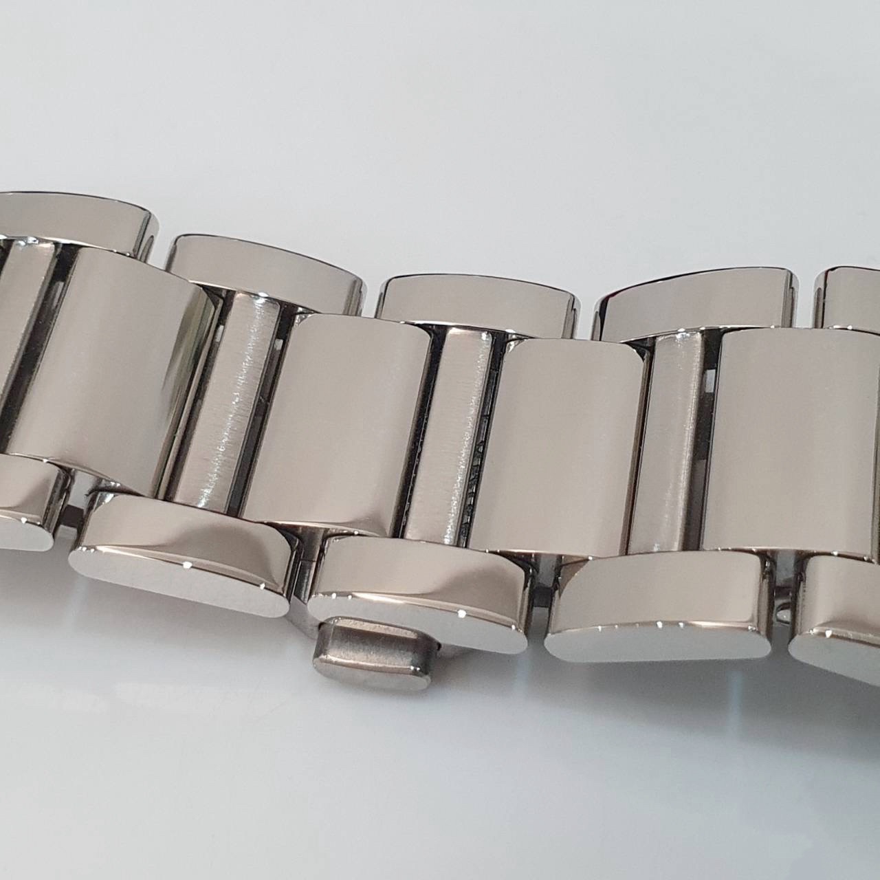 不鏽鋼材質錶、鏈帶、摺疊扣 / 羅馬數字時標 / 凹槽式錶冠鑲嵌一顆凸圓形合成尖晶石 / 鍍銀雕紋錶盤 / 藍鋼劍形指針 / 藍寶石水晶鏡面 |