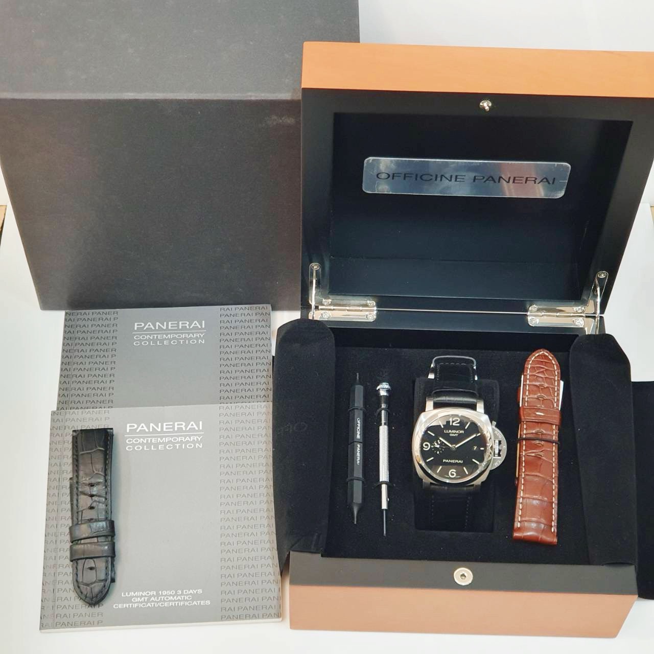 PANERAI沛納海 PAM00320 LUMINOR1950系列 2014/04 三明治面盤 GMT兩地時區 小秒針 錶徑44mm 自動上鍊 不鏽鋼材質 防水300米 原廠盒單齊全 保養完成