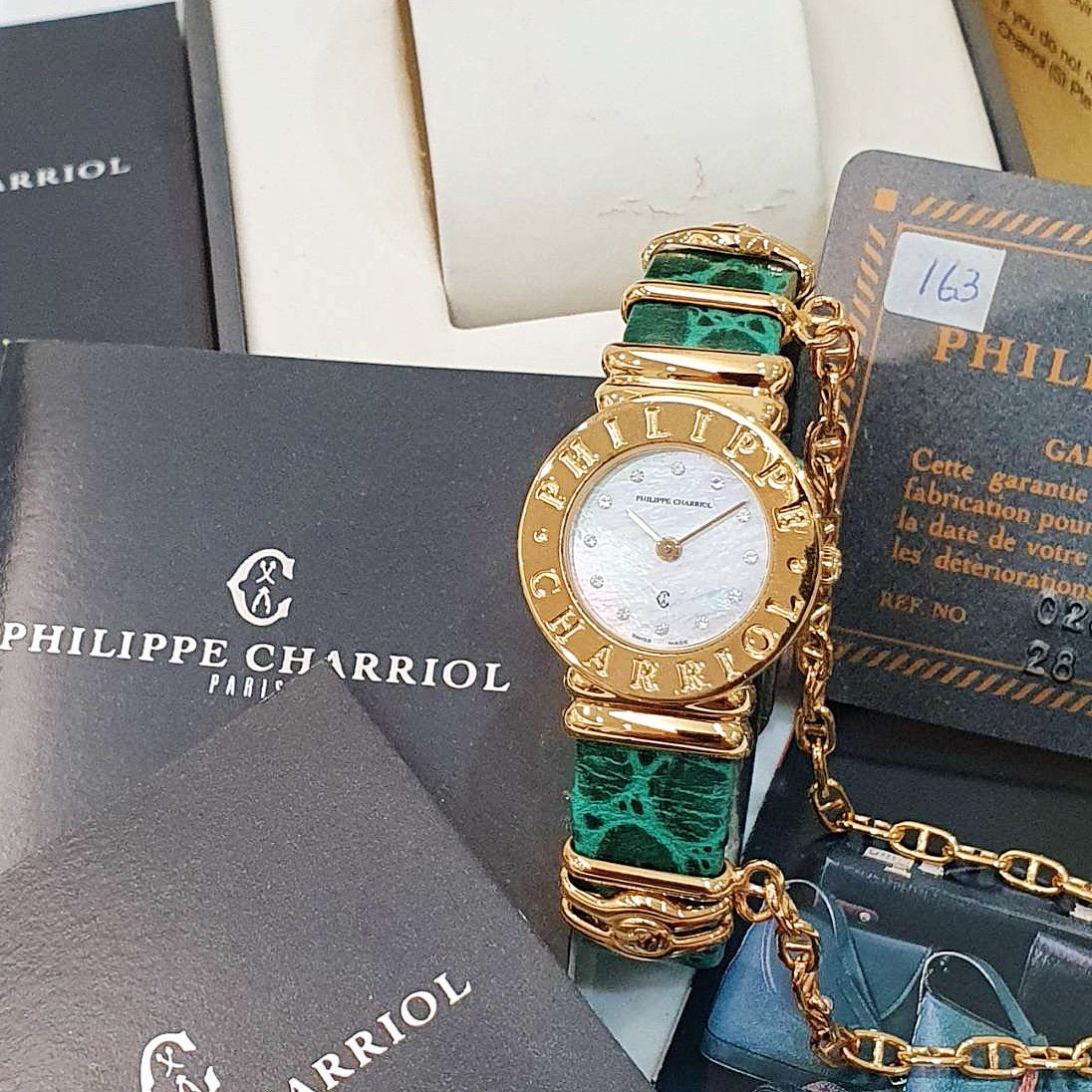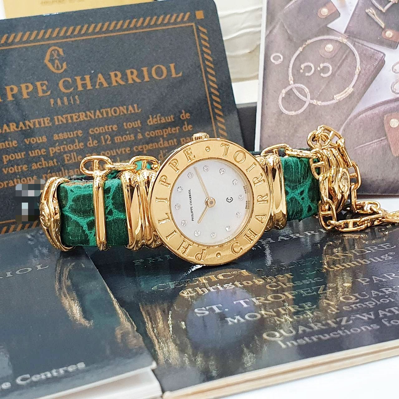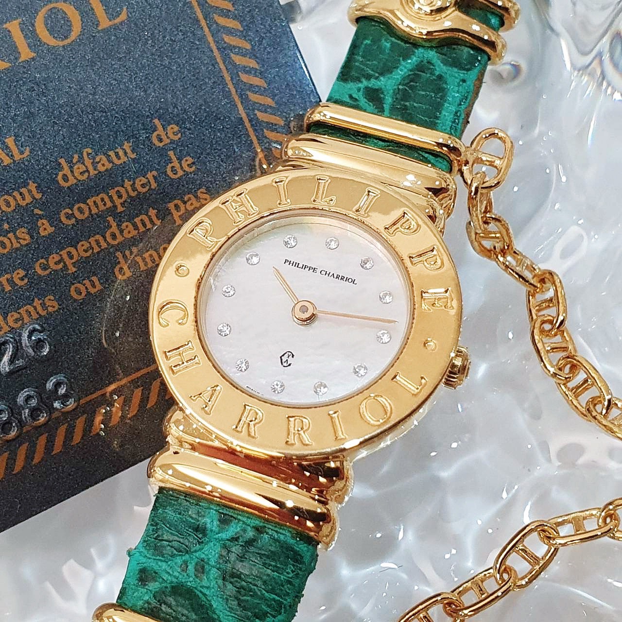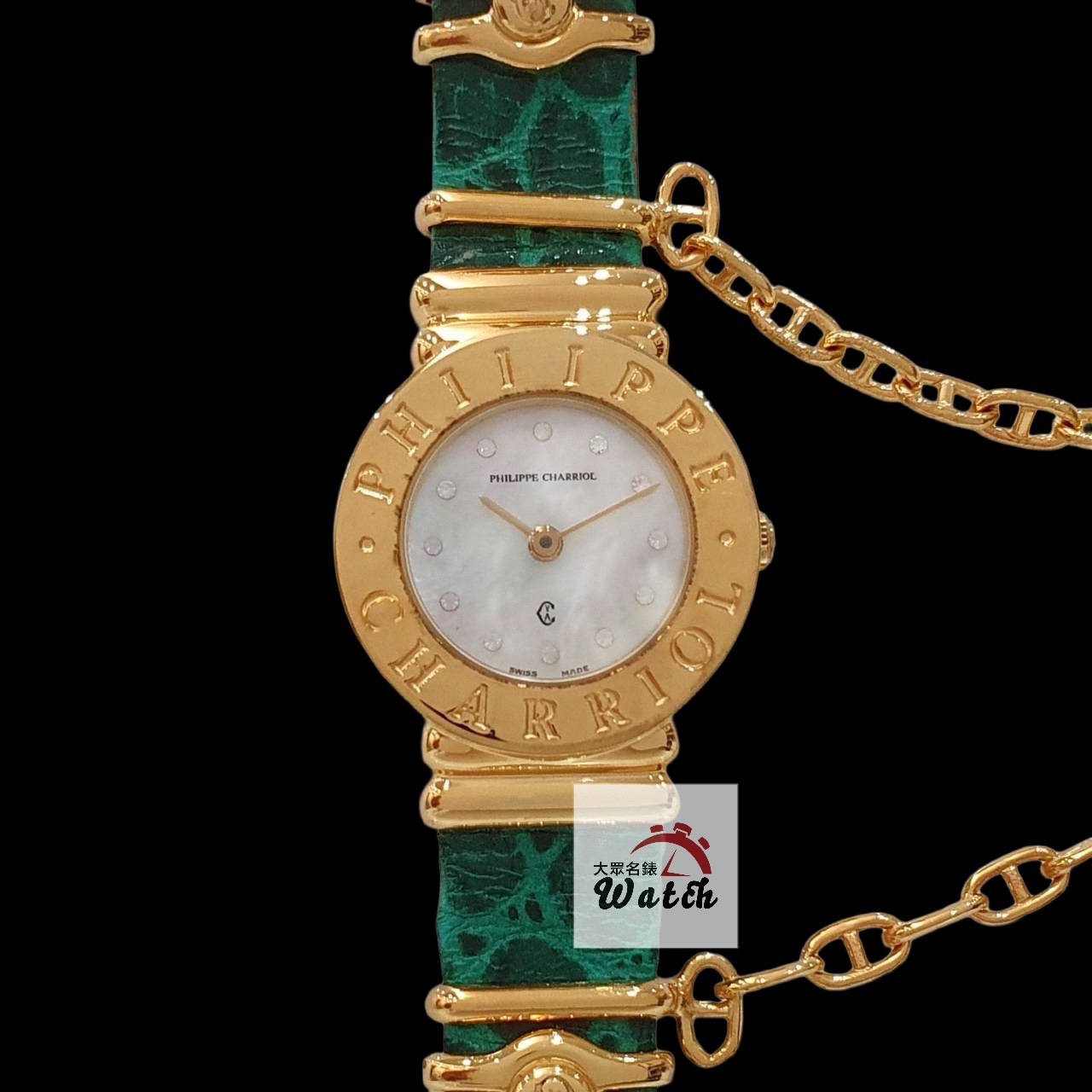 PHILIPPE CHARRIOL 夏利豪 7007901 珍珠貝殼面 鑽石時標 鍍金款 原廠皮帶/錶扣 錶徑24mm 石英機芯 不鏽鋼材質 生活防水 原廠盒單齊全 保養完成