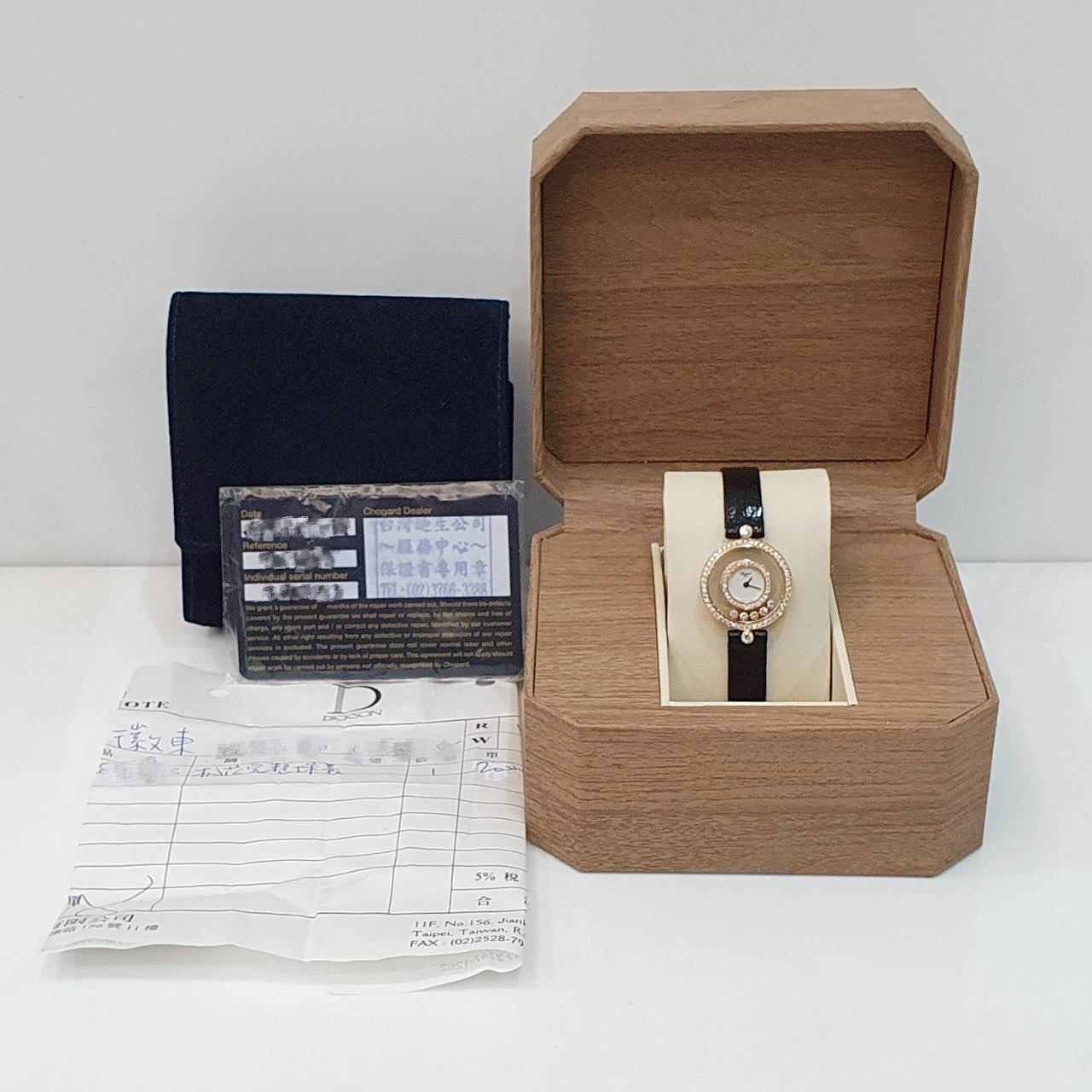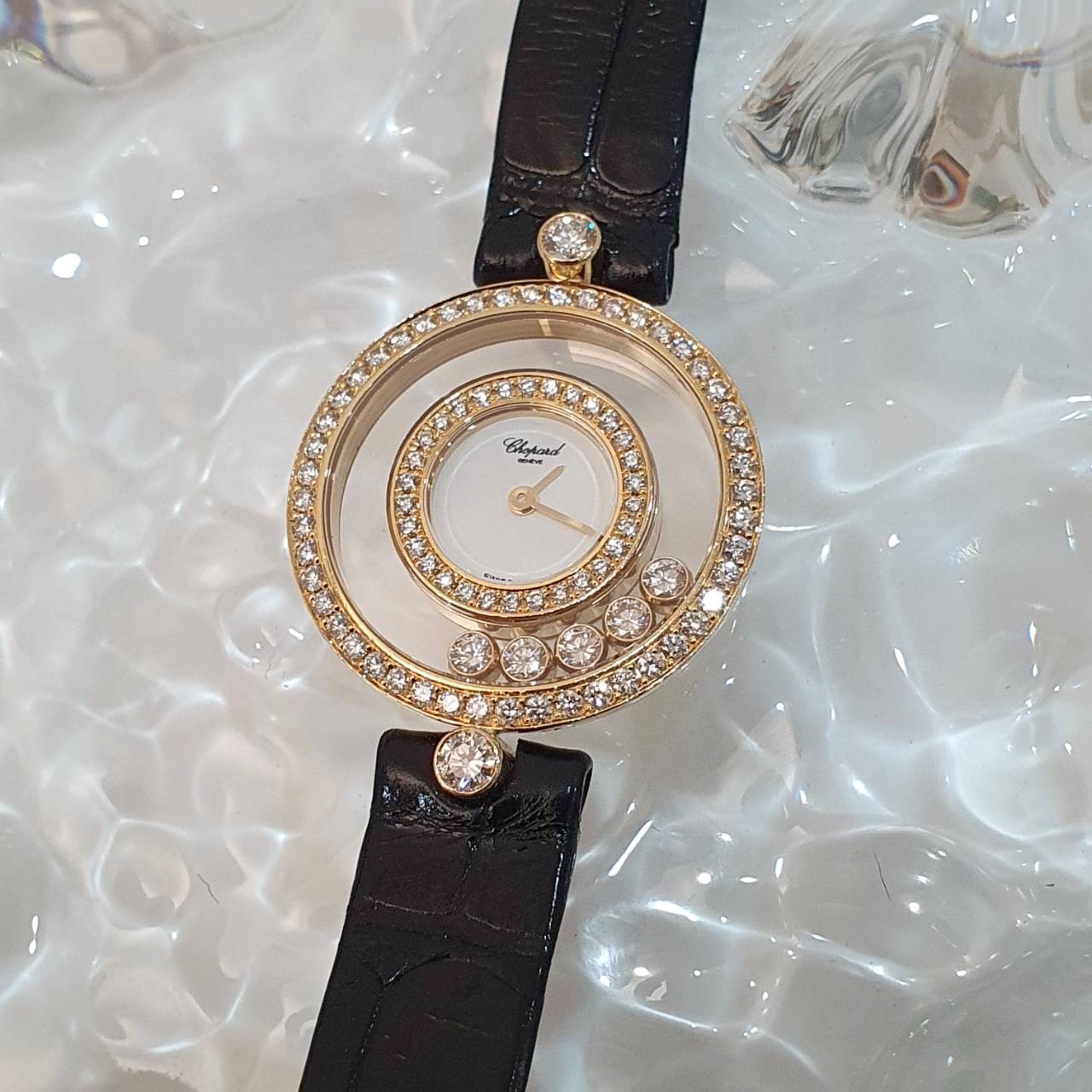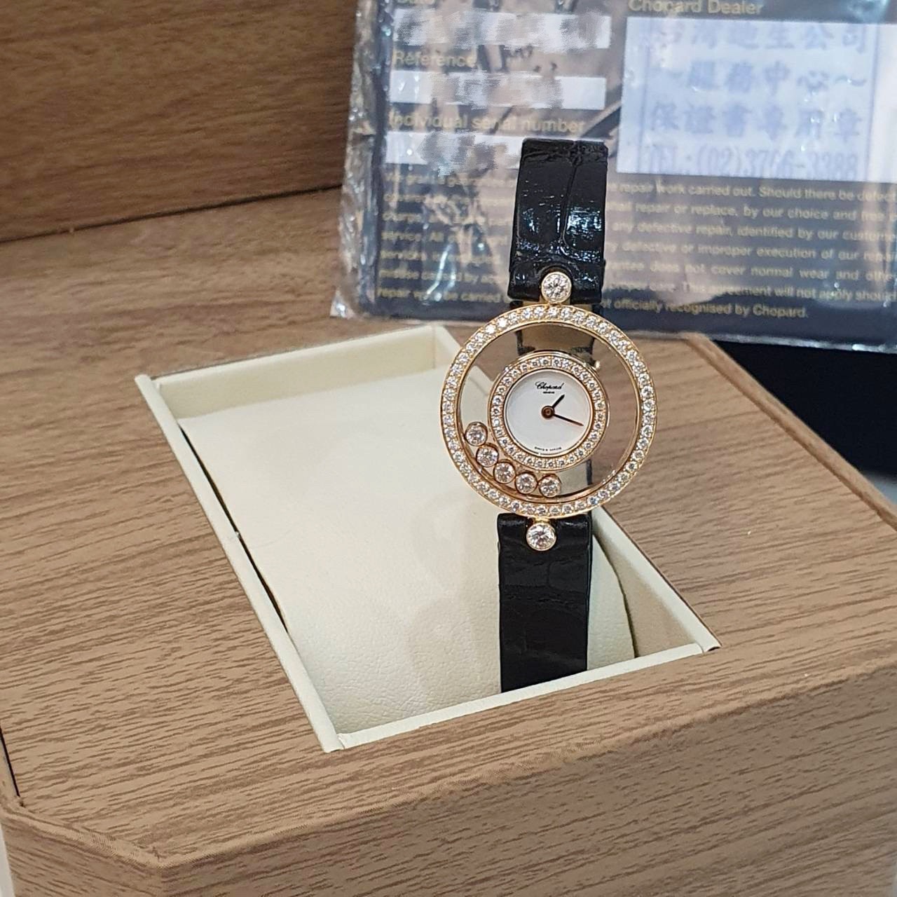 Chopard蕭邦29/3957 Happy Diamonds快樂鑽系列 原廠雙鑽圈 原廠皮帶錶扣 跑5鑽 白瓷面盤 錶徑25mm 石英機芯 18K金材質 生活防水 原廠保卡 精美盒裝 保養完成