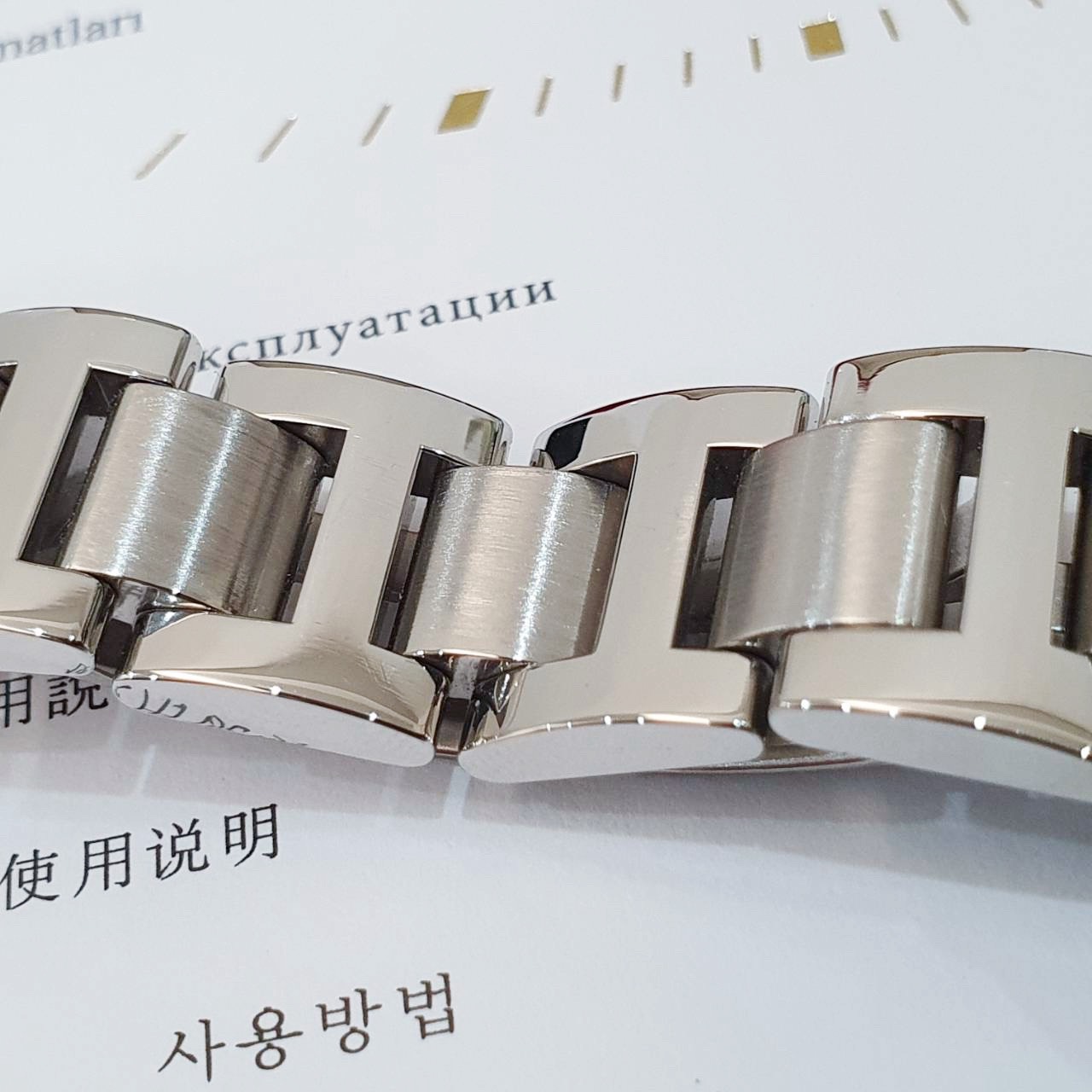 不鏽鋼材質錶、鏈帶、摺疊扣 / 羅馬數字時標 / 凹槽式錶冠鑲嵌一顆凸圓形合成尖晶石 / 鍍銀雕紋錶盤 / 藍鋼劍形指針 / 藍寶石水晶鏡面 |