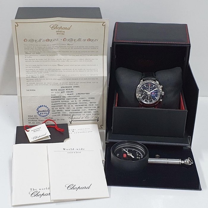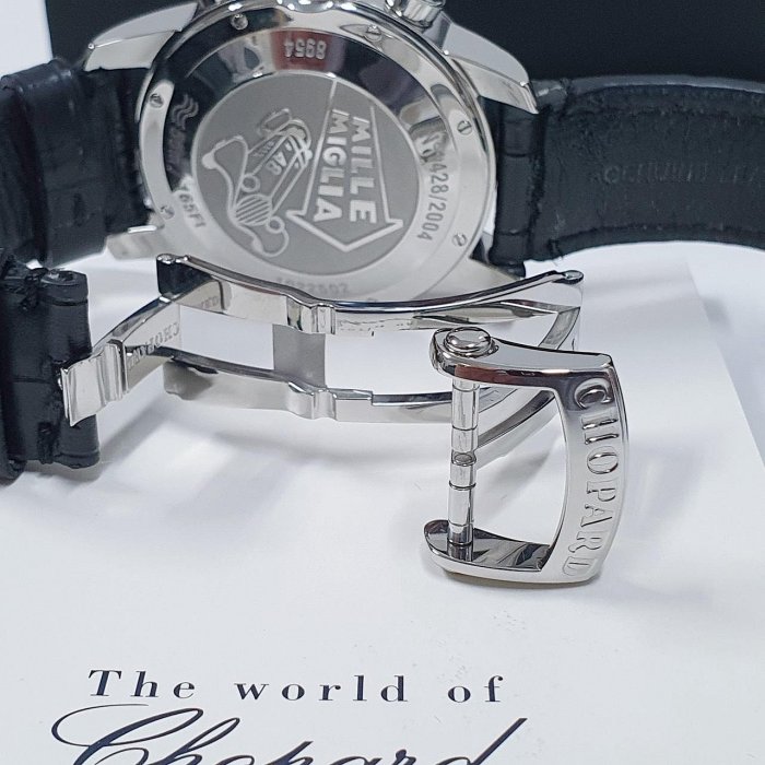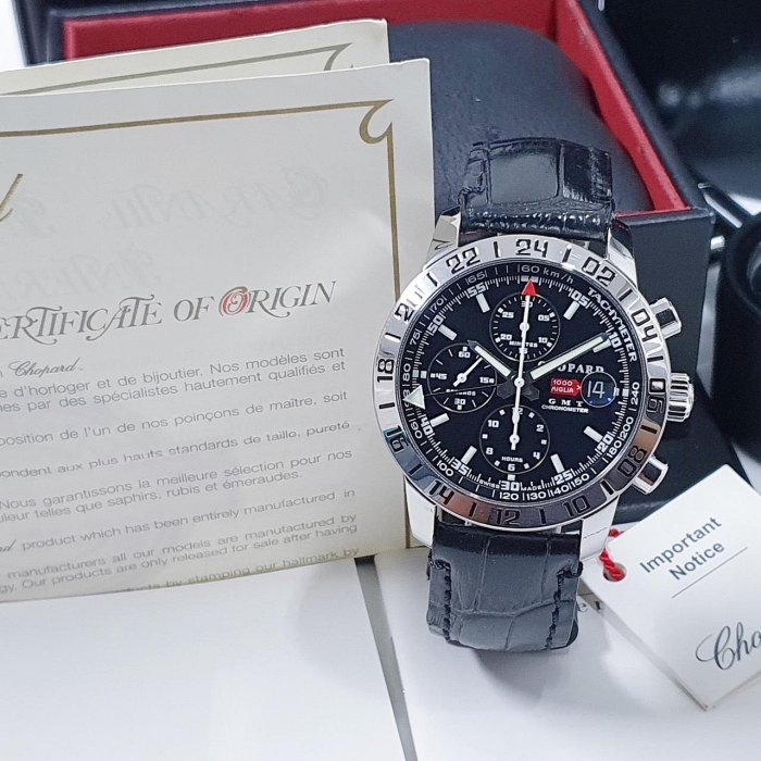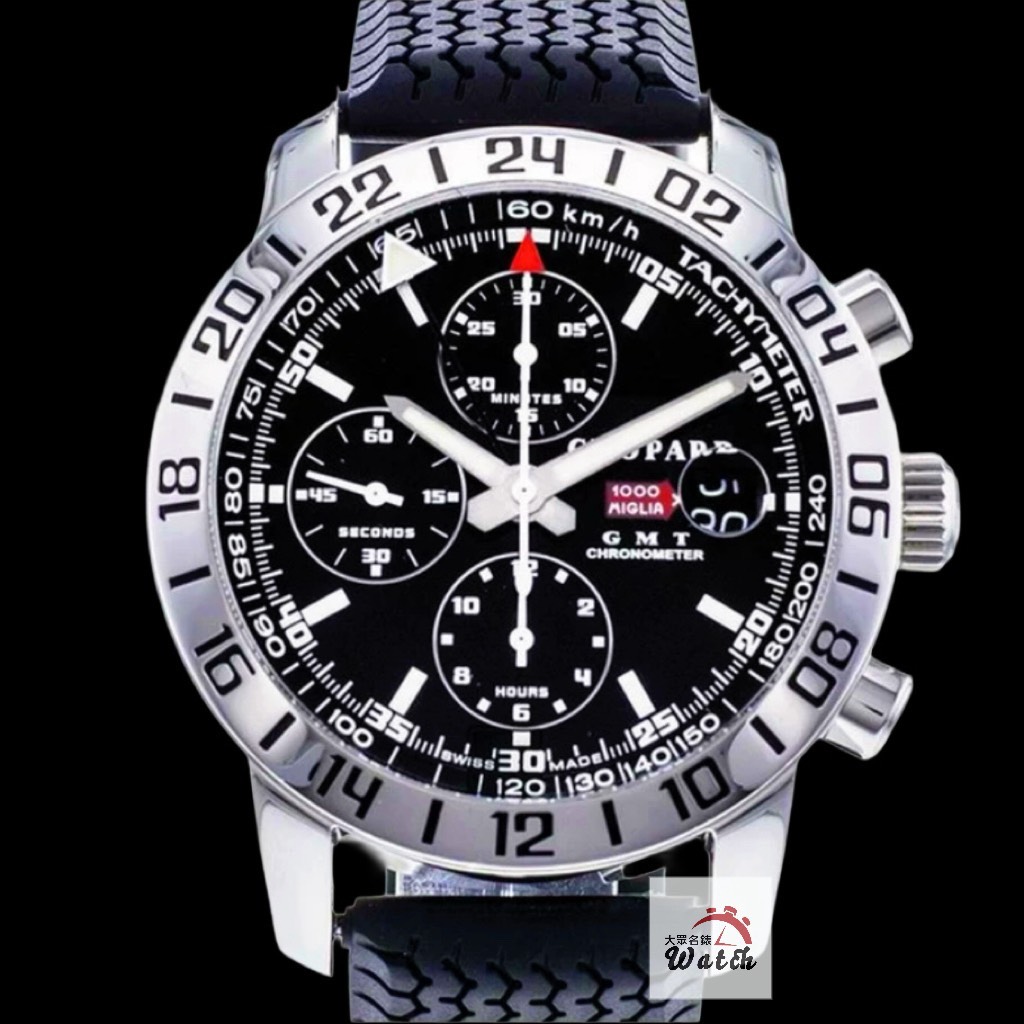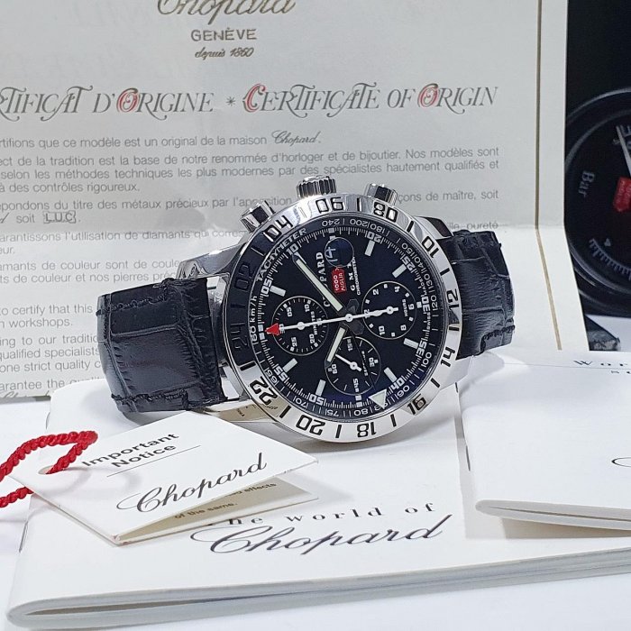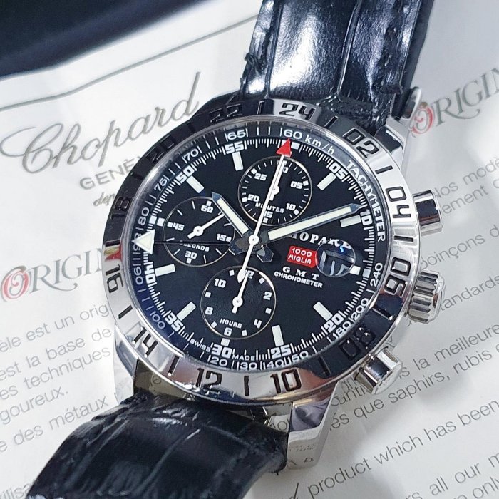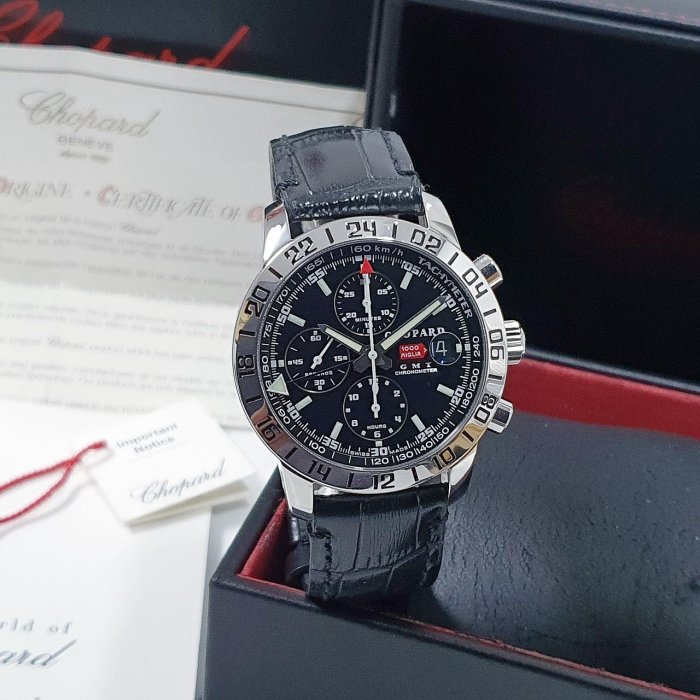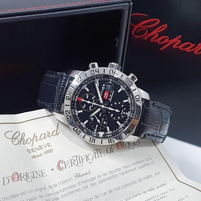 CHPOARD 蕭邦 2006/5 Mille Miglia 賽車面盤 16/8954 黑面GMT 計時碼錶 錶徑42mm 自動上鍊 原廠皮帶扣 防水50米 原廠盒單齊全