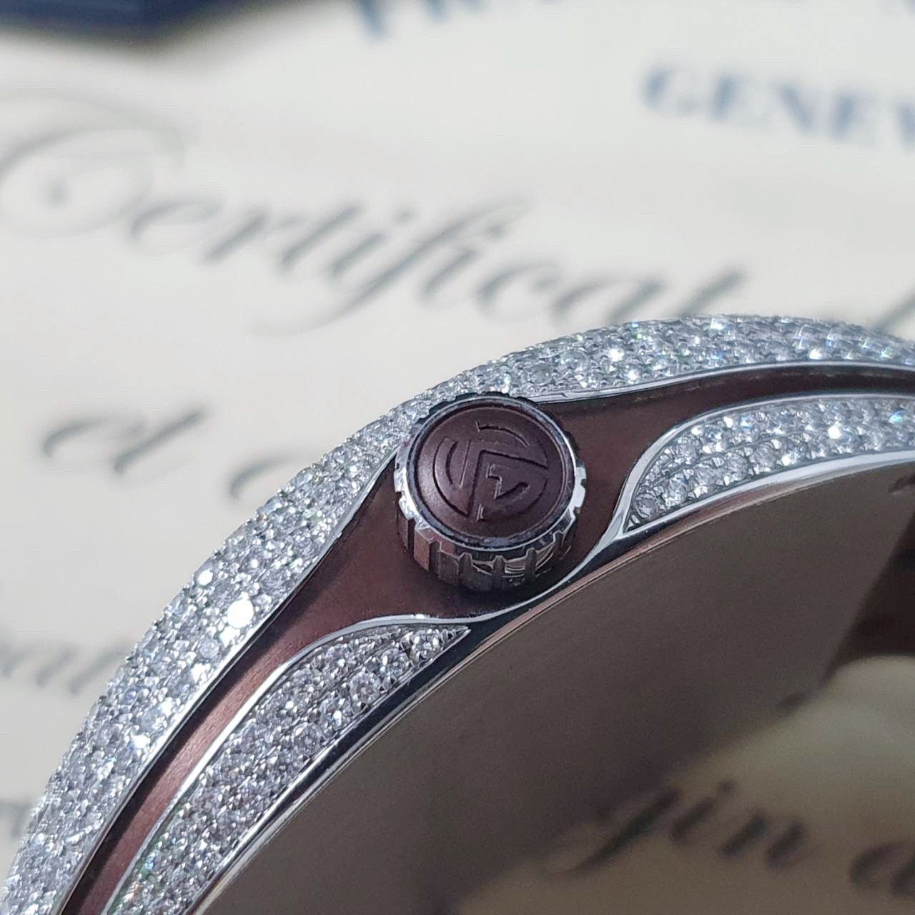 不鏽鋼錶殼、旋入式錶冠 / 精鑲鑽石錶圈 / 夜光指針、立體阿拉伯數字時標 / 原廠棕色皮膠帶 / 藍寶石水晶玻璃鏡面 |