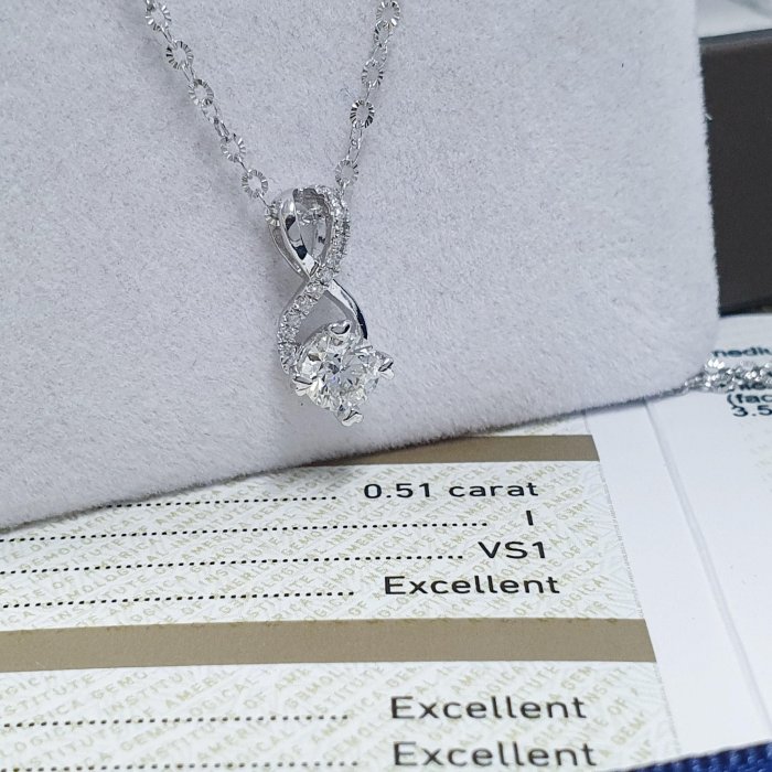 全新品 GIA鑽石項鍊 唯美設計 主鑽51分 I色 VS1 8心8箭3EX完美車工 香港750K金墜台 配鑽約0.08ct 墜1.5x0.7cm 白金項鍊 附GIA證書 精美盒裝