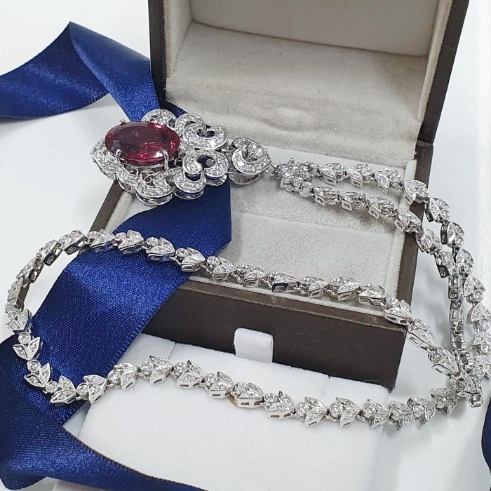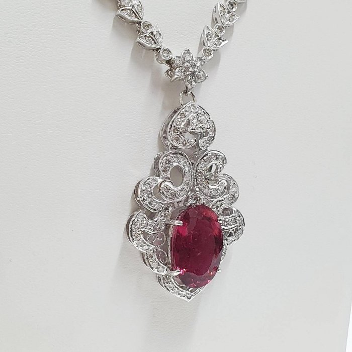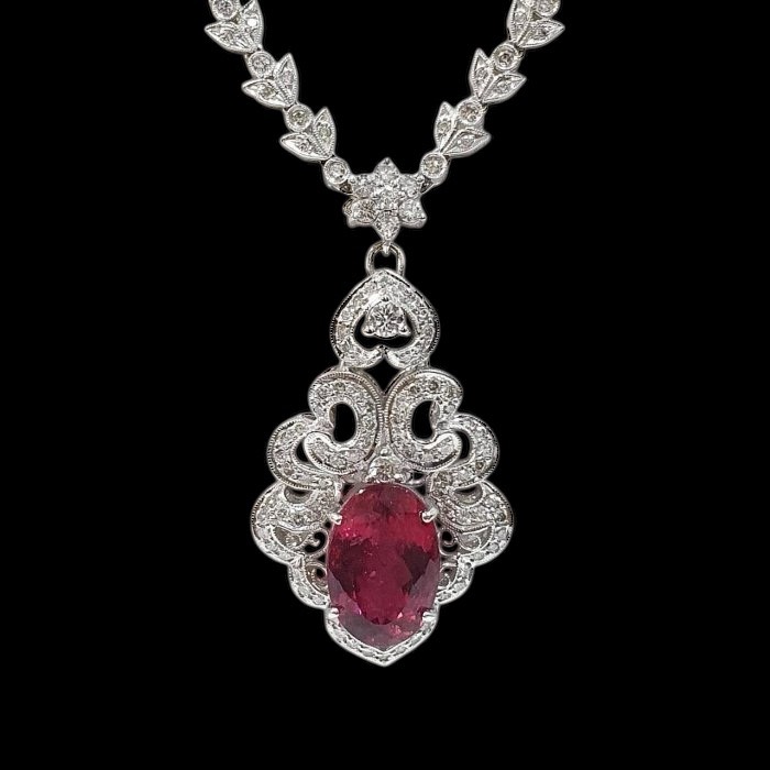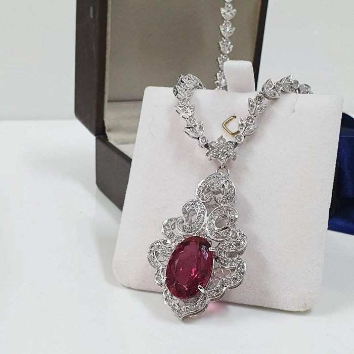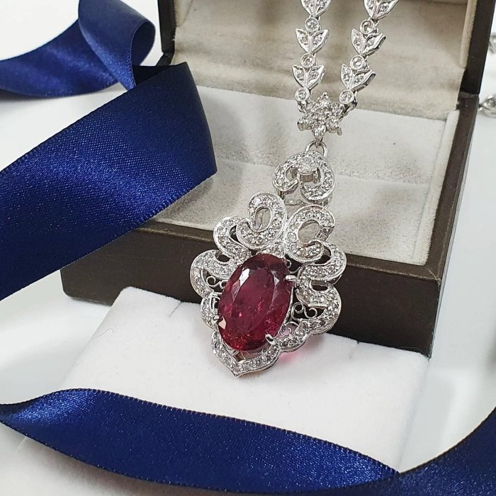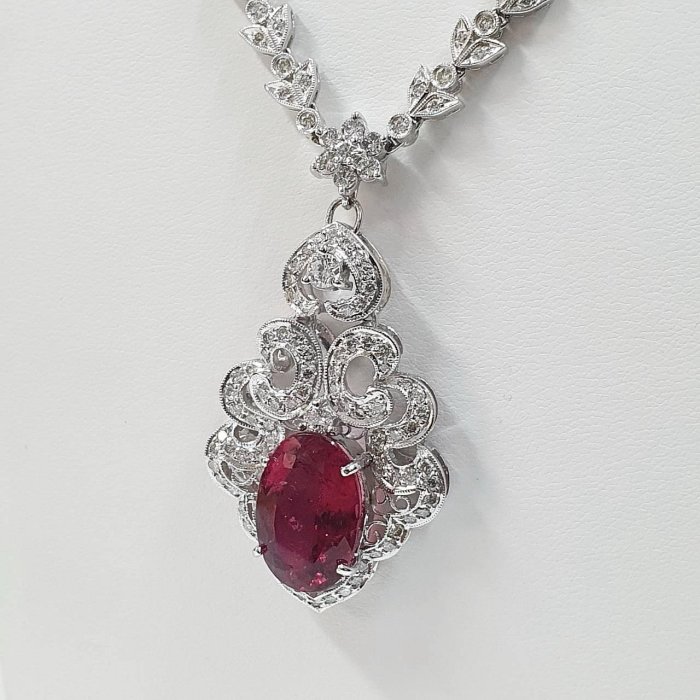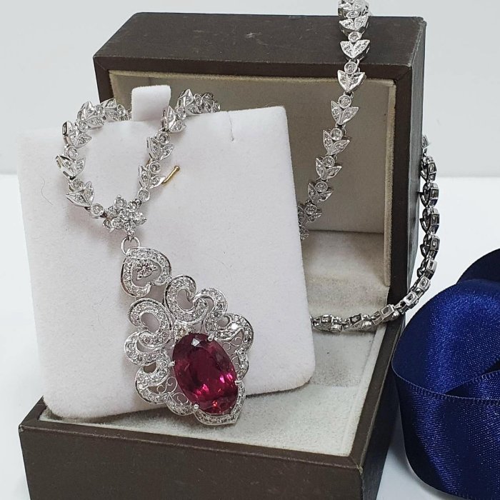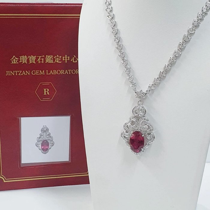 天然紅寶碧璽項鍊 紅寶套鍊 豪華設計款 紅寶碧璽10.92克拉 全鑽鍊 585K金鑽石台 配鑽約6.07ct 墜4.3x2.8cm 鍊長40cm 總重10.67錢 附證書 精美盒裝