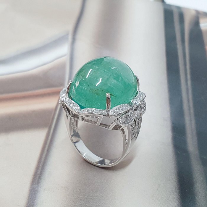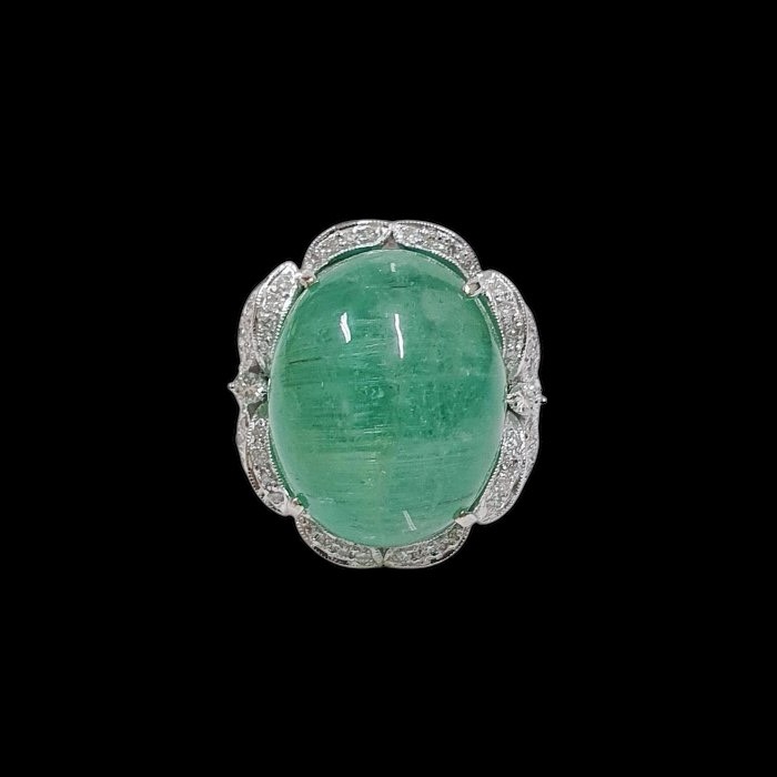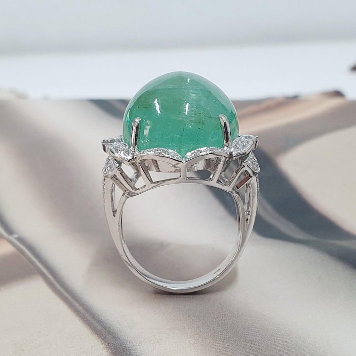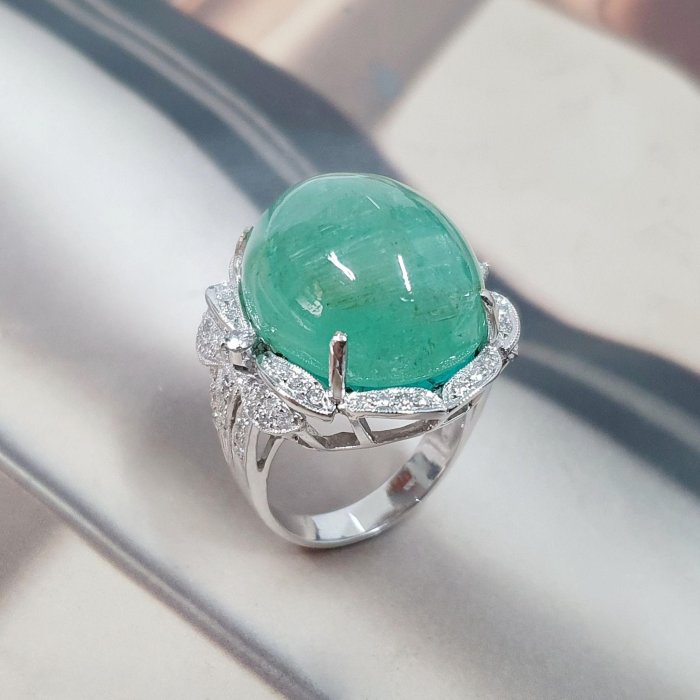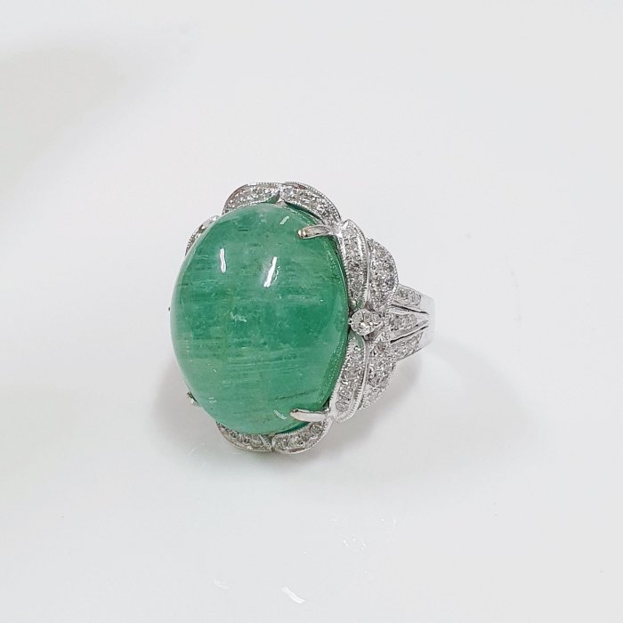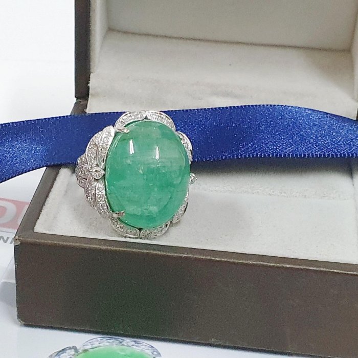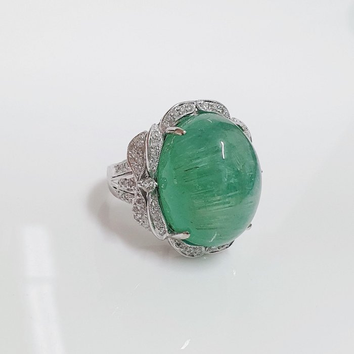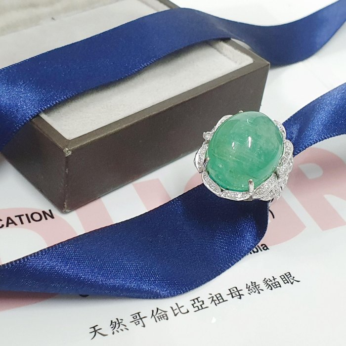 哥倫比亞 天然祖母綠貓眼戒指 祖母綠含台82.52ct 白K金材質 國際圍13號 配鑽約0.65ct 面寬2.55cm 總重4.4錢 精美盒裝 店保卡