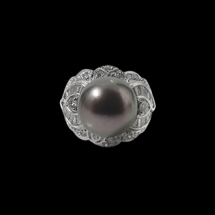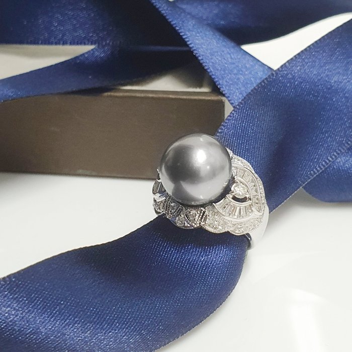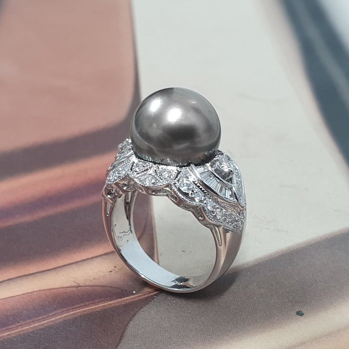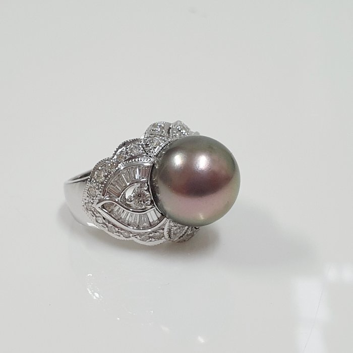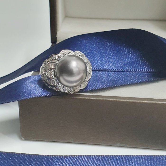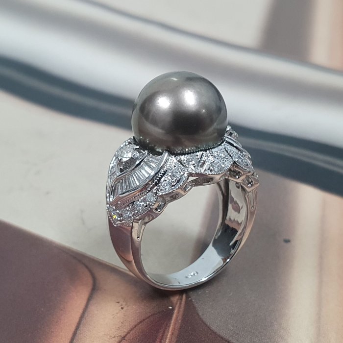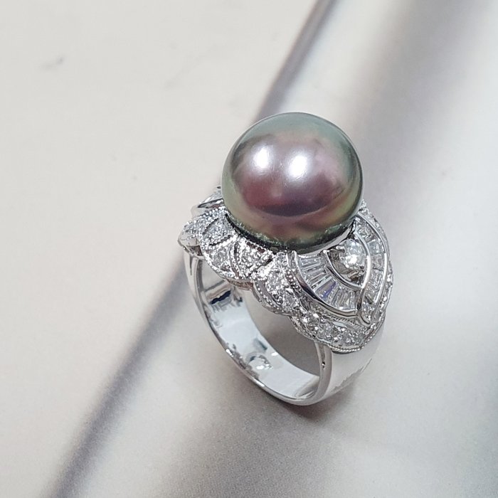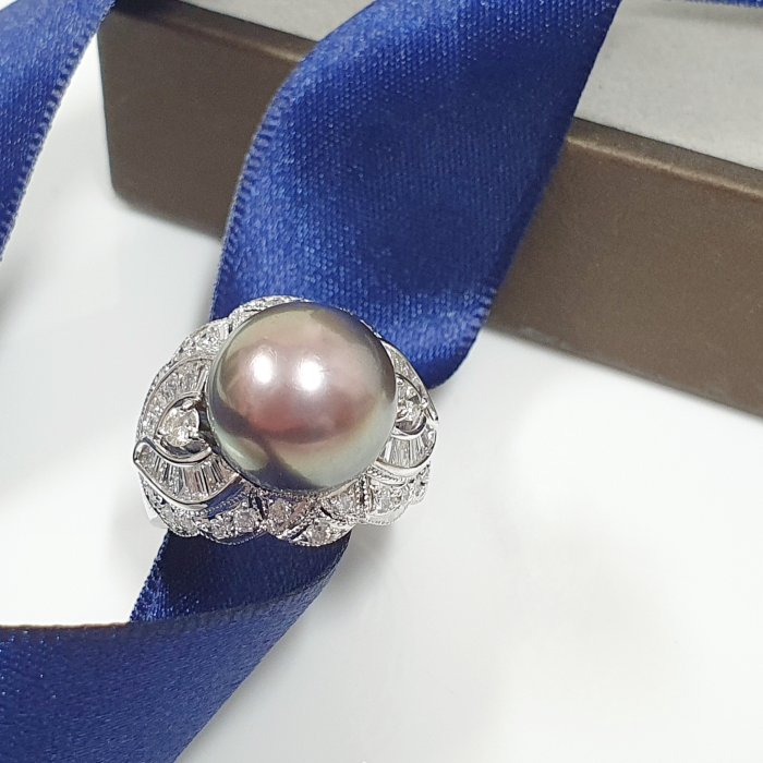 天然南洋珍珠戒指 珍珠12.5mm 珠光亮 帶綠色 750K金戒鑽石戒台 配鑽約0.69ct 國際圍9 面寬1.7cm K金重1.73錢 附店保卡精美盒裝