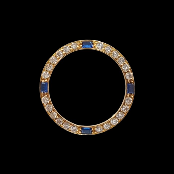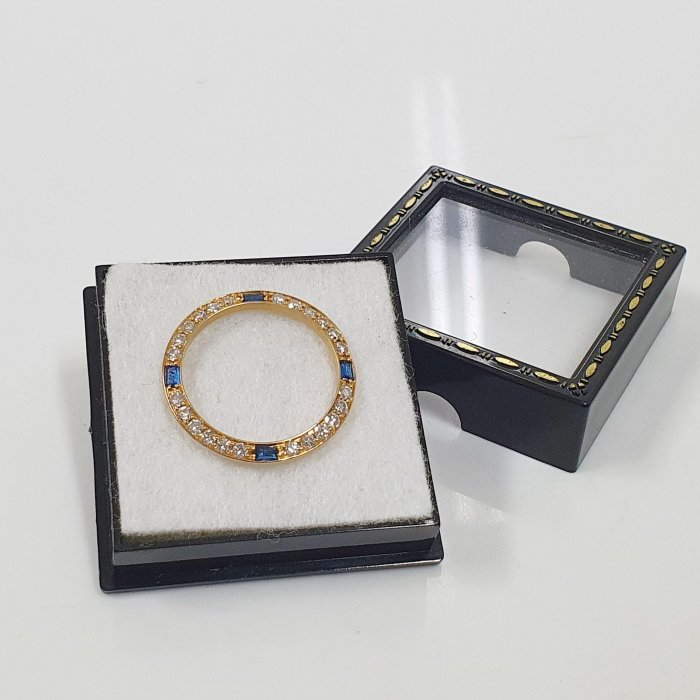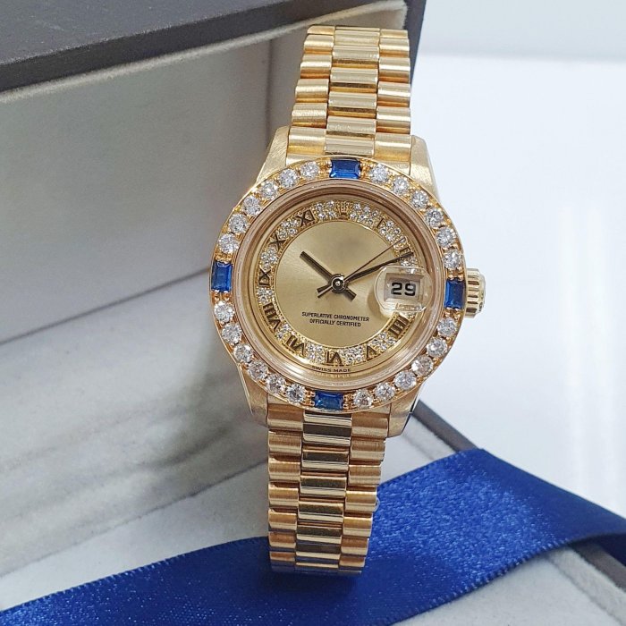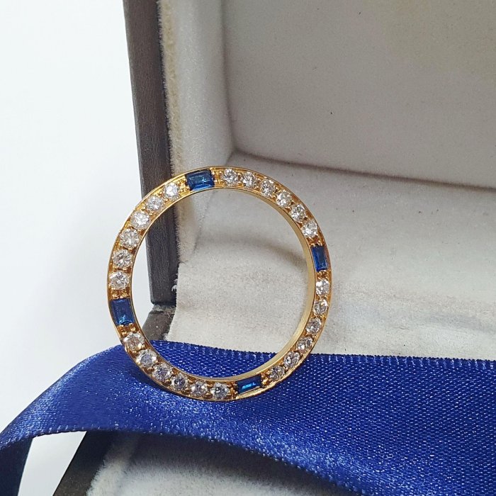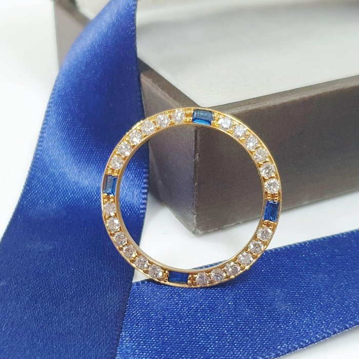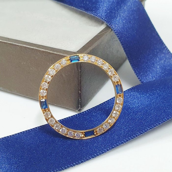 69178 69173 適用女錶26mm 精鑲天然藍寶石鑽圈 鑽石大顆 火光明亮 鑽石共24顆 每顆約3分 共約0.72ct 總重0.78錢 黃K金材質 精美盒裝 店保卡