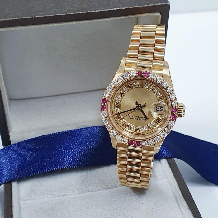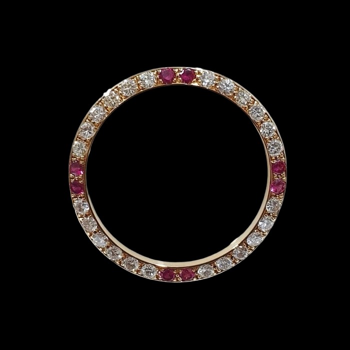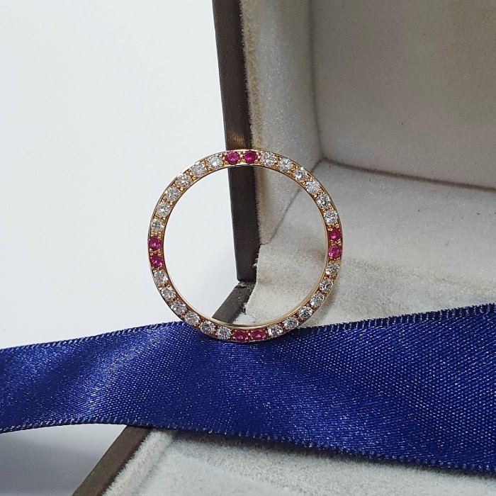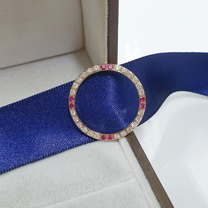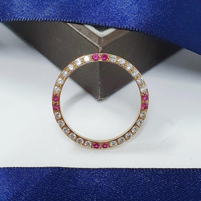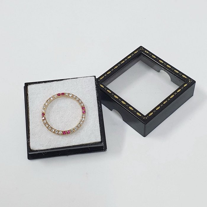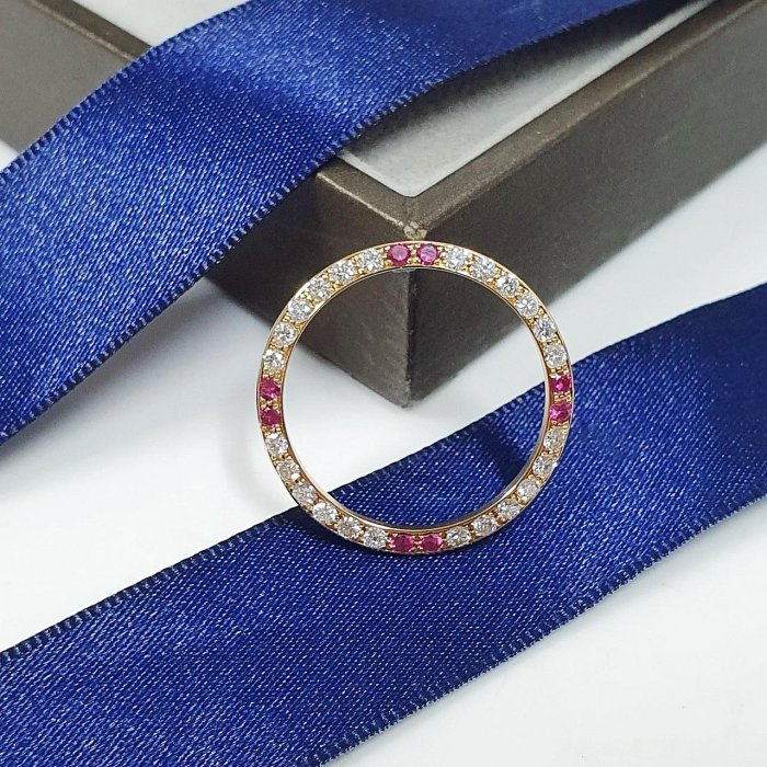 69173 69178 適用26mm 精鑲天然紅寶石鑽圈 大顆鑽 火光閃亮 每顆約3分 24顆共約0.72ct 黃K金材質 總重0.85錢 精美盒裝 店保卡