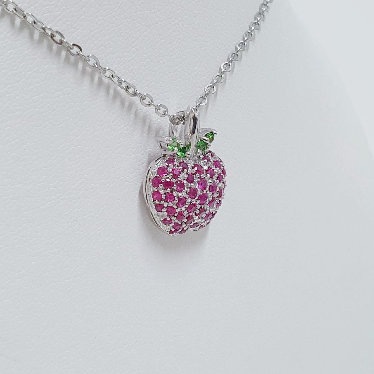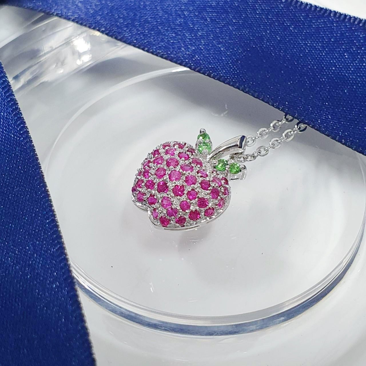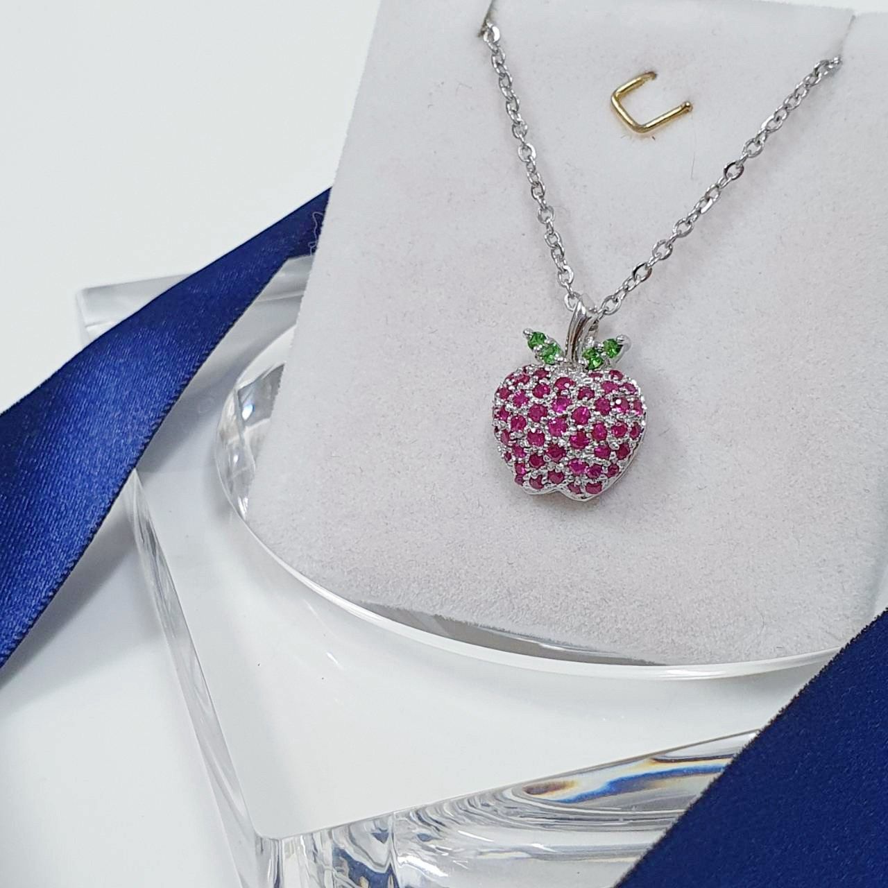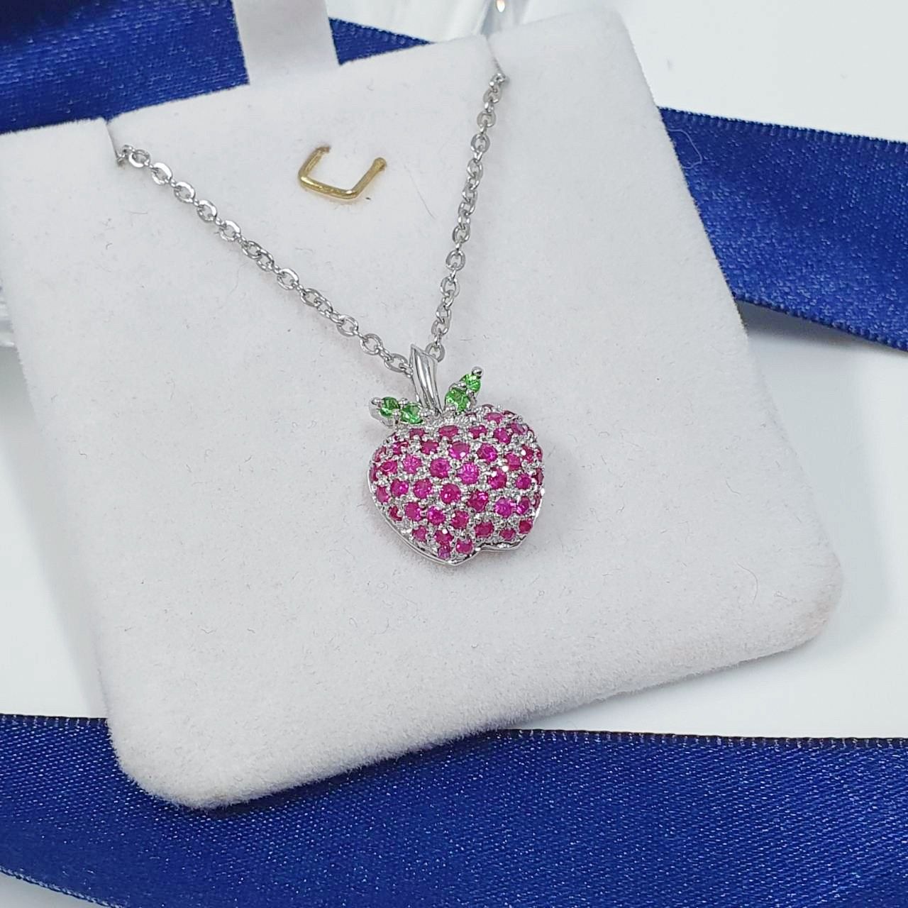 全新品 天然鑽石項鍊 紅寶 蘋果造型 白K金墜台 墜1.8x1.4cm 墜重0.6錢 附鋼鍊 精美盒裝 店保卡