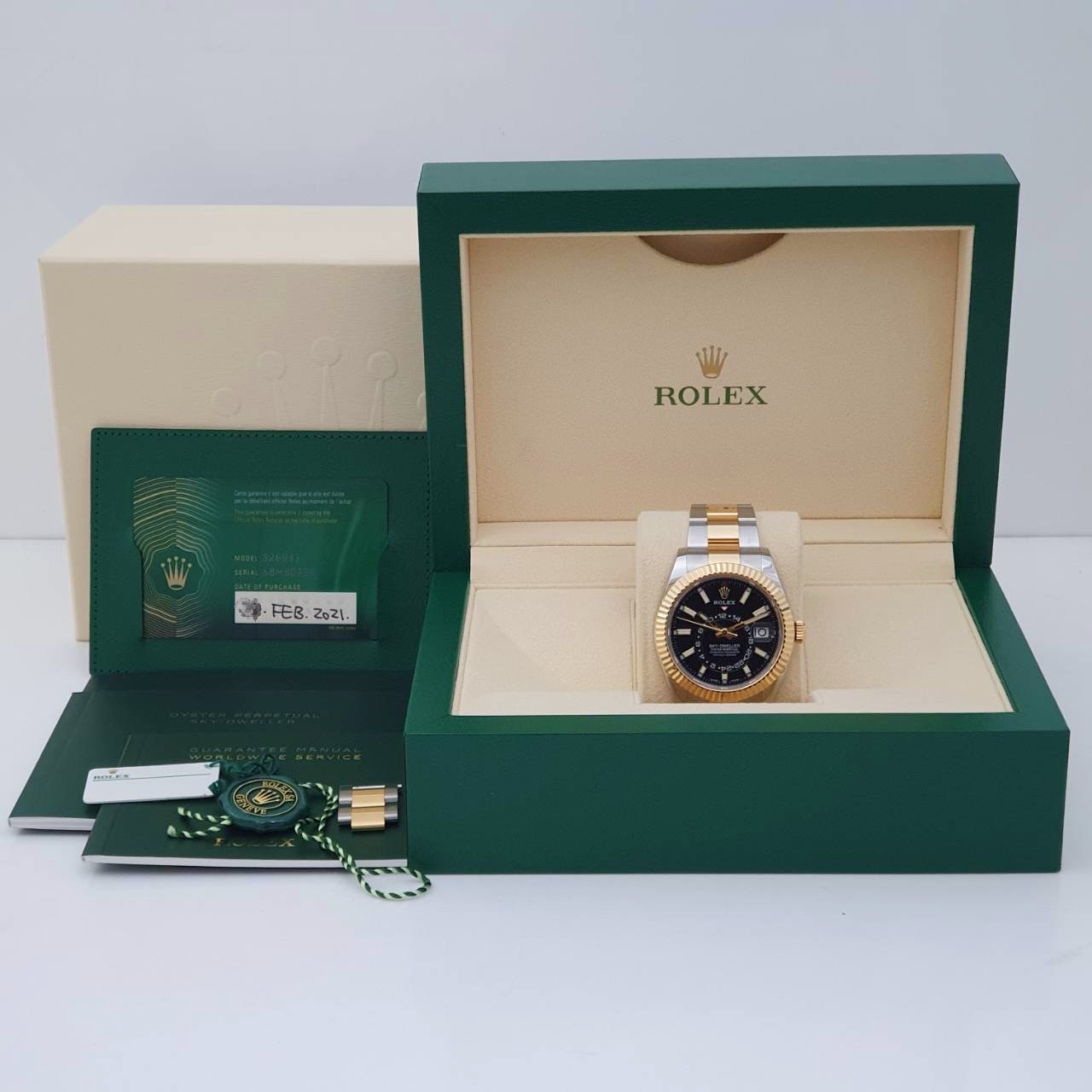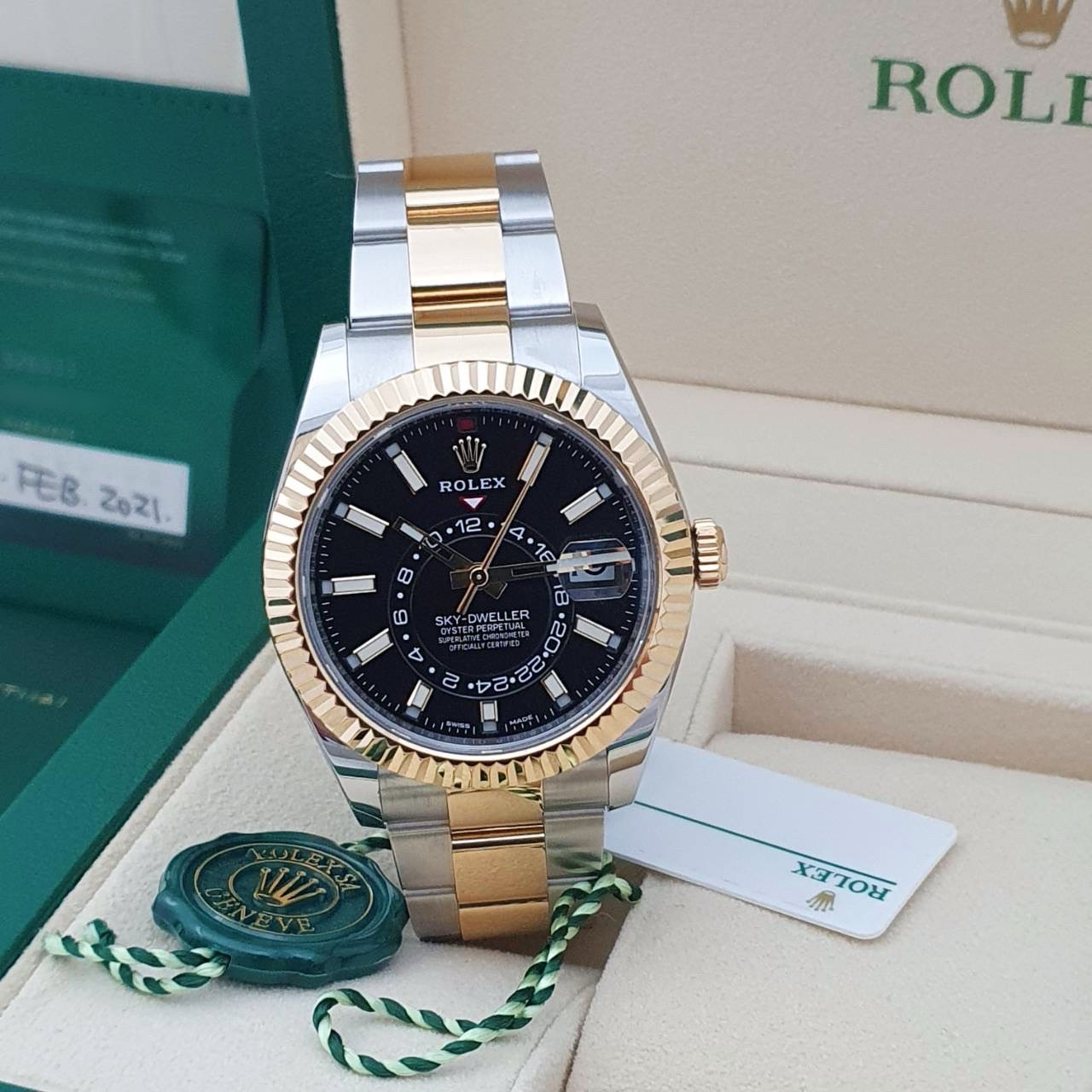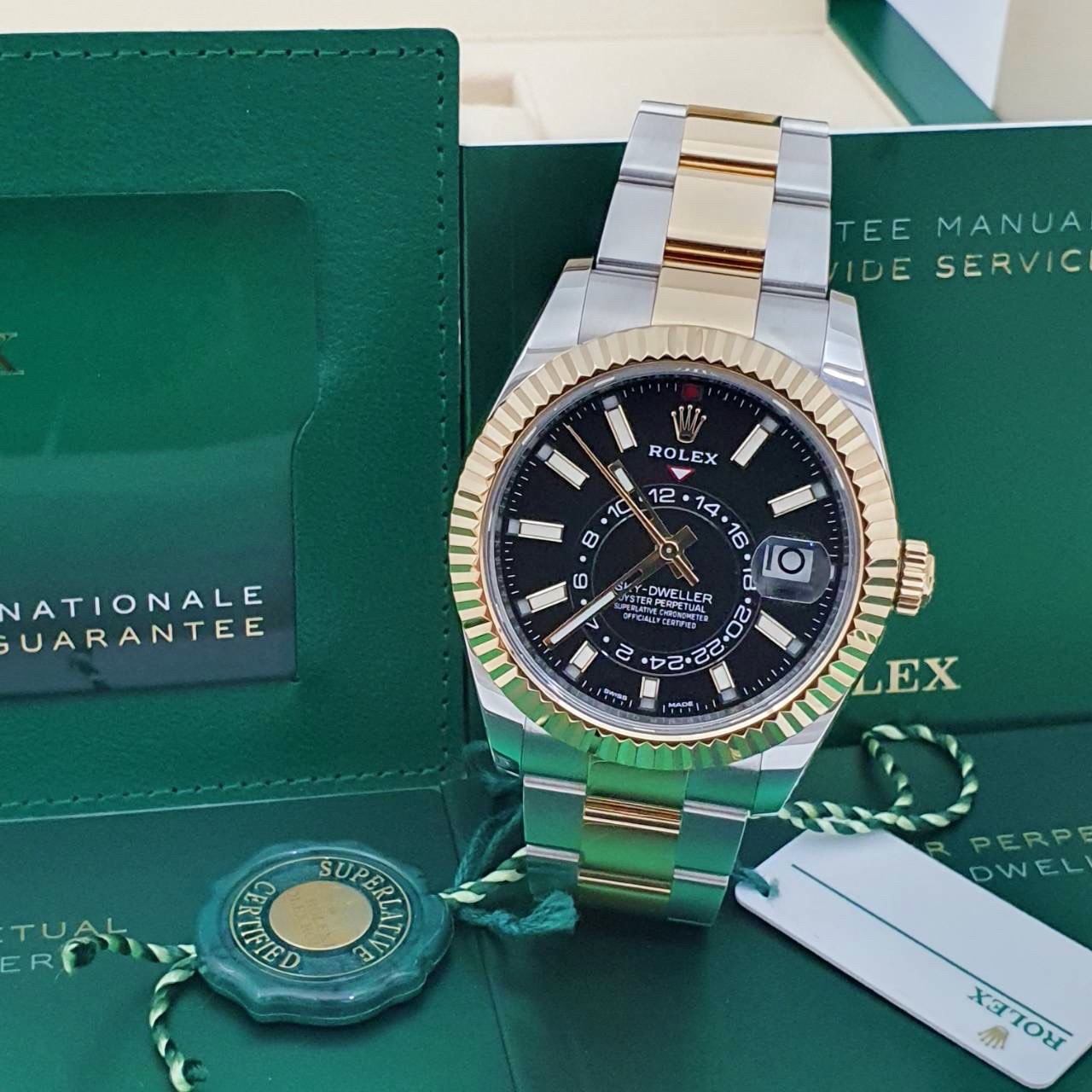 ROLEX 勞力士 326933 Sky-Dweller 天行者 2021/02全配件 半金天行者 黑色面盤 三版帶 年曆功能 月份顯示 兩地時區 錶徑42mm 自動上鍊 18K金及不鏽鋼 防水100米 原廠全配件