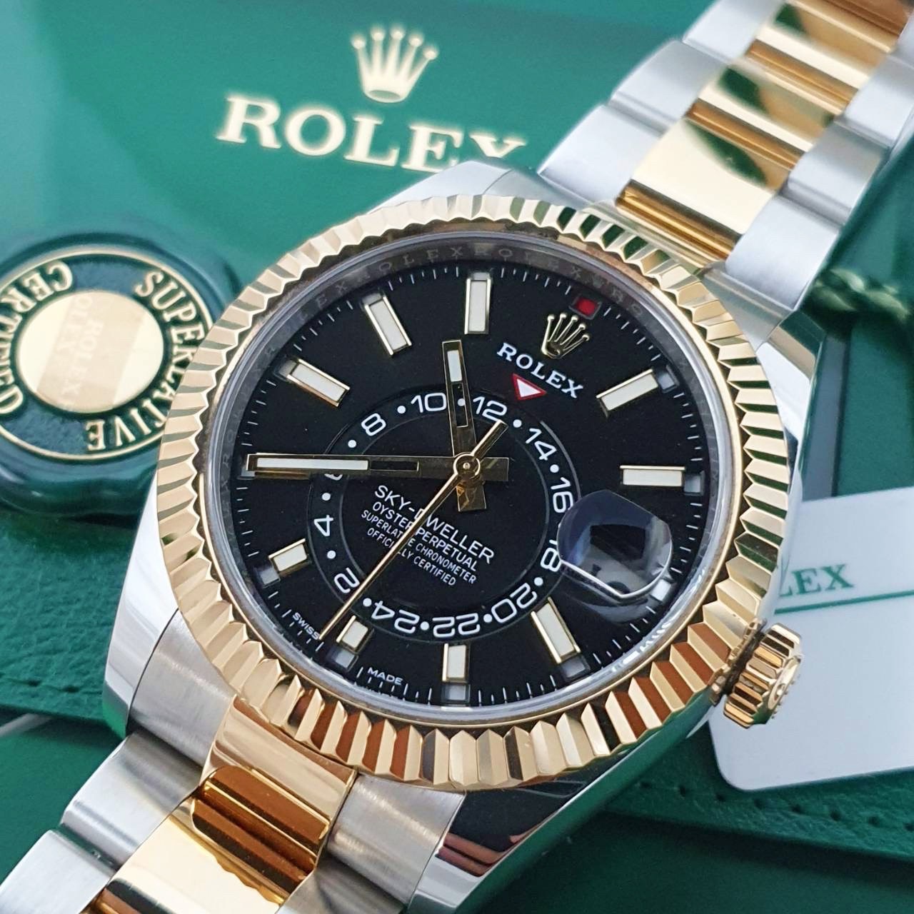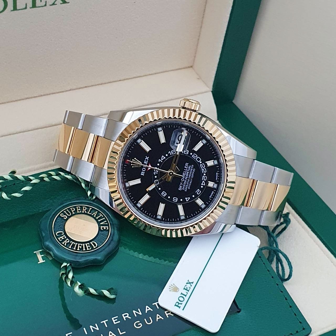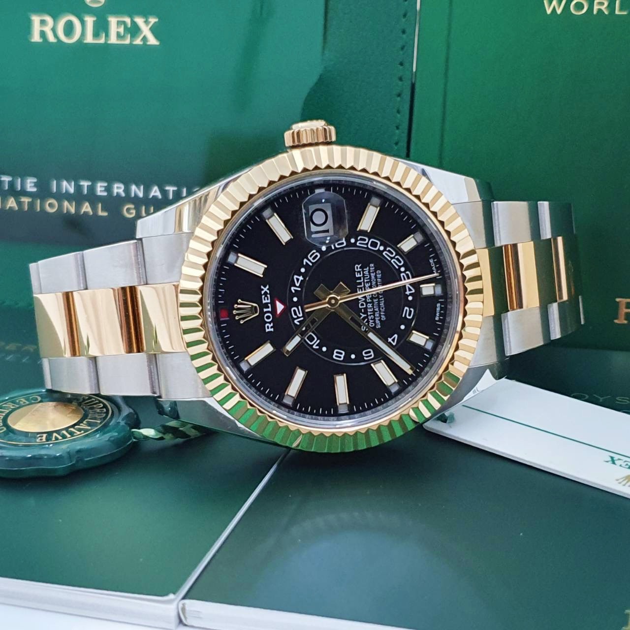 ROLEX 勞力士 326933 Sky-Dweller 天行者 2021/02全配件 半金天行者 黑色面盤 三版帶 年曆功能 月份顯示 兩地時區 錶徑42mm 自動上鍊 18K金及不鏽鋼 防水100米 原廠全配件